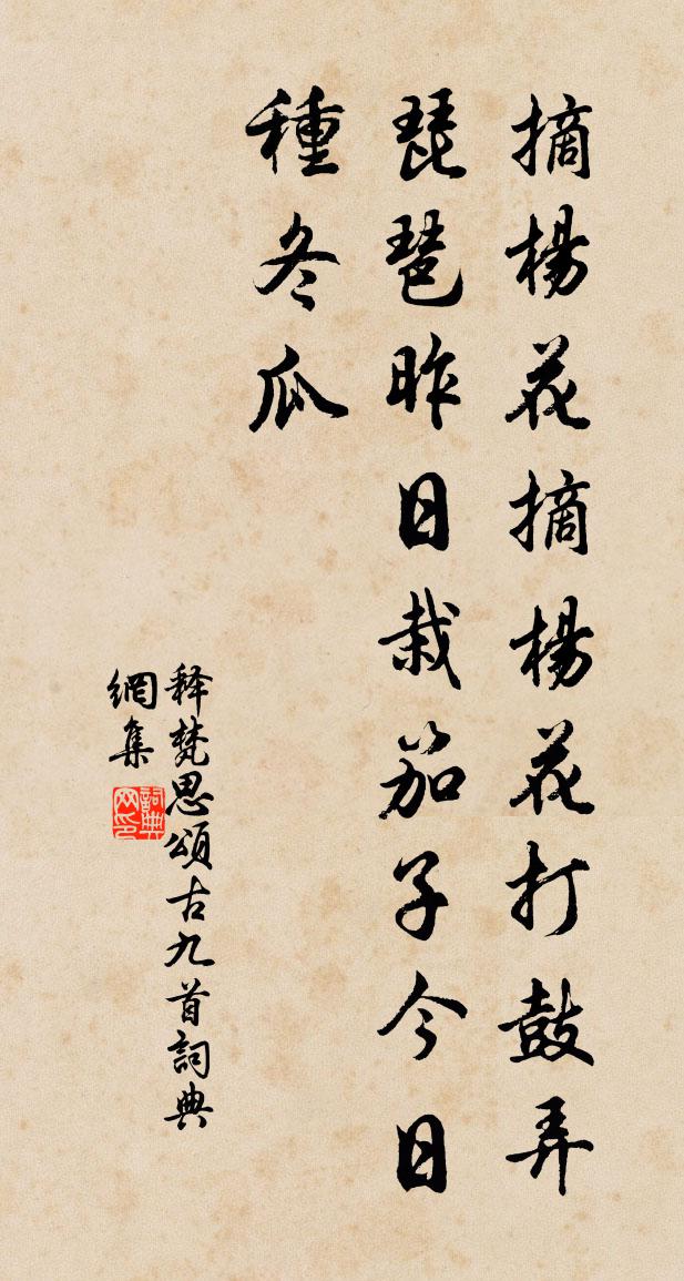 詩詞名句歷史字典書法欣賞書法字典國語詞典說文解字康熙字典古漢語字典標 題 作 者 詩 句 頌古九首作者:釋梵思 朝代:宋代頌古九首原文摘楊花,摘楊花,打鼓弄琵琶。昨日栽笳子,今日種冬瓜。詩詞問答問:頌古九首的作者是誰?答:釋梵思問:頌古九首寫於哪個朝代?答:宋代釋梵思頌古九首書法欣賞頌古九首書法作品詩詞推薦荔枝二首程師孟〔宋代〕水浮蓬島通賓館,日出扶桑照戟門。一等翠林無別水,四邊惟有荔枝園。和元晦贈上封和老張栻〔宋代〕上方元自好,一榻有餘清。只趁晨鐘起,寧聞山鳥聲。高僧足幽事,野客富詩情。試問峰頭景,今朝作麽生。游靜真觀釋圓悟〔宋代〕古觀門幽寂,來游亦夙緣。林堪巢老鶴,壇可禮真仙。秋晚寒生屋,雨深苔印磚。舊藏多御賜,應識尚留傳。玉芝歌陸九淵〔宋代〕靈華兮英英,芝質兮蘭形。瓊葩兮瑤實,冰葉兮雪莖。石室兮宛宛,苔茵兮菁菁。陰長松之偃蹇,帶飛瀑之琮琤。滿江紅 又次前韻 搔瓜事見劉向新序劉敏中〔元代〕我笑前人,痴絕甚、搔瓜鑽李。天壤內、神奇腐朽,有所窮已。才見凌風霄漢上,忽看垂翅蓬蒿底。試閒將、得失過洛陽城於鄴〔唐代〕古來利與名,俱在洛陽城。九陌鼓初起,萬車輪已行。周秦時幾變,伊洛水猶清。二月中橋路,鳥啼春草生。偈頌二十一首釋普寧〔宋代〕一陽來復,暖回幽谷。雲黃山上,喜氣浮空。繡水溪頭,疏影含玉。老胡不會轉身句,無節目中生節目。累及拄杖偈頌十九首釋紹曇〔宋代〕不業農商不業儒,菑田弗下寸根株。驢年斫倒菩提樹,羞見新州個老盧。半江遇風濤其勢危甚晚示同舟趙蕃〔宋代〕言歸固多欣,值險輒大怖。方趨順風捷,忽與奔濤遇。得非蛟龍爭,無乃雷霆怒。我舟僅如掌,我命且如縷。何止夜坐讀書有感示兒侄趙蕃〔宋代〕老矣讀書如欠緣,心非敢後足難前。切磋有道方成器,穮蔉無功敢望年。搔抑空憐發種種,摩挲仍愧腹便便。吾家和張政仲見寄三絕劉學箕〔宋代〕故人別去復一月,三絕詩章寄我來。我有青州四從事,已令挈至待君開。早行五首吳芾〔宋代〕跋涉州塗僅八旬,今朝才得次安仁。更須五日為行客,方得開藩見吏民。奉詔止雨宿齋建隆觀宋庠〔宋代〕漢家候神館,奉詔穰沈災。解纓就齋幕,恍若躋蓬萊。雲羅絓朝舄,露掌承仙杯。眾真拱象帝,寶宇正崔嵬。爐煙題永泰顯上人箇中庵滕岑〔宋代〕葛藤遍諸方,悟老能幾個。誰知箇中庵,爐火但趺坐。齋缽幸不空。 * 常自磨。飢餐困來眠,工夫沒量大。程公明家玉蕊花仇遠〔宋代〕招隱山中有此花,仙人曾住七香車。可憐一架開如雪,冷落西門處士家。臨江仙(代內)晁補之〔宋代〕馬上匆匆聽鵲喜,朦朧月淡黃昏。碧羅雙扇擁朝雲。粉光先辨臉,朱色怎分唇。暫別寶奩蛛網遍,春風淚污榴裙。朝中措張掄〔宋代〕松江西畔水連空。霜葉舞丹楓。謾道金章清貴,何如蓑笠從容。有時獨醉,無人系纜,一任斜風。不是蘆花惹住,減字木蘭花 吳江夜泊邵亨貞〔元代〕江頭日暮。客子移舟迷去路。望斷天涯。燈火深村賣酒家。銅*巷陌。荒*寒鴉煙樹隔。往事無情。舊夢依然到五帝子歌李賀〔唐代〕洞庭明月一千里,涼風雁啼天在水。九節菖蒲石上死,湘神彈琴迎帝子。山頭老桂吹古香,雌龍怨吟寒水光。沙浦歐陽伯和仲純輓詞二首蘇轍〔宋代〕仲氏氣無前,為文思湧泉。飄然落筆地,時出疾邪篇。杶乾要經雪,驊騮行著鞭。淒涼悲故客,不及見華顛。名句推薦四月十七,正是去年今日,別君時。韋莊《女冠子·四月十七》 誤用聰明,何若一生守拙王永彬《圍爐夜話·第四一則》 燕歸花謝,早因循、又過清明。納蘭性德《紅窗月·燕歸花謝》 非君子不可與語變。王通《中說·卷七·述史篇》 待浮花、浪蕊都盡,伴君幽獨。蘇軾《賀新郎·夏景》 冰泮寒塘水綠,雨余百草皆生。韋應物《三台》 按其實而審其名,以求其情;聽其言而察其類,無使方悖。呂不韋《呂氏春秋·覽·審分覽》 三杯通大道,一醉解千愁。佚名《增廣賢文·上集》 相思無因見,悵望涼風前。李白《折荷有贈》 蠟燭有心還惜別,替人垂淚到天明。杜牧《贈別》