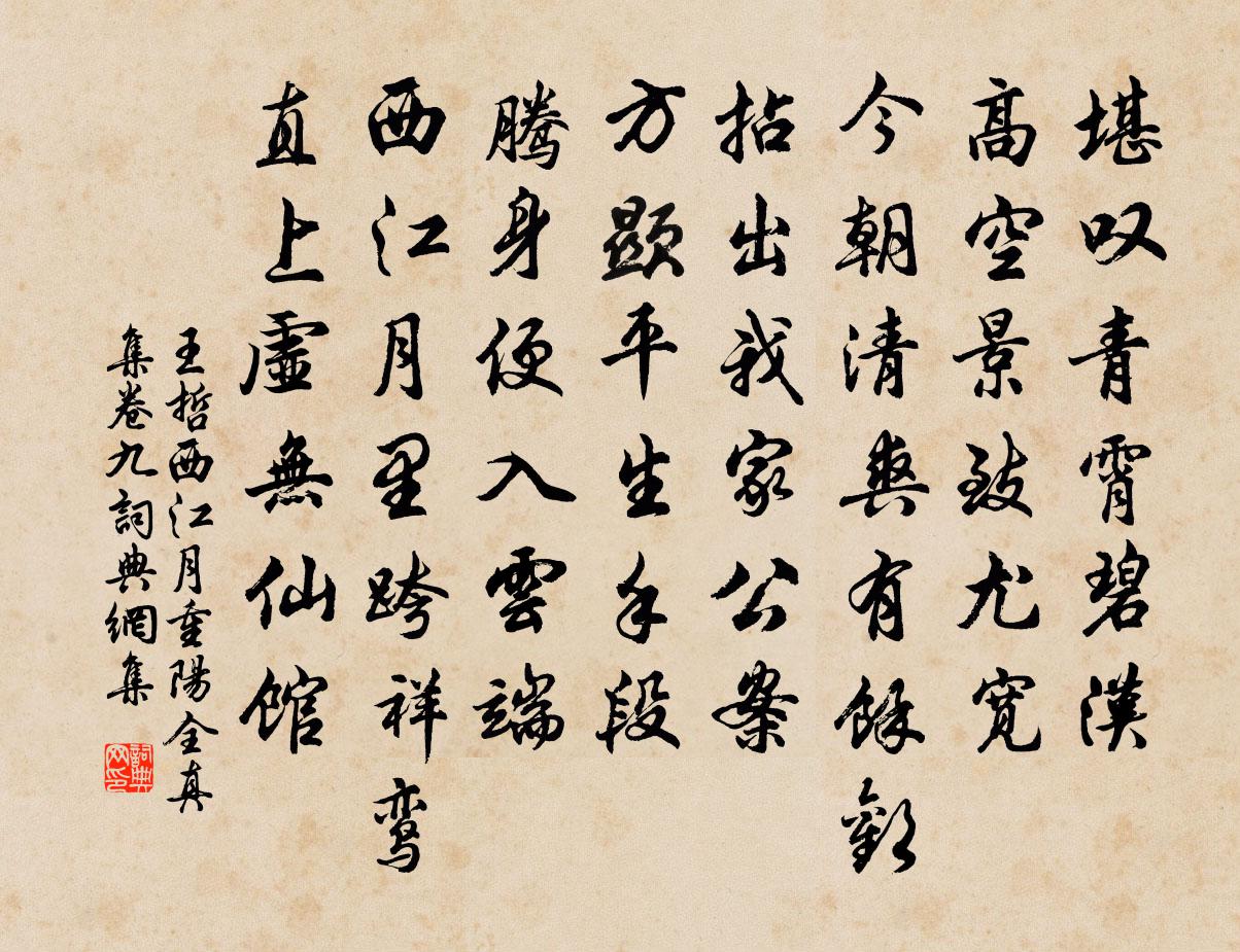 詩詞名句歷史字典書法欣賞書法字典國語詞典說文解字康熙字典古漢語字典標 題 作 者 詩 句 西江月 重陽全真集卷九作者:王哲 朝代:元代西江月 重陽全真集卷九原文堪嘆青霄碧漢。高空景致尤寬。今朝清爽有餘歡。拈出我家公案。方顯平生手段。騰身便入雲端。西江月里跨祥鸞。直上虛無仙館。詩詞問答問:西江月 重陽全真集卷九的作者是誰?答:王哲問:西江月 重陽全真集卷九寫於哪個朝代?答:元代問:西江月 重陽全真集卷九是什麼體裁?答:詞王哲西江月 重陽全真集卷九書法欣賞西江月 重陽全真集卷九書法作品詩詞推薦村舍燕杜牧〔唐代〕漢宮一百四十五,多下珠簾閉瑣窗。何處營巢夏將半,茅檐煙里語雙雙。消憂舒岳祥〔宋代〕鳳棲塘上路,春草思悠悠。綠樹雙黃鳥,青山一白頭。詩書自有厄,盜賊本非仇。天道知難問,吾貧不肯憂。寄臨海郡崔稚璋權德輿〔唐代〕美酒步兵廚,古人嘗宦遊。赤城臨海嶠,君子今督郵。吏隱豐暇日,琴壺共冥搜。新詩寒玉韻,曠思孤雲秋。志士往復無間釋重顯〔宋代〕平旦寅,眹兆之前已喪真。老胡鶴樹慚開□,猶舉雙趺誑後人。感古十首胡仲弓〔宋代〕卞氏璧難售,淵明琴本瘖。自衒亦可醜,三獻機轉深。無弦避俚耳,舉世誰知音。所以古達士,萬事何容心。勿學天台邵明府履病況遺牡丹各賦一絕林表民〔宋代〕人間興廢手搏沙,喬木猶存少故家。不見石邊題甲乙,空科姓氏落名化。榮茂實侍郎餉家釀曾幾〔宋代〕風窗雪屋坐昏晨,一老江湖寂寞濱。解戰充虛惟有酒,絕甘分少不無人。交情好在篔簹谷,腊味持來曲米春。便覺山樊方岳〔宋代〕只有江梅合是兄,水仙終似號夫人。季方政爾難為弟,每恨詩評未逼真。初夏雜詠陸游〔宋代〕病退身仍健,年侵趣更高。芳醪溢蠻榼,短褐束郿絛。本不營三窟,何由挫一毫。煙帆幾時掛?長嘯破秋濤。偈頌一百零九首釋可湘〔宋代〕初三十一,中九下七。今朝部入書雲筆,大書特書兼屢書,祖師兩眼黑如漆。寄周寺丞李覯〔宋代〕我愛南豐宰,天資舉措奇。上官如不怒,善政有誰知。賦役貧中減,鞭笞惡處施。邑人多未悟,去後始應思。山中晚春宋祁〔宋代〕新火暮春天,窮山寄一廛。畹蘭催酒熟,溪草作茵眠。落絮輕無定,殘花淺自憐。緇帷談久倦,江上問挐船。冬霽宋庠〔宋代〕夜枕鴻違漢,霜天雀噪園。回車長者轍,曝背野人暄。墨溜沈寒沼,松醪湛凍樽。誰能穿雪履,待詔魯班門。復和定國惠竹皮枕謔句晁補之〔宋代〕老來山水興彌深,不在長安俠少林。它日只為林下計,不將錦被作呻吟。賀陸鹽允濟二首黃公度〔宋代〕商飈送喜滿華軒,喬嶽鍾靈積慶門。天上台星對南極,人間佳節是中元。一時閩越看前輩,千載機雲見遠孫。香火不眠晁說之〔宋代〕孤客危冠不得眠,清燈古像共安禪。鬼神未用來聽法,我自觀心絕世緣。句吳璋〔宋代〕弈棋但以忘憂耳,縱酒無如作病何。送林乾榮滿歸莆王遂〔宋代〕天向東南聚眾剛,義精仁熟乃真強。清名去作明時重,鯁論來為諫紙香。使指尚疑遲力薦,老夫何事不深藏。斯文去年一首蘇籀〔宋代〕去年胡來清水岩,黃河狹隘冬凌頑。戾如飄風速如鬼,犬豕 * 豺狼貪。探馬星奔汗流地,猛士眥裂發指冠。潼雍頌古一○一首釋子淳〔宋代〕寒月依依上遠峰,平湖萬頃練光封。漁歌驚起沙洲鷺,飛放蘆花不見蹤。名句推薦松江上,念故人老矣,甘臥閒雲。吳文英《沁園春·送翁賓暘游鄂渚》 湛湛長江去,冥冥細雨來。杜甫《梅雨》 前事之不忘,後事之師。劉向《戰國策·趙一·張孟談既固趙宗》 巫峽啼猿數行淚,衡陽歸雁幾封書。高適《送李少府貶峽中王少府貶長沙》 天朗氣清,惠風和暢王羲之《蘭亭集序 / 蘭亭序》 跨馬出郊時極目,不堪人事日蕭條杜甫《野望》 送君如昨日,檐前露已團。江淹《古離別》 白雲依靜渚,春草閉閒門。劉長卿《尋南溪常山道人隱居 / 尋南溪常道士》 人世幾回傷往事,山形依舊枕寒流。劉禹錫《西塞山懷古》 寒英坐銷落,何用慰遠客。柳宗元《早梅》