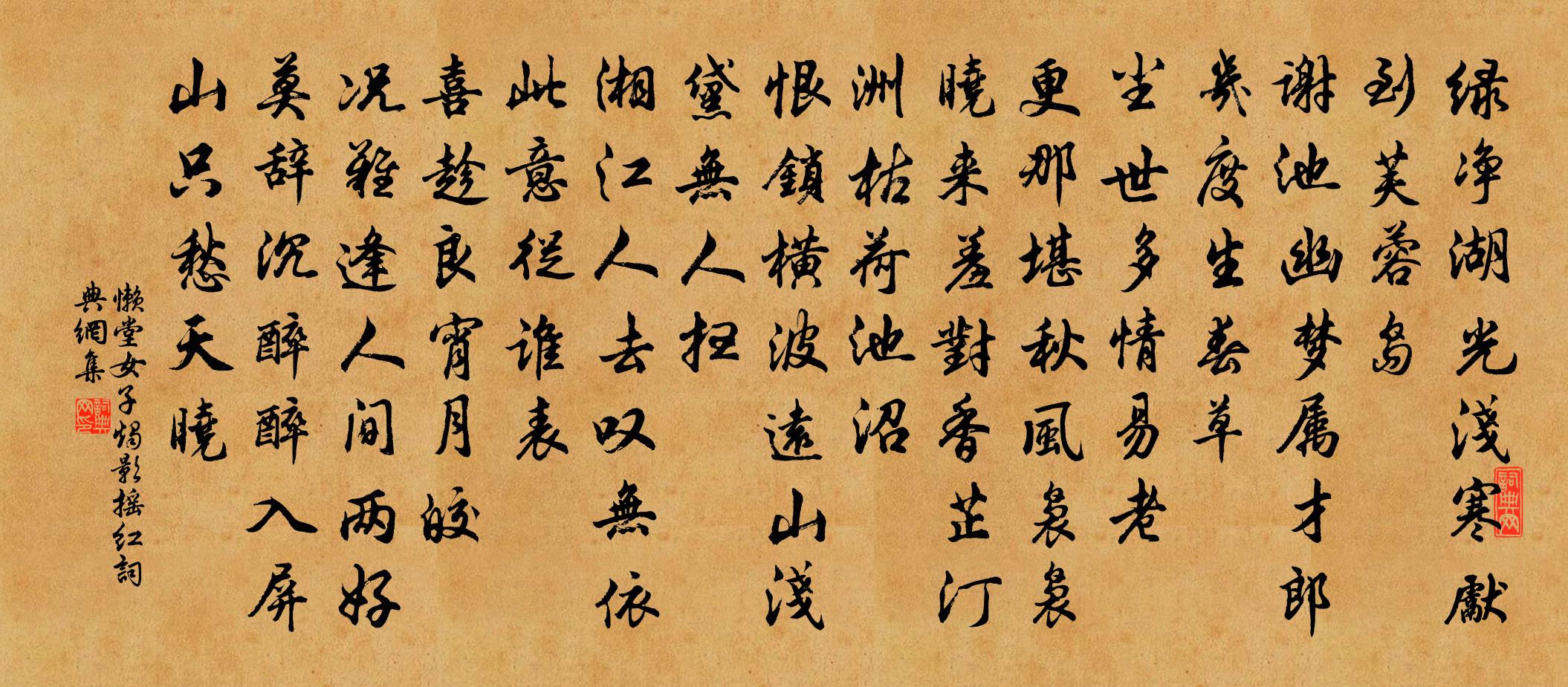 詩詞名句歷史字典書法欣賞書法字典國語詞典說文解字康熙字典古漢語字典標 題 作 者 詩 句 燭影搖紅作者:懶堂女子 朝代:宋代燭影搖紅原文綠淨湖光,淺寒先到芙蓉島。謝池幽夢屬才郎,幾度生春草。塵世多情易老。更那堪、秋風裊裊。曉來羞對,香芷汀洲,枯荷池沼。恨鎖橫波,遠山淺黛無人掃。湘江人去嘆無依,此意從誰表。喜趁良宵月皎。況難逢、人間兩好。莫辭沉醉,醉入屏山,只愁天曉。詩詞問答問:燭影搖紅的作者是誰?答:懶堂女子問:燭影搖紅寫於哪個朝代?答:宋代問:燭影搖紅是什麼體裁?答:詞懶堂女子燭影搖紅書法欣賞燭影搖紅書法作品詩詞推薦木蘭花慢 題蛾眉亭 善作眉嫵宋褧〔元代〕喚山靈一問,螺子黛、是誰供。畫婉變雙蛾,蟬聯八字,雨澹煙濃。澄江嬋娟玉鏡,盡朝朝暮暮照嬌容。只為古今秦家行佚名〔宋代〕彗孛飛光照天地,九天瓦裂屯冤氣。鬼哭聲聲怨趙高,宮花滴盡扶蘇淚。禍起蕭牆不知戢,羽書催築長城急。劍上漁家傲歐陽修〔宋代〕八月微涼生枕簟。金盤露洗秋光淡。池上月華開寶鑑。波瀲灩。故人千里應憑檻。蟬樹無情風苒苒。燕歸碧海珠簾山行書事長孫佐輔〔唐代〕日落風??,驅車行遠郊。中心有所悲,古墓穿黃茅。茅中狐兔窠,四面烏鳶巢。鬼火時獨出,人煙不相交。行行靈江釋了惠〔宋代〕水底烏龜無卦兆,岸頭神樹不相關。要知禍福流行處,只在波心月一灣。冬早書事楊時〔宋代〕窈冥誰為宰爐錘,榮謝唯知歲序催。臘日未經梅已綻,春風尚遠凍先開。愁無潤澤歸芳樹,獨有餘寒著死荄。收盡自笑陸游〔宋代〕宦途昔似伏轅駒,退處今如縱壑魚。手自掃除松菊徑,身常枕藉老莊書。郊居本自依農圃,社飲何妨逐里閭。白髮觀燈口號姜夔〔宋代〕正好嬉遊天作魔,翠裾無奈雨沾何。御街暗裡無燈火,處處但聞樓上歌。送劉荊山薛嵎〔宋代〕束書入京闕,憂國最清深。天意有興廢,人才無古今。布衣萬言疏,孤劍一生心。直道嗟難遇,賈生終陸沉。臞庵李洪〔宋代〕獨擅東南勝,能全山澤臞。舊傳纏錦襻,兼寫輞川圖。心逐江天遠,胸吞雲夢無。夫君有丘壑,寧復慕陶朱。紅莧史繩祖〔宋代〕易稱紅莧美柔英,夬決窮陰日旅辰。不以色紅為貴尚,何因赤莧有仙人。幽州新歲作張說〔唐代〕去歲荊南梅似雪,今年薊北雪如梅。共知人事何常定,且喜年華去復來。邊鎮戍歌連夜動,京城燎火徹明開。遙遙中秋月錢選〔宋代〕皎皎天邊白玉盤,年年此夕帶愁看。松枝積翠欺人老,桂影浮香入鬢寒。常記醉來多謬誤,又逢秋至輒悲酸。疏桐慧林遇薄傳正呂子進閒談孔武仲〔宋代〕粲粲西台彥,恂恂華省郎。相過金城靜,縱語春畫長。逍遙喜莊生,傲誕尤嵇康。紈扇不須搖,窗間襟袖涼。嘲賈似道劉壎〔宋代〕三百年余歷數更,東南萬里看昇平。黃金台上麒麟閣,混一元勛是賈生。東林道上閒步三首楊時〔宋代〕碧眼龐眉老比丘,雲根高臥語難酬。蕭然丈室無人間,一炷爐峰頂上浮。長風沙陸游〔宋代〕江水六月無津涯,驚濤駭浪高吹花。櫓聲已出雁翅浦,荻夾喜入長風沙。長風自古三巴路,檣竿參差雜煙樹。南船答僧訥賀鑄〔宋代〕唐代衣冠高四姓,天宗之亞滎陽鄭。不墜家聲五百年,桂籍相望三葉慶。上人猛謝區中緣,破冠投櫛還童顛。寸灰春真德秀〔宋代〕東風昨夜入簾帷,便覺深宮漏影遲。一曲涼州花盡放,不須先作報春詩。仇山圖戴表元〔宋代〕仇山山下仇人,白頭宦學走風塵。問渠家住山何處,雲氣漫漫不知路。詩人作事例多痴,逢山且畫且題詩。不如鄰名句推薦書劍時將晚,丘園日已暮。孟浩然《田園作》 胭脂淚,相留醉,幾時重。李煜《相見歡·林花謝了春紅》 見兔而顧犬,未為晚也;亡羊而補牢,未為遲也。劉向《戰國策·楚四·莊辛謂楚襄王》 徒善不足以為政,徒法不能以自行。孟子《孟子·離婁章句上·第一節》 一尺深紅勝麴塵,天生舊物不如新。溫庭筠《南歌子詞二首 / 新添聲楊柳枝詞》 東岩富松竹,歲暮幸同歸。王勃《送盧主簿》 總是向人深處,當時枉道無情陸游《朝中措·代譚德稱作》 無那塵緣容易絕,燕子依然,軟踏簾鉤說。納蘭性德《蝶戀花·辛苦最憐天上月》 我亦且如常日醉,莫教弦管作離聲。歐陽修《別滁》 人而無信,不知其可也。孔子弟子《論語·為政篇》