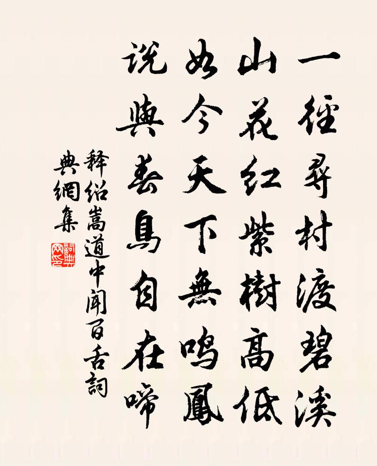 詩詞名句歷史字典書法欣賞書法字典國語詞典說文解字康熙字典古漢語字典標 題 作 者 詩 句 道中聞百舌作者:釋紹嵩 朝代:宋代道中聞百舌原文一徑尋村渡碧溪,山花紅紫樹高低。如今天下無鳴鳳,說與春鳥自在啼。詩詞問答問:道中聞百舌的作者是誰?答:釋紹嵩問:道中聞百舌寫於哪個朝代?答:宋代釋紹嵩道中聞百舌書法欣賞道中聞百舌書法作品詩詞推薦嘉泰二年恭上太皇太后尊號八首佚名〔宋代〕鼓鍾喤喤,務教載陳。德物陳矣,爛其瑤琨。咨爾上公,相予文孫。勿亟勿徐,奉我重親。詩三首嚴中和〔宋代〕梅天雨氣入簾櫳,衣潤頻添柏火烘。四月江南無矮樹,人家都在綠陰中。宮中三台王建〔唐代〕魚藻池邊射鴨,芙蓉帳里看花。日色赭袍相似,不著紅鸞扇遮。醜奴兒/採桑子張孝祥〔宋代〕珠燈璧月年時節,織手同攜。今夕誰知,自拈梅花勸一卮。逢人問道歸來也,日日佳期。管有來時。趁得手燈也未依韻和曾侍中謝二府相顧王珪〔唐代〕年年常過平津館,解組歸來苦未羸。曉日初臨金闕動,春風正與玉杯期。三公就第誰同壽,丞相傳經自有兒。感舊同舍餞新滁陽使群范子由寺丞於成均芳潤軒分虞儔〔宋代〕憶昔飛鳧來上國,作縣聲名動宸極。今朝頗怪空馬群,十年所得真雞肋。笑指滁陽有佳處,手把一麾留不得。醉翁用韻送任以道入四川總領幕府二首項安世〔宋代〕銅梁天漢一軺新,紅芰清波去及辰。顧我索居誰為友,與君難別豈關親。飛書上隴催庚癸,閉息匡床候子寅。出處偈頌一百零二首釋紹曇〔宋代〕有服藥,甚功效。不收肘後方書,不入神農本草。善財采處不識真,文殊用之不得妙。佛壟信手拈來,百病根源俱送孫長倩歸輝州王安石〔宋代〕溪澗得雨潦,奔溢不可航。江海收百川,浩浩誰能量。溪澗之日短,江海之日長。願生畜道德,江海以自方。君馬黃李白〔唐代〕君馬黃,我馬白。馬色雖不同,人心本無隔。共作遊冶盤,雙行洛陽陌。長劍既照曜,高冠何赩赫。各有千金裘,春日即事二首王義山〔宋代〕步屧隨風過柳川,眼前氣象覺熙然。勾萌甲拆皆春意,魚躍鳶飛遂性天。綠草方濃山盡發,紫芽新迸蕨初拳。自形同無咎遐寂文叔同游凝祥得游宇張耒〔宋代〕客子長安塵滿裘,道人門館自深幽。東風拂地千條柳,春水平池數點鷗。俯首一官真底事,倒囊三百更何求。讀書載答林逋〔宋代〕官曹久已稱廉吏,田裡時來顧散人。文戰談圍棋局外,絳侯何事號功臣。稽山道中陸游〔宋代〕禹陵草木初沾露,謝墅人家已閉門。八十年間幾來往,痴頑不料至今存。淳化中朝會二十三首佚名〔宋代〕軒昊方同德,成康粗比肩。素風惟普暢,皇道本無偏。陰魄重輪滿,陽精五色圓。要荒鹹率服,卓越聖功全。寓陳雜詩十首張耒〔宋代〕開門無客來,永日不冠履。客至我老懶,投刺輒復去。端成兩相忘,因得百無慮。故人在旁郡,書信不能屢。興哀鷓鴣天(九月十三日攜家游夏氏林亭燕集作,並送湯詞)葛勝仲〔宋代〕小榭幽園翠箔垂。雲輕日薄淡秋暉。菊英露浥淵明徑,藕葉風吹叔寶池。酬素景,泥芳卮。老人痴鈍強伸眉。歡華書林十景詩謝枋得〔宋代〕巍巍文筆光書林,插空幾地皆天成。尖齋不假雲煙斂,圓健何勞雨露深。椽墨太阿窺小丑,書天不動龍蛇走。何用內翰畢學士外製迤舍人故仈部閣老王公之門生王禹偁〔宋代〕掌貢司言耀聖朝,宦途屯否收難逃。雄文自貯胸中甲,直氣誰防笑里刀。黃閣不登名甚屈,紫垣終老道彌高。君看興龍節傳法院譯經御筵范祖禹〔宋代〕誕聖千年日,祈祥億劫尊。秘言翻貝葉,勝事集祗園。寶蓋天香住,銀璫詔語溫。曾無了義學,空愧酌堯樽。名句推薦劍河風急雪片闊,沙口石凍馬蹄脫。岑參《輪台歌奉送封大夫出師西征》 賞必加於有功,刑必斷於有罪。劉向《戰國策·秦三·范子因王稽入秦》 常記溪亭日暮,沉醉不知歸路。李清照《如夢令·常記溪亭日暮》 扁舟去作江南客,旅雁孤雲。朱敦儒《採桑子·彭浪磯》 不辭山路遠,踏雪也相過。張九齡《答陸澧》 看破的,遁入空門;痴迷的,枉送了性命。曹雪芹《紅樓夢·第五回》 便做無情,莫也愁人苦朱淑真《蝶戀花·送春》 江天一色無纖塵,皎皎空中孤月輪。張若虛《春江花月夜》 榮螈,蜥蜴。佚名《爾雅·釋魚》 堂上遠於百里,堂下遠於千里,門庭遠於萬里。管仲《管子·法法》