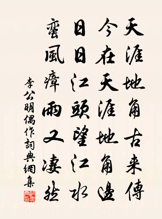 詩詞名句歷史字典書法欣賞書法字典國語詞典說文解字康熙字典古漢語字典標 題 作 者 詩 句 偶作作者:李公明 朝代:宋代偶作原文天涯地角古來傳,今在天涯地角邊。日日江頭望江水,蠻風瘴雨又悽然。詩詞問答問:偶作的作者是誰?答:李公明問:偶作寫於哪個朝代?答:宋代李公明偶作書法欣賞偶作書法作品詩詞推薦水口上舟呈同行傅月山萇五邁〔宋代〕泝流上嵩江,江闊流益峻。時方良月初,打關惡風信。老翁把柂立,首叫尾必應。大男前運稿,風激水還噴。小男天仙子周紫芝〔宋代〕雪似楊花飛不定。枝上凍禽昏欲暝。寒窗相對話分飛,簫鼓靜。燈炯炯。一曲陽關和淚聽。酒入離腸愁欲凝。往事次趙民瞻韻洪皓〔宋代〕假館連牆數見過,宗英年少雋才多。設科不倦來群彥,教學無他伏眾魔。草賦未曾師屈宋,喔詩豈復慕陰何。後生歷代詩隋楊簡〔宋代〕楊堅隨高皇,煬帝遂淫荒。恭帝不足道,四海正擾攘。三主四十年,天下禪於唐。琴歌王謹禮〔宋代〕低露下,深幕垂,月照孤琴空弦咽,宵淚誰憐此夜心。聞父老說兵汪元量〔宋代〕昔聞天兵入西蜀,鞞鼓亂撾裂岩谷。金鞍戰馬踏雲梯,日射旌旗紅{上竹下敕}{上竹下敕}。黑霧壓城塵漲天,夜看美人宮棋王建〔唐代〕宮棋布局不依經,黑白分明子數停。巡拾玉沙天漢曉,猶殘織女兩三星。讀書楊萬里〔宋代〕讀書不厭勤,勤甚倦且昏。不如卷書坐,人書兩忘言。興來忽開卷,逕到百聖源。說悟本無悟,談玄初未玄。當其眼兒媚趙長卿〔宋代〕當年策馬過錢塘。曲徑小平康。繁紅釅白,嬌鶯奼燕,爭喚何郎。而今又客東風裡,渾不似尋常。只愁別後,月房霜夜望月楊萬里〔宋代〕人靜蛩喧天欲霜,不眠獨自步風廊。閒看月走仍雲走,知是雲忙復月忙。嘗建茗二首曾幾〔宋代〕破除湯餅睡,倚賴建溪春。-往日惟求舊,今朝遽食新。不辭濃似粥,少待細於塵。寶胯無多子,留須我輩人。句諶祜〔宋代〕南極大明秋氣迥,西風吹夢泰階平。送春廖行之〔宋代〕煮醖青梅且共嘗,游峰飛蝶為誰忙。鞦韆彩索迷青草,車馬紅橋銷綠楊。春事戰加蒲劍老,詩腸結盡柳絲長。韶光金陵雜興二百首蘇泂〔宋代〕雨花台下百花香,駐馬坡前百草長。若還谷熟人民樂,依舊風流好建康。寄題吳子似所居二首讀書亭陳文蔚〔宋代〕古人花不可見,花千卷留遺編。要非紙上語,至理實參前。列聖精微心,舍此將何傳。極本會於一,枝葉數萬千。連雨有感許琮〔宋代〕酒醒雨聲至,新歡不可尋。美人惟草色,故國聽歌聲。日月何處盡,荊榛連夜深。開門謝天末,從此罷登臨。又省衣張繼先〔宋代〕衣服貴適宜,多裘與夏葛。眷茲修行人,初不事精潔。輕紗並麗帛,樣新價亦別。每縑數千錢,拙工亂裁截。些小壽皇子程珌〔宋代〕磊魁晶熒,歲有常期。秋分維何,天高氣清。玉蟾吐煇,銀漢無聲。澄霄一色,萬里雲平。此時候之,出丙入丁。贈賓貢裴說〔唐代〕惟君懷至業,萬里信悠悠。路向東溟出,枝來北闕求。家無一夜夢,帆掛隔年秋。鬢髮爭禁得,孤舟往復愁。爇心香馬鈺〔元代〕悟徹陽元。便把陽牽。要陽陽、徹地通天。陽穿八脈,陽透三田。覺一陽周,一陽就,一陽全。水養靈煙。火養靈名句推薦倚杖柴門外,臨風聽暮蟬。王維《輞川閒居贈裴秀才迪》 龍魚失水難為用,龜玉蒙塵未見珍牟融《春日山亭》 人道惡盈而好謙。佚名《易傳·彖傳上·謙》 聖人不法古,不脩今。法古則後於時,脩今則塞於勢。商鞅《商君書·開塞》 君疑臣則臣必死。羅貫中《三國演義·第一百一十九回》 春思亂,芳心碎。惠洪《千秋歲·半身屏外》 之子歸窮泉,重壤永幽隔。潘安《悼亡詩三首》 雪滿山中高士臥,月明林下美人來。高啟《詠梅九首》 小桃灼灼柳鬖鬖,春色滿江南。黃庭堅《訴衷情·小桃灼灼柳鬖鬖》 一日不見兮,思之如狂。司馬相如《鳳求凰 / 琴歌》