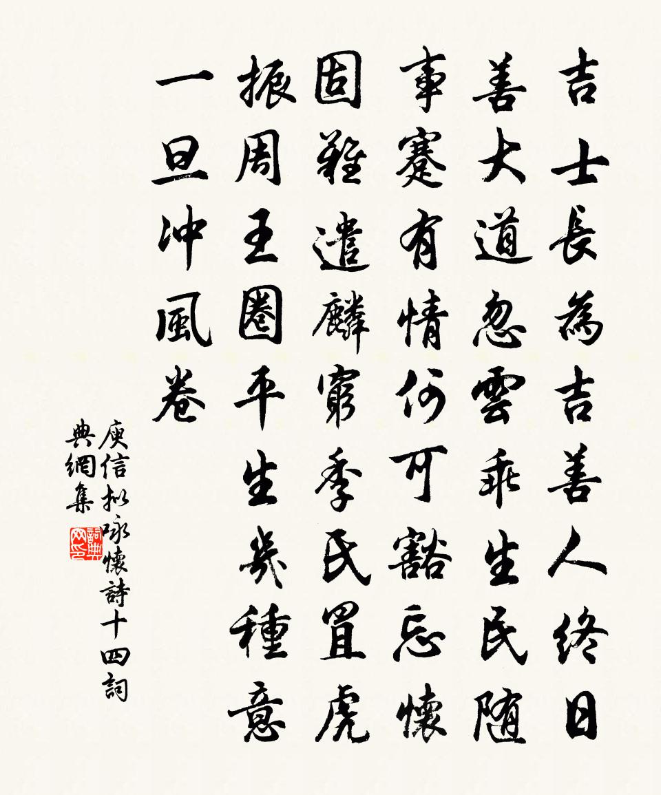 詩詞名句歷史字典書法欣賞書法字典國語詞典說文解字康熙字典古漢語字典標 題 作 者 詩 句 擬詠懷詩 十四作者:庾信 朝代:南北朝擬詠懷詩 十四原文吉士長為吉。善人終日善。大道忽雲乖。生民隨事蹇。有情何可豁。忘懷固難遣。麟窮季氏罝。虎振周王圈。平生幾種意。一旦衝風卷。詩詞問答問:擬詠懷詩 十四的作者是誰?答:庾信問:擬詠懷詩 十四寫於哪個朝代?答:南北朝問:庾信的名句有哪些?答:庾信名句大全庾信擬詠懷詩 十四書法欣賞擬詠懷詩 十四書法作品詩詞推薦句徐鉉〔唐代〕共泉分地脈,砧杵共秋聲。句張釜〔宋代〕霜翮摩霄萬里情。出塞詞馬戴〔唐代〕金帶連環束戰袍,馬頭沖雪度臨洮。卷旗夜劫單于帳,亂斫胡兒缺寶刀。當置酒曹勛〔宋代〕置酒臨芳觀,張筵繼落暉。選妓調絲竹,迎賓奉酒卮。月影移歌扇,花光照舞衣。霞觴飛白羽,高論吐虹霓。人生菩薩蠻(餞太夫人之南豐)郭應祥〔宋代〕修途六月清無暑。潘輿穩向盱南去。喜氣已津津。平反一笑春。人言陰德報。羅紙重重誥。明歲早歸來。泉江去鷁躡雲亭羅孝芬〔宋代〕出山不愧草堂靈,亂後看山山更青。餘燼豈容遺大廈,躡雲端為護危亭。參差春燕依華浦,斷續霜猿繞翠屏。物色琴曲歌辭。昭君怨白居易〔唐代〕明妃風貌最娉婷,合在椒房應四星。只得當年備宮掖,何曾專夜奉幃屏?見疏從道迷圖畫,知屈那教配虜庭?自是富春行贈范振晁補之〔宋代〕錢塘江北百里余,漲沙不復生菰蒲。沙田老桑出葉麤,江潮打根根半枯。八月九月秋風惡,風高駕潮晚不落。鼓聲用子存韻寄乃兄雪香趙善括〔宋代〕要識居塵不染塵,小窗容膝近東鄰。香梢不老偏宜曉,瘦節常寒別是春。侑坐圖書情頗厚,對床風雨夢還新。擬將落月元稹〔唐代〕落月沉餘影,陰渠流暗光。蚊聲靄窗戶,螢火繞屋樑。飛幌翠雲薄,新荷清露香。不吟復不寐,竟夕池水傍。大觀聞喜宴六首佚名〔宋代〕思皇多士,揚於王庭。鐘鼓樂之,肅雝和鳴。威備抑抑,既安且寧。天子萬壽,永觀厥成。西江月尹志平〔元代〕山後重興道院,燕南仍自干戈。道人功行累來多。免卻非災橫禍。每日誦經報國,終朝念道降魔。福生禍滅養沖和括沁園春林正大〔宋代〕廬阜諸峰,爐峰絕勝,草堂介焉。敞明窗淨室,素屏虛榻,要仰觀山色。俯聽流泉。中有池台,旁多竹卉,夾澗杉桂江逢王使君旅櫬歸劉言史〔唐代〕故人丹旐出南威,少婦隨喪哭漸歸。遙想北原新壟上,日寒光淺水松稀。望仙台黃非熊〔宋代〕台前高岳宅神仙,疊石誅茅對碧巔。雲霧不分人去路,管弦長動雨來天。彩鶯呼侶歸殘照,野鶴□□下紫煙。誰識秋日田園雜興范成大〔宋代〕乾高寅缺築牛宮,巵酒豚蹄酹土公。牯牸無瘟犢兒長,明年添種越城東。題周從龍養生圖劉克莊〔宋代〕二圖心悟非師傳,子若通之可以仙。欲向丹房供灑掃,老人爐灶壞多年。漢宮春陳亮〔宋代〕雪月相投。看一枝才爆,驚動香浮。微陽未放線路,說甚來由。先天一著,待辟開、多少旬頭。卻引取,春工入腳浣溪沙李之儀〔宋代〕聲名自昔猶時鳥,日月何嘗避覆盆。是非都付鬢邊蚊。邂逅風雷終有用,低回囊檻要深蹲。酒中聊複比乾坤。奉和聖制送張尚書巡邊胡皓〔唐代〕燕公為漢將,武德奉文思。利用經戎莽,英圖葉聖詒。塞沙制長策,窮石卷搖旗。萬里要相賀,三邊又在茲。棱威名句推薦惜別浮橋駐馬時,舉頭試望南山嶺。李頎《少室雪晴送王寧》 日用必須簡省,杜奢端,即以昭儉德。王永彬《圍爐夜話·第八三則》 東風不與周郎便,銅雀春深鎖二喬。杜牧《赤壁》 玉輪碾平芳草,半面惱紅妝。陳子龍《訴衷情·春遊》 人間萬事,毫髮常重泰山輕。辛棄疾《水調歌頭·壬子三山被召陳端仁給事飲餞席上作》 水墨畫疏窗,孤影淡瀟湘。納蘭性德《木蘭花慢·立秋夜雨送梁汾南行》 誠既勇兮又以武,終剛強兮不可凌。屈原《國殤》 臨砌影,寒香亂、凍梅藏韻。吳文英《花犯·郭希道送水仙索賦》 黃河之水天上來,奔流到海不復回。李白《將進酒》 赤壁磯頭,一番過、一番懷古。戴復古《滿江紅·赤壁懷古》