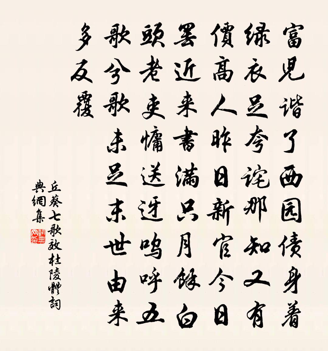詩詞名句歷史字典書法欣賞書法字典國語詞典說文解字康熙字典古漢語字典標 題 作 者 詩 句 七歌效杜陵體作者:丘葵 朝代:宋代七歌效杜陵體原文富兒諧了西園債,身著綠衣足夸詫。那知又有價高人,昨日新官今日罷。近來書滿只月余,白頭老吏慵送迓。嗚呼五歌兮歌未足,末世由來多反覆。詩詞問答問:七歌效杜陵體的作者是誰?答:丘葵問:七歌效杜陵體寫於哪個朝代?答:宋代丘葵七歌效杜陵體書法欣賞七歌效杜陵體書法作品詩詞推薦斗百花(汶妓閻麗)晁補之〔宋代〕小小盈盈珠翠。憶得眉長眼細。曾共映花低語,已解傷春情意。重向溪堂,臨風看舞梁州,依舊照人秋水。轉更添丁亥紀蜀百韻李曾伯〔宋代〕在負在娵觜,羲雙正東陸。羽書西邊來,胡騎報南牧。倉茫星火急,飄忽風雨速。憑陵我封疆,剽掠我孳留。一越泉聲林用中〔宋代〕穿雲絡日苦悲吟,澗底潺潺覓好音。弦管笙簧寒碎玉,源頭深處細追尋。享太廟樂章長發舞魏徵〔唐代〕濬哲惟唐,長發其祥。帝命斯祐,王業克昌。配天載德,就日重光。本枝百代,申錫無疆。絕句佚名〔宋代〕石沈遼海闊,劍別楚山長。會合知無日,離心滿夕陽。雙清堂醉臥陸游〔宋代〕客里逢秋醉似泥,空堂獨臥意淒迷。亂號庭樹西風急,斜掛城樓北斗低。末路敢貪請鶴料,微官久厭駕雞棲。平生項亭懷古竇常〔唐代〕力取誠多難,天亡路亦窮。有心裁帳下,無面到江東。命厄留騅處,年銷逐鹿中。漢家神器在,須廢拔山功。次韻公勝曉起對雪強至〔宋代〕向曉寒威覺倍濃,雪霙紛糅冷兼風。亂裝瓊樹千林密,疑瀉銀河一夜空。鷗鷺失群吟景內,乾坤同色醉眸中。青衫寄建寧韓尚書二首趙蕃〔宋代〕今代韓夫子,頻年刺兩州。官崇古常伯,地重漢諸侯。父老記茂宰,山川皆昔游。懸知里閭化,不待教條修。早發白帝城 / 白帝下江陵李白〔唐代〕朝辭白帝彩雲間,千里江陵一日還。兩岸猿聲啼不盡,輕舟已過萬重山。次韻答陳殿丞南塘觀魚見寄李覯〔宋代〕鱗鬛摧殘幾許年,水平風靜得潛淵。喜無美味登君俎,且學驪龍盡日眠。秋熱李覯〔宋代〕江湖限南鄙,秋令到還稀。節換空看歷,人閒未趁衣。齊紈方得意,廈燕莫言歸。祗有松筠徑,風高暑氣微。皇帝合春帖子趙湘〔唐代〕早鶯啼滑知寒薄,午馬休遲覺晝長。四海歡康幾務暇,簫韶時奉萬年觴。壽湖南宗憲五首廖行之〔宋代〕梅余傲雪香,柳欲搖金絲。隆冬如許清,真宰渠物私。居然風景殊,鍾此賢傑姿。政須鴻鈞播,天意扶民彝。題玉笥山強處士方乾〔唐代〕酒里藏身岩里居,刪繁自是一家書。世人呼爾為漁叟,爾學釣璜非釣魚。次韻公辟即席呈太虛秦觀〔宋代〕與君鄰並共煙霞,乘興時時過我家。更漏一新聞曉角,門闌數級看秋花。湖山對值全如買,風月相期不用賒。賴有一叢花(謝濟倅宗室令郯送酒)晁補之〔宋代〕王孫眉宇鳳凰雛。天與世情疏。揚州坐上瓊花底,佩錦囊、曾憶奚奴。金盞醉揮,滿身花影,紅袖競來扶。十年一御溝水王貞白〔唐代〕一帶御溝水,綠槐相蔭清。此中涵帝澤,無處濯塵纓。鳥道來雖險,龍池到自平。朝宗本心切,願向急流傾。郊廟歌辭。享太廟樂章。昭和佚名〔唐代〕道洽二儀交泰,時休四宇和平。環珮肅於庭實,鍾石揚乎頌聲。已醒張耒〔宋代〕已醒厭厭醉,將開灼灼紅。年年到春日,忽忽遇東風。暇日如年永,閒愁似酒濃。時能將醉眼,天際送飛鴻。名句推薦鍥而舍之,朽木不折;鍥而不捨,金石可鏤。荀子《荀子·勸學》 垂下簾櫳。雙燕歸來細雨中。歐陽修《採桑子·群芳過後西湖好》 潭州官舍暮樓空,今古無端入望中。李商隱《潭州》 鴻羽難憑芳信短,長安猶近歸期遠。盧祖皋《倦尋芳·香泥壘燕》 誰謂傷心畫不成,畫人心逐世人情。韋莊《金陵圖》 道存則國存,道亡則國亡。荀子《荀子·君道》 夫師,以身為正儀而貴自安者也。荀子《荀子·修身》 長者立,幼勿坐。長者坐,命乃坐。李毓秀《弟子規·出則弟》 衣懶換,酒難賒。可憐此夕看梅花。吳文英《思佳客·癸卯除夜》 稽於眾,捨己從人,不虐無告,不廢困窮佚名《尚書·虞書·大禹謨》