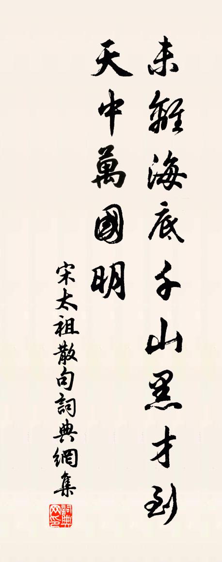 詩詞名句歷史字典書法欣賞書法字典國語詞典說文解字康熙字典古漢語字典標 題 作 者 詩 句 句作者:宋太祖 朝代:宋代句原文未離海底千山黑,才到天中萬國明。詩詞問答問:句的作者是誰?答:宋太祖問:句寫於哪個朝代?答:宋代問:句是什麼體裁?答:句宋太祖句書法欣賞句書法作品詩詞推薦薙草李復〔宋代〕眾草費薙鋤,回首已芒翳。隨處競茀冗,苟生無遠意。時亦吐柔蔓,牽引強附離。端居嘆力寡,門庭愧蕪穢。真州雜賦文天祥〔宋代〕我作朱金沙上游,諸君冠蓋渡瓜洲。淮雲一片不相隔,南北死生分路頭。題公震小景晁說之〔宋代〕萬古興亡歸白鷺,一時舒慘在青山。與君都下太平日,豈料思君鼙鼓間。送江朝宗歸括蒼范成大〔宋代〕半生三邂逅,相看成老翁。詩情故崒嵂,袖有天都峰。江山佳麗地,登臨苦匆匆。塔燈落淮水,寺樓倚霜空。擴拾丙寅九月二十八日作來年將告老辛棄疾〔宋代〕漸識空虛不二門,掃除諸幻絕根塵。此心自擬終成佛,許事從今只任真。有我故應還起滅,無求何自別冤親。西山讀公擇篋中徐季益孫子進昆仲詩有懷其人因以趙蕃〔宋代〕我貧猶說在有貧,覊旅如君更感人。強道詩工能泣鬼,未如錢夥可通神。方竹張詠〔宋代〕枝枝方直綠參參,林葉疏紅始見心。卻恐法時惡圓佞,結根遙向楚雲深。數日項頰顴咽腫痛發中有瘡方回〔宋代〕有生必死理之常,酒到何為不舉觴。未問劉伶墳上土,何妨張詠鬢邊瘡。叔和解訣行屍脈,仲景工言越婢湯。知命又和南塘十首劉克莊〔宋代〕□□漁輒獲,元□□幾戕。不足煩三顧,毋寧且□□。刳鑽供卜筮,巾笥沐恩光。何似泥中伏,朝朝出太陽。洛陽河亭奉酬留守群公追送(一作李逸詩)李益〔唐代〕離亭餞落暉,臘酒減春衣。歲晚煙霞重,川寒雲樹微。戎裝千里至,舊路十年歸。還似汀洲雁,相逢又背飛。送邵省元何文季〔宋代〕血汗文場日未東,秋香壓倒萬花叢。幾年豹隱山中霧,一息鵬摶海上風。魁業正須期遠大,微官豈足論窮通。龍門寄題成都張宰壓雲樓二絕洪咨夔〔宋代〕氣如軻也生於義,道似參乎任以仁。乾蓋坤輿猶塞破,何難壓倒玉嶙峋。送元八張籍〔唐代〕百神齋祭相隨遍,尋竹看山亦共行。明日城西送君去,舊遊重到獨題名。一寸金佚名〔宋代〕頓悟修行道理,除情戰睡敵魔。不貪名利少風波。懶散隨緣且過。飢後尋街乞飯,飽時信步蹉跎。閒來古廟唱哩*詠史上光武明帝陳普〔宋代〕後宮任姒古今希,前殿弦歌鳳已知。孔子孟軻真薄命,不生建武永平時。邵陵作張謂〔唐代〕嘗聞虞帝苦憂人,只為蒼生不為身。已道一朝辭北闕,何須五月更南巡。昔時文武皆銷鑠,今日精靈常寂寞。斑竹賞心亭曾極〔宋代〕柱上題名客姓蘇,江山清絕冠吳都。六花飛舞憑闌處,一本天生臥雪圖。蓮塘孟遲〔唐代〕脈脈低回殷袖遮,臉橫秋水髻盤鴉。蓮莖有刺不成折,盡日岸傍空看花。石竹花詠陸龜蒙〔唐代〕曾看南朝畫國娃,古蘿衣上碎明霞。而今莫共金錢斗,買卻春風是此花。蔡推官之父母與伯父母輓詩魏了翁〔宋代〕人生宇宙皆同氣,況此根心貫一機。安用有生銜父恤,只愁無德報春輝。桂芳春老傷何及,樹靜風號原竟違。更恨名句推薦如夢,如夢,殘月落花煙重。李存勖《如夢令·曾宴桃源深洞》 上有青冥之長天,下有淥水之波瀾李白《長相思·其一》 昔別君未婚,兒女忽成行杜甫《贈衛八處士》 春水碧於天,畫船聽雨眠。韋莊《菩薩蠻·人人盡說江南好》 雪暗凋旗畫,風多雜鼓聲。楊炯《從軍行》 言必信,行必果。孔子弟子《論語·子路篇》 功過不宜少混,混則人懷惰隳之心洪應明《菜根譚·概論》 花自飄零水自流。一種相思,兩處閒愁。李清照《一剪梅·紅藕香殘玉簟秋》 守身不敢妄為,恐貽羞於父母王永彬《圍爐夜話·第三四則》 風摧寒棕響,月入霜閨悲。李白《獨不見》
