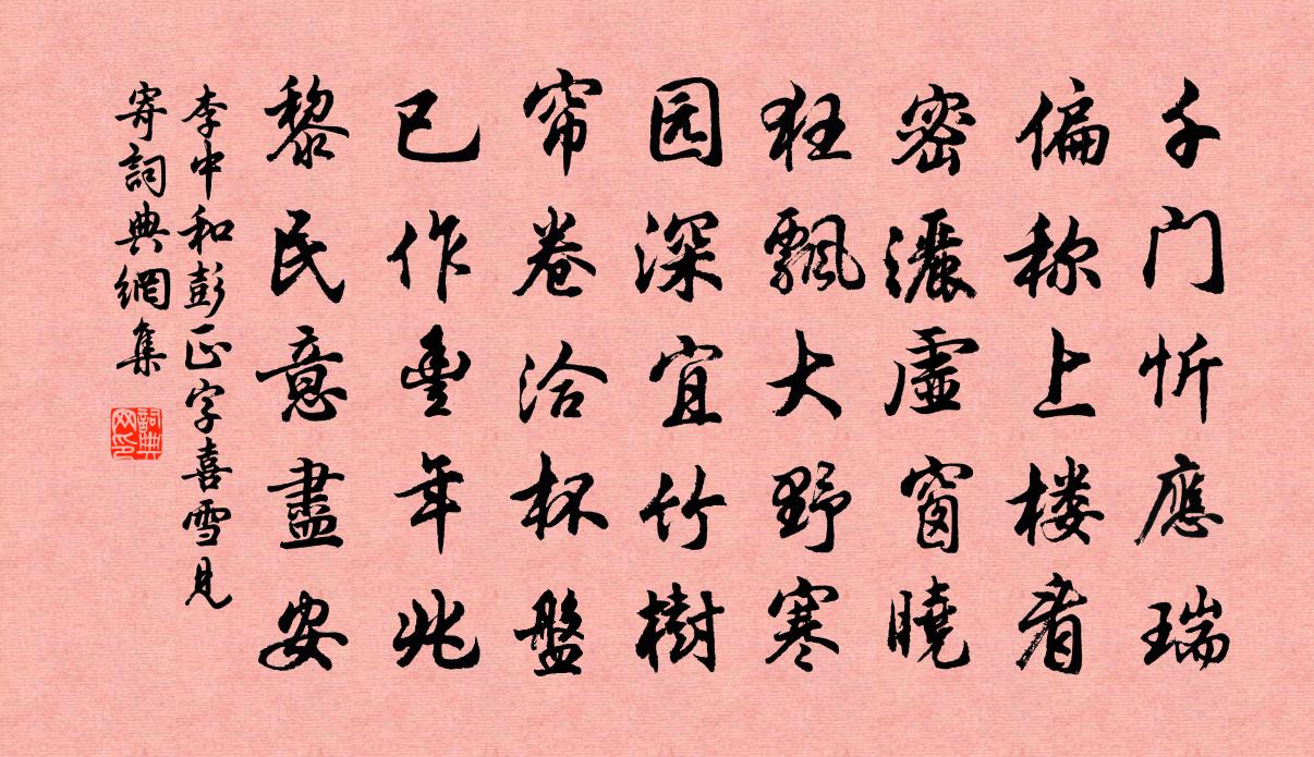 詩詞名句歷史字典書法欣賞書法字典國語詞典說文解字康熙字典古漢語字典標 題 作 者 詩 句 和彭正字喜雪見寄作者:李中 朝代:唐代和彭正字喜雪見寄原文千門忻應瑞,偏稱上樓看。密灑虛窗曉,狂飄大野寒。園深宜竹樹,簾卷洽杯盤。已作豐年兆,黎民意盡安。詩詞問答問:和彭正字喜雪見寄的作者是誰?答:李中問:和彭正字喜雪見寄寫於哪個朝代?答:唐代問:和彭正字喜雪見寄是什麼體裁?答:五律李中和彭正字喜雪見寄書法欣賞和彭正字喜雪見寄書法作品注釋全唐詩:卷750-30詩詞推薦羅敷歌(醜奴兒)賀鑄〔宋代〕東山未辦終焉計,聊爾西來。花苑平台。倦客登臨第幾回。連延復道通馳道,十二門開。車馬塵埃。悵望江南雪後仆者楊金韋莊〔唐代〕半年辛苦葺荒居,不獨單寒腹亦虛。努力且為田舍客,他年為爾覓金魚。和邵端公醉後寄於諫議之作權德輿〔唐代〕莫羨檐前柳,春風獨早歸。陽和次第發,桃李更芳菲。自遣葉茵〔宋代〕蟻夢功名覺即休,駒陰歲月去難留。傷念不復並三樂,擬古猶堪續四愁。松下抱琴塵外境,雨余蒔藥柳邊洲。老來挽范丞相五首吳芾〔宋代〕長計公生日,年年獻壽詩。只今良月近,遽作九泉悲。世事真難料,人生信有涯。西風吹畫翣,心折淚空垂。離亭燕·一帶江山如畫張昪〔宋代〕一帶江山如畫。風物向秋瀟灑。水浸碧天何處斷,翠色冷光相射。蓼岸荻花中,隱映竹籬茅舍。天際客帆高掛。門醉花間·休相問毛文錫〔唐代〕休相問,怕相問,相問還添恨。春水滿塘生,鸂鶒[1]還相趁。昨夜雨霏霏,臨明寒一陣。偏憶戍樓人,久絕邊謝送蠟梅三首曾幾〔宋代〕天將何物染江梅,白玉花成栗玉開。一種暗香全似舊,小罌和雪送春來。詠篆畦垂絲海棠舒岳祥〔宋代〕奪胎錦帶仍添麗,借面芙蓉特太癯。睡去不禁春露壓,醉來誰倩曉風扶。長條莫恨無新葉,纖瓣還能著細須。火急將行陪貳車觀燈晁補之〔宋代〕行歌紅粉滿城歡,猶作常時五馬看。忽憶使君身是客,一時揮淚逐金鞍。瑞鶴仙盧祖皋〔宋代〕眉青。炯如微月澹疏星。”故末章及之。江南秋欲遍。正蓴際鱸分,酒邊螯薦。青林雁霜淺。問風流何事,試華偏齊天樂(餘閒書院擬賦蟬)呂同老〔宋代〕綠陰初蔽林塘路,淒淒乍流清韻。倦咽高槐,驚嘶別柳,還憶當時曾聽。西窗夢醒。嘆弦絕重調,珥空難整。綽約宿徐稚子齋中顧禧〔宋代〕已將夙昔志,抵掌為君陳。笳鼓悲吳地,鬚眉憶漢臣。梅花憑夜發,柳色隔年新。此夕關河客,應輸夜臥人。臘月書事張耒〔宋代〕荊棘連昌路,珠璣久化塵。青山飛白鳥,野水渡行人。寂寂繁華盡,悠悠草木春。人間有興廢,何事獨傷神。宮亭湖黃庭堅〔宋代〕左手作圓右手方,世人機敏便可爾。一風分送南北舟,斟酌鬼神宜有此。江津留語同濟僧,他日求我於宮亭。吁嗟褒禪山有於湖所題寶塔二字羅點〔宋代〕古剎浮屠映碧山,狀元題墨最為嫻。遊人倦憩塵心寂,雲自青天水自閒。獵者五邁〔宋代〕山中有獵才,設綱張四隅。稚{上鹿下間}為所絓,性命懸庖廚。母麞於綱外,躑躅相悲呼。明知獵者意,於已並怪石范端臣〔宋代〕人間足安危,頃刻異候狀。唯應山中石,不愛客塵障。搜奇貯元龍,飛雲勞魯望。和強參軍晚鶯盧某〔宋代〕每到年年二月時,遷喬常向最高枝。春教綠綺調喉舌,天賜黃金作羽儀。無限園林皆占便,幾多蜂蝶競相隨。除棲壽劉上舍將仕翁溪園〔宋代〕魯台昨夜已書雲,喜報今朝紀紱麟。五色祲呈迎瑞氣,一陽道長慶亨辰。定知昴宿鍾英質,須信長庚現後身。敢效名句推薦將軍角弓不得控,都護鐵衣冷難著。岑參《白雪歌送武判官歸京》 今春看又過,何日是歸年。杜甫《絕句二首》 初驚河漢落,半灑雲天裡。李白《望廬山瀑布水二首》 愛向竹欄騎竹馬,懶於金地聚金沙。金地藏《送童子下山》 明月不諳離恨苦。斜光到曉穿朱戶。晏殊《蝶戀花·檻菊愁煙蘭泣露》 黃埃散漫風蕭索,雲棧縈紆登劍閣。白居易《長恨歌》 玉人初上木蘭時。懶妝斜立澹春姿。吳文英《浣溪沙·題李中齋舟中梅屏》 不知香積寺,數里入雲峰王維《過香積寺》 遠信入門先有淚,妻驚女哭問何如。元稹《得樂天書》 乍見翻疑夢,相悲各問年。司空曙《雲陽館與韓紳宿別》