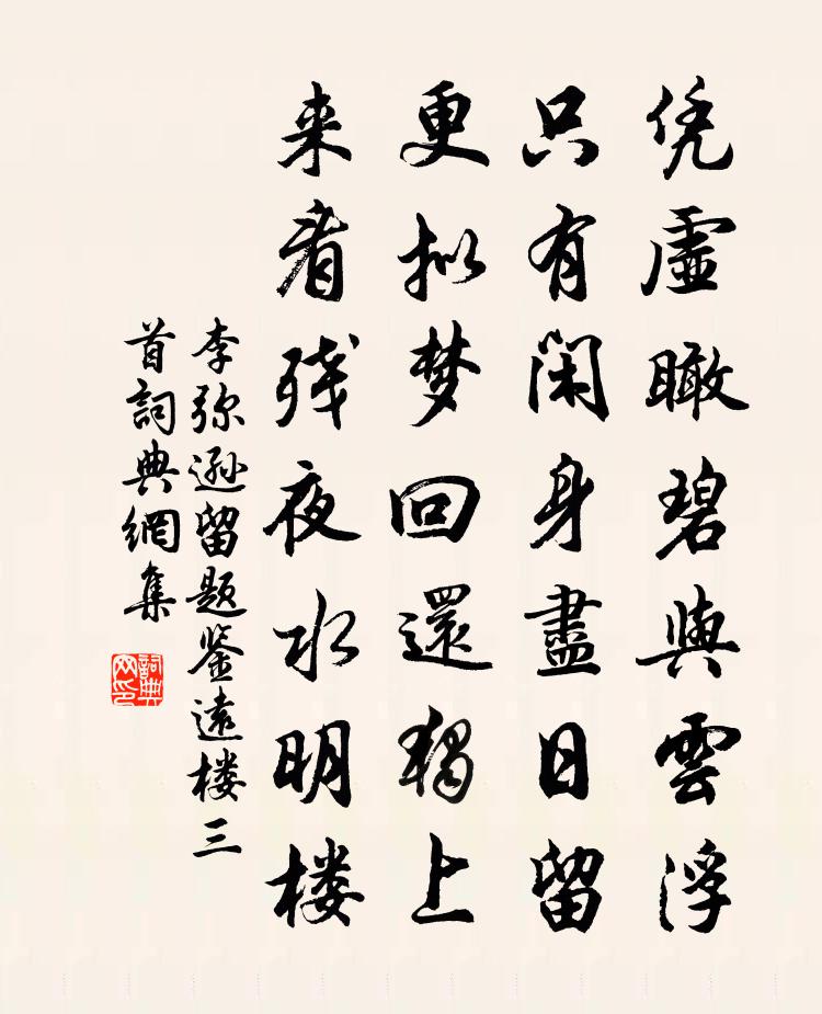 詩詞名句歷史字典書法欣賞書法字典國語詞典說文解字康熙字典古漢語字典標 題 作 者 詩 句 留題鑒遠樓三首作者:李彌遜 朝代:宋代留題鑒遠樓三首原文憑虛瞰碧與雲浮,只有閒身盡日留。更擬夢回還獨上,來看殘夜水明樓。詩詞問答問:留題鑒遠樓三首的作者是誰?答:李彌遜問:留題鑒遠樓三首寫於哪個朝代?答:宋代李彌遜留題鑒遠樓三首書法欣賞留題鑒遠樓三首書法作品詩詞推薦李忠定公輓詩吳岡〔宋代〕夢卜庸直相,艱難倚在儒。英風起衰懦,直氣懾奸諛。琳館終高臥,燕然漫仕圖。哀榮看贈典,猶是尉寰區。再題半峰亭蔣堂〔宋代〕何名半峰亭,堯峰路之半。遊客趨層崖,斗上多股戰。寶雲構此軒,接引心不倦。所冀冠蓋來,少休松石畔。雄視呈柳子玉同年王安石〔宋代〕三年不上鄴王台,鴻雁歸時又北來。水底舊波吹歲換,柳梢新葉卷春回。塵沙浂漠凋雙鬢,簫鼓匆匆把一杯。勞事菊連文鳳〔宋代〕不用移春檻,西風滿客車。行行無長物,粲粲只黃花。晚色裝秋重,寒香引霧斜。輦來尊俎處,有酒不須余。入窮巷謁李材叟翹叟戲贈兼簡田子平三首黃庭堅〔宋代〕只可闋中安止止,誰能鐵里斗錚錚。田多谷少無人會,譬似無田過一生。湖上感春釋行海〔宋代〕西湖二月好笙歌,游女游郎半插花。忽對春風懷故國,不知新燕入誰家。陪曾宏父登冷泉亭望飛來峰李處權〔宋代〕何年此峰獨飛來,群山讓秀中崔嵬。神刓天畫不可狀,仰視孤高摩斗魁。蘊靈產此萬珍木,隆霜幾度森不摧。異僧立春陳造〔宋代〕春信葭灰動,尋知寒事休。光陰從冉冉,身世判悠悠。鬢影看銀勝,官期志土牛。羸骸更元命,惜為斗升留。春寒文同〔宋代〕東風何事力猶微,凜凜邊寒犯客衣。舊雪未消新雪下,南園春色幾時歸。賦遺經閣張栻〔宋代〕生世豈雲晚,六籍初未亡。向來言外旨,瞠視多茫茫。隱微會見獨,如日照八荒。始知傳心妙,初豈隔毫芒。絕學王文恭公輓詞二首黃庭堅〔宋代〕先皇憑玉幾,末命寄元勛。賓日行黃道,攀髯上白雲。四時成歲律,五色補天文。不謂堂堂去,今為馬鬣墳。次韻象山書院山長汪德載垂訪方回〔宋代〕古學非如進士場,淵乎深處海難量。善藏未用爭飴利,中立懸知異狷狂。度遠出寒公案在,漸修頓悟話頭長。公□秋閨思張仲素〔唐代〕碧窗斜月靄深暉,愁聽寒螿[1]淚濕衣。夢裡分明見關塞,不知何路向金微?贈從弟劉楨〔魏晉〕泛泛東流水。磷磷水中石。苹藻生其涯。華葉紛擾溺。采之薦宗廟。可以羞嘉客。豈無園中葵。懿此出深澤。節惠劉克莊〔宋代〕醉似東皋子,愚於北谷去。何當節一惠,單謚作愚翁。漁郎董嗣杲〔宋代〕儒者困章句,負抱希聖賢。披緇談虛空,要悟西方禪。仙人說金丹,飛步學長年。三者亦何心,不過壽所傳。爭如挽穀子長廖行之〔宋代〕伊昔拜芝宇,詞場話俊游。一從分袂日,五閱鱠鱸秋。別夢思何極,長川逝莫留。蓋棺俄隔世,空遣淚橫流。石淙李嶠〔唐代〕羽蓋龍旗下絕冥,蘭除薜幄坐雲扃。鳥和百籟疑調管,花發千岩似畫屏。金灶浮煙朝漠漠,石床寒水夜泠泠。自然風入松王吉昌〔元代〕乾坤爻變括天心。樞簡易浮沉。斡旋升降成甘露,種黃芽、陸地根深。瀲灩滋榮金蕊,丹霞照,萬神欽。雲收天靜絕句六十四首張伯端〔宋代〕三才相盜食其時,此是神仙道德機。萬化既安諸慮息,百骸俱理證無為。名句推薦遠與君別者,乃至雁門關。江淹《古離別》 跨馬出郊時極目,不堪人事日蕭條杜甫《野望》 綠楊帶雨垂垂重。五色新絲纏角粽。歐陽修《漁家傲·五月榴花妖艷烘》 尊前只恐傷郎意,閣淚汪汪不敢垂。夏竦《鷓鴣天·鎮日無心掃黛眉》 無限傷心夕照中,故國淒涼,剩粉余紅。夏完淳《一剪梅·詠柳》 中庸其至矣乎!民鮮能久矣。子思《中庸·第三章》 江南幾日又天涯,誰與寄相思?董士錫《木蘭花慢·武林歸舟中作》 山不在高,有仙則名水不在深,有龍則靈劉禹錫《陋室銘》 一顧傾人城,再顧傾人國。李延年《李延年歌》 此地動歸念,長年悲倦遊。王籍《入若耶溪》