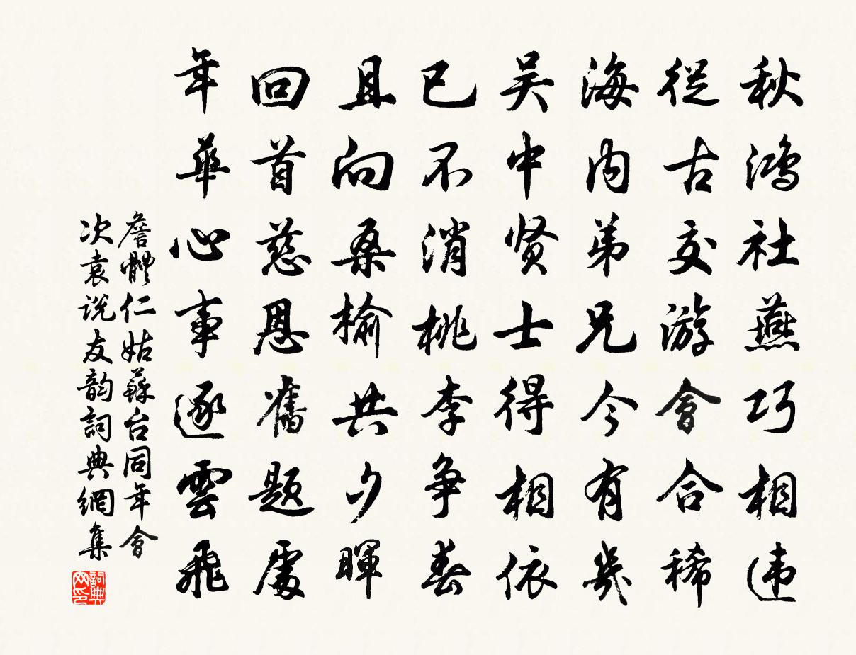 詩詞名句歷史字典書法欣賞書法字典國語詞典說文解字康熙字典古漢語字典標 題 作 者 詩 句 姑蘇台同年會次袁說友韻作者:詹體仁 朝代:宋代姑蘇台同年會次袁說友韻原文秋鴻社燕巧相違,從古交遊會合稀。海內弟兄今有幾,吳中賢士得相依。已不消桃李爭春,且向桑榆共夕暉。回首慈恩舊題處,年華心事逐雲飛。詩詞問答問:姑蘇台同年會次袁說友韻的作者是誰?答:詹體仁問:姑蘇台同年會次袁說友韻寫於哪個朝代?答:宋代詹體仁姑蘇台同年會次袁說友韻書法欣賞姑蘇台同年會次袁說友韻書法作品詩詞推薦送藥者陳國器楊萬里〔宋代〕竇憲一舉空朔野,曹霸一筆空凡馬。吾鄉藥者有陳生,一丸洗空萬藥者。庸醫皆笑道旁莎,陳生拈出便是玉山禾。詠史上季札陳普〔宋代〕鸞鷟無聲皇極差,消磨人物百千家。姑蘇無限騷人楚,不罪延陵罪浣沙。贈柳李商隱〔唐代〕章台從掩映,郢路更參差。見說風流極,來當婀娜時。橋回行欲斷,堤遠意相隨。忍放花如雪,青樓撲酒旗。送呂希道少卿知滁州蘇轍〔宋代〕長怪名卿亦坐曹,忽乘五馬列旌旄。才多莫厭官無事,郡小不妨名自高。庶子定應牽賦詠,醉翁聊復繼游遨。試尋和楊教授張栻〔宋代〕客少從蒿長,居深懶戶開。孤城歲雲莫,瘦馬子能來。長策憐葵向,新詩更雨催。相看前日事,此首忍重回。琉璃灘陳岩〔宋代〕青青琉璃手可拈,寒花多在雨中添。高風不捲銀河浪,仿佛康王谷里簾。何造誠作浩然堂陳義甚高然頗喜度世飛升之說黃庭堅〔宋代〕萬物浮沈共我家,清明心水徧河沙。無鉤狂象聽人語,露地白牛看月斜。小雨呼兒蓺桃李,疏簾幃客轉琵琶。塵塵句袁韶〔宋代〕宴堂聯族子,講席後諸生。續辯才詩二句蘇軾〔宋代〕天愛禪心圓且潔,故添明月伴清光。榮華樂( 一作東洛梁家謠)李賀〔唐代〕鳶肩公子二十餘,齒編貝,唇激朱。氣如虹霓,飲如建瓴,走馬夜歸叫嚴更。徑穿復道游椒房,尨裘金玦雜花光。竹溪再和余亦再作劉克莊〔宋代〕紙帳參梅花觀,銅彝炷柏子香。適夢遊旃檀國,覺來元在禪房。蒙知府寵示秋日郡圃佳制遂侍杖屨逍遙林水間陳與義〔宋代〕鳥語知公樂,晴山及我游。盡排物外事,拚作酒中浮。菊蕊離雙鬢,林聲隱四愁。騷人例喜賦,政自不關秋。雪山釋心月〔宋代〕晝漫漫地夜漫漫,高下峰巒總一般。身在洞然明白里,勿於明白裡頭看。雪後月夜登樓顧逢〔宋代〕雪屋凝寒凍不流,碧天如水似中秋。一樓月色無人共,聽盡鐘聲未下樓。玉樓春(戊寅重陽,病中不飲,惟煎小雲團一杯,薦以菊花)毛滂〔宋代〕西風吹冷沈香篆。門掩小晴紅葉院。臥看 * 送重陽,露重煙寒花未遍。衰翁病怯琉璃簟。日日愁侵霜鬢短。一杯龜堂雨後作陸游〔宋代〕澤國春多雨,龜堂病少悰。雖名舊朝士,其實老耕農。一點葦間火,數聲煙外鍾。詩材故不乏,處處起衰慵。同官三人率慶裘元量司直於湖中有詩呈諸公徐僑〔宋代〕欲晴未晴還不雨,無日無雨又無暑。煙薄微籠四岸山,空翠卻向湖中聚。今日之游誠佳哉,湖山文字中銜杯。相為代徐思遠謝張季萬王洋〔宋代〕淳風嘆遼遠,友道傷澆漓。交情比一線,斷續同軒縻。仁惇既難事,義重亦不支。寒谷少溫律,衡門自寒扉。亦聞上巳後一日,同子文、伯莊、永年步東園三首楊萬里〔宋代〕九徑陰陰一一穿,前談後笑各欣然。緩行不是身無力,滿地殘紅不忍前。寄景遜文同〔宋代〕別後西城上,來須到日曛。目迎秦塞雁,心過隴山雲。寡合無如我,高懷少似君。相思只相望,徒爾托云云。名句推薦同來望月人何處?風景依稀似去年。趙嘏《江樓舊感 / 江樓感舊》 齊唱憲王春樂府,金梁橋外月如霜。李夢陽《汴京元夕》 近來攀折苦,應為別離多王之渙《送別》 烏鳥之狡,雖善不親。不重之結,雖固必解管仲《管子·形勢》 驛寄梅花,魚傳尺素。秦觀《踏莎行·郴州旅舍》 酹酒蒼茫,倚歌平遠,亭上玉虹腰冷。吳文英《十二郎·垂虹橋》 渡頭楊柳青青。枝枝葉葉離情。晏幾道《清平樂·留人不住》 理直千人必往,心虧寸步難移。馮夢龍《醒世恆言·卷十六》 濤瀾洶湧,風雲開闔。蘇轍《黃州快哉亭記》 零落棲遲一杯酒,主人奉觴客長壽。李賀《致酒行》