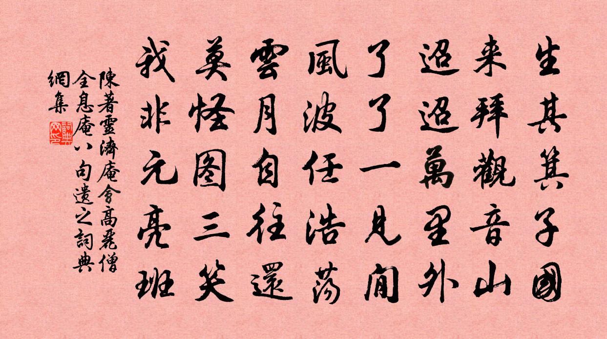 詩詞名句歷史字典書法欣賞書法字典國語詞典說文解字康熙字典古漢語字典標 題 作 者 詩 句 靈濟庵會高麗僧全息庵八句遺之作者:陳著 朝代:宋代原文生其箕子國,來拜觀音山。迢迢萬里外,了了一見閒。風波任浩蕩,雲月自往還。莫怪圖三笑,我非元亮班。詩詞問答問:《靈濟庵會高麗僧全息庵八句遺之》的作者是誰?答:陳著問:該詩寫於哪個朝代?答:宋代書法欣賞靈濟庵會高麗僧全息庵八句遺之書法作品詩詞推薦資善御筵送刑部侍郎致仕李受歸廬山山王珪〔唐代〕都門車馬動行塵,詔集華堂寵退臣。延閣帶經為舊老,商山攜杖作歸人。燕回天上還侵晚,夢入江南已見春。曾抱水龍吟劉辰翁〔宋代〕孤煙澹澹無情,角聲正送層城暮。傷懷絕似,龍山罷後,騎台沉處。珠履三千,金人十二,五陵無樹。嘆岐王宅里過尤溪劉宰〔宋代〕尤溪塘上征人路,記得停驂一解顏。十載重來兒女換,似曾相識有青山。句任推官〔宋代〕南國冠儒林,年高便息心。代弟茝詠梅畫十景臥煙陳著〔宋代〕生香自恨玉為容,誰放晨光淺碧籠。隱約風標難畫處,邯鄲人在夢炊中。送劉唐卿戶曹擢第西歸范成大〔宋代〕四海西州舊故多,煩君問訊各如何?心期本自無南北,萬里天波一月波。題東流菊江亭廖冔〔宋代〕陶公非是愛黃花,花與陶公本一家。懶向春風競顏色,自甘秋露綴英華。寧知發早還先萎,到底開遲反耐賒。物理暮春王安石〔宋代〕無限殘紅著地飛,溪頭煙樹翠相圍。楊花獨得東風意,相逐晴空去不歸。所懷文天祥〔宋代〕予自皋亭山為北所留,深悔一出之誤。聞故人劉小村、陳蒲塘引兵而南,流涕不自堪。只把初心看,休將近事論。水調歌頭趙彥端〔宋代〕山色望中好,□□□□清。連峰疊巘極目,高下與雲平。玉洞沈沈何處。隱映一溪煙樹。倒影碧波□。喚起驂鸞客己亥雜詩龔自珍〔清代〕秋心如海復如潮,惟有秋魂不可招。漠漠鬱金香在臂,亭亭古玉佩當腰。氣寒西北何人劍,聲滿東南幾處簫。一川魯郡途中遇徐十八錄事(時此公學王書嗟別)高適〔唐代〕誰謂嵩潁客,遂經鄒魯鄉。前臨少昊墟,始覺東蒙長。獨行豈吾心,懷古激中腸。聖人久已矣,游夏遙相望。裴回禪人寫真求贊釋正覺〔宋代〕只者赤肉一塊,說甚清奇古怪。平生懶似牛頭,度世憨如布袋。不空而空,無在而在。法法唯心,塵塵三昧。問渠早秋宋伯仁〔宋代〕秋天一餉晚風涼,笑語人傳早稻香。樓上醉時簾半卷,愁添客鬢兩蒼蒼。竹枝歌七首楊萬里〔宋代〕莫笑樓船不解行,識儂號令聽儂聲。一人唱了千人和,又得蹉前五里程。青玉案(用賀方回韻,有所禱而作)李之儀〔宋代〕小篷又泛曾行路。這身世、如何去。去了還來知幾度。多情山色,有情江水,笑我歸無處。夕陽杳杳還催暮。練淨送碩夫兄之武昌王柏〔宋代〕年年征袖拂孤篷,飽歷風霜似有功。行李又謀千里外,別情多在數聯中。騷騷荻岸飄新白,索索楓江落冷紅。若遇武陵春姬翼〔元代〕幸遇真仙來海上,丹藥肯長留。亘古靈方秘藏收。傳與列仙儔。試貯金壺成醞釀,一飲醉千秋。海變桑田不舉頭。初二日許公度使君來自西坑賊寨見訪方回〔宋代〕曰予視賊壘,雨且二十日。山行屢顛仆,泥行馬沒膝。火攻未可施,諸軍睨空碧。小丑膽氣粗,亦有砲與石。持榜桂州口號戎昱〔唐代〕畫角三聲動客愁,曉霜如雪覆江樓。誰道桂林風景暖,到來重著皂貂裘。名句推薦人怕三見面,樹怕一墨線。佚名《增廣賢文·下集》 閒立春塘煙淡淡,靜眠寒葦雨颼颼。鄭谷《鷺鷥》 中山孺子倚新妝,鄭女燕姬獨擅場。李夢陽《汴京元夕》 便覺眼前生意滿,東風吹水綠參差。張栻《立春偶成》 救人須救急,施人須當厄。馮夢龍《醒世恆言·卷十》 待到重陽日,還來就菊花。孟浩然《過故人莊》 目之於色也,有同美焉。孟子《孟子·告子章句上·第七節》 柳條將舒未舒,柔梢披風,麥田淺鬣寸許。袁宏道《滿井遊記》 教化之行,興於學校。脫脫《金史·列傳·卷三十七》 黃河水,水闊無邊深無底,其來不知幾千里。貢泰父《黃河行》