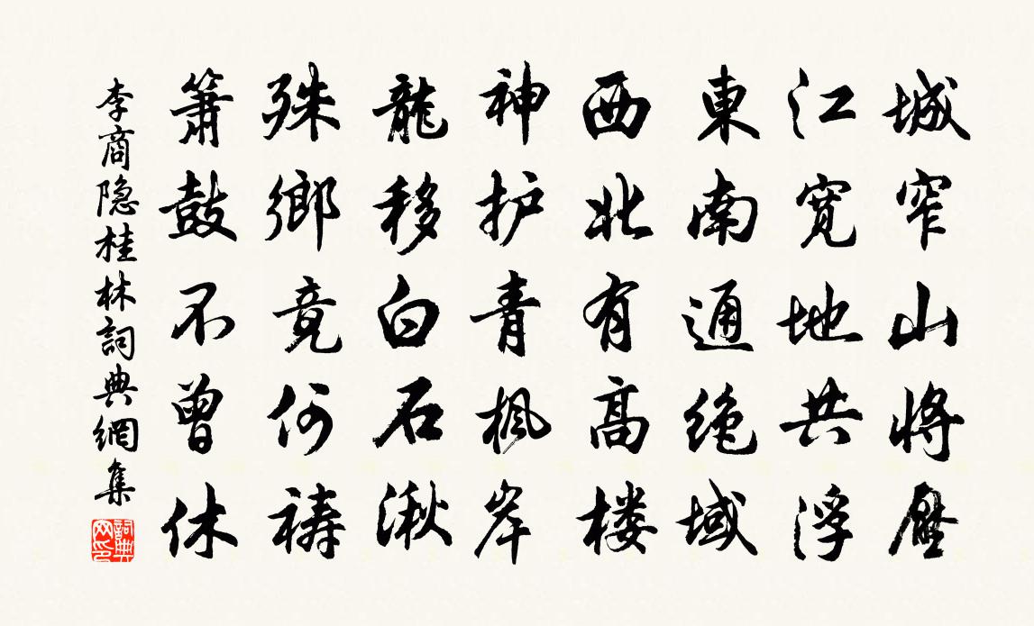 前四句用描述語,點出桂林城窄、江寬、東面、西北、高樓,把桂林這座小城的景致淋漓盡致的烘託了出來。後兩句是前兩句的延續,在讀者的眼裡,一層層展現桂林這個“山水在城中,城在山水旁”的山鄉水域那獨特的自然環境。