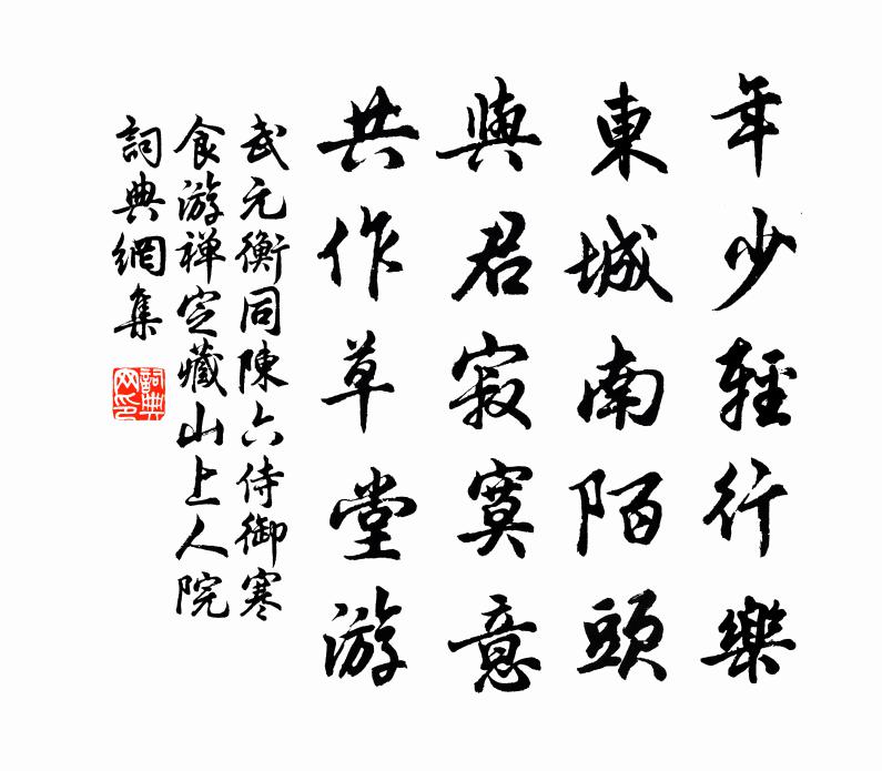 詩詞名句歷史字典書法欣賞書法字典國語詞典說文解字康熙字典古漢語字典標 題 作 者 詩 句 同陳六侍禦寒食游禪定藏山上人院作者:武元衡 朝代:唐代原文年少輕行樂,東城南陌頭。與君寂寞意,共作草堂游。詩詞問答問:《同陳六侍禦寒食游禪定藏山上人院》的作者是誰?答:武元衡問:該詩寫於哪個朝代?答:唐代問:該詩是什麼體裁?答:五絕書法欣賞同陳六侍禦寒食游禪定藏山上人院書法作品注釋全唐詩:卷317-50詩詞推薦盧溪主人王昌齡〔唐代〕武陵溪口駐扁舟,溪水隨君向北流。行到荊門上三峽,莫將孤月對猿愁。八月五日,偕錢唐王現、海昌李勛、大梁滑人楊維楨〔元代〕十年不踏瑪瑙石,今日重登口子峰。外湖水繞玉螮蝀,里湖水浸金芙蓉。崔老題詩欲招鶴,生公說法善降龍。浮雲示黃岡長老二絕胡寅〔宋代〕歸興逢山便解頤,上人多思乞留詩。千若萬壑經行處,他日煩師覓舊題。求紙衾謝枋得〔宋代〕避世知無地,危身只信天。寧持龔勝扇,不著挺之錦。養性真同道,知心有宿緣。紙衾加惠絮,晴日臥雲邊。懷錢德鈞陳深〔宋代〕城南寒徒侶,錢子數來過。翰墨相娛玩,文章互切磨。交遊常不厭,間闊竟如何。風雨懷君夜,空齋秋思多。將抵家遇雨鄭會〔宋代〕遄車偏值雨連天,疲馬難支又上船。樹杪鴉兵催急棹,渡頭漁火鎖寒煙。論心知己期將近,念子慈親望久懸。自笑雪後葛天民〔宋代〕冷蕊通幽信,孤山欠幾遭。杯因寒更滿,句到淡方高。雪滴晴檐雨,松翻夜壑濤。布衾雖似鐵,猶念早趨朝。水聲宋祁〔宋代〕淙波聲可愛,最與靜相宜。激射不平處,潺湲無罷時。擁花含驟咽,礙石濺空危。便作山林趣,寧妨吏隱師。如夢令向滈〔宋代〕廝守許多時價。誰信一籌不畫。相送到礬園,贏得淚珠如瀉。揮灑。揮灑。將底江州司馬。次卓仁夫元宵雪中三絕胡仲弓〔宋代〕繡簾直下整雲鬟,歌舞叢中強自懽。興盡歸來太多事,不如高臥學袁安。贈傳神者鄭剛中〔宋代〕我向無中生出妄,君從妄里卻求真。葫蘆可畫雖依本,阿堵知君畫不親。登南樓二首吳芾〔宋代〕新敞南樓百尺雄,一溪遙跨兩長虹。青山疊疊登臨外,碧瓦鱗鱗指顧中。倦客自憐如倦翼,歸心長是逐歸鴻。憑高題平亭李訦〔宋代〕鍬公有記記蠻平,蠻不難平將貴精。勉矣諸君修將業,請將平安作亭名。題墨梅圖王冕〔元代〕朔風吹寒冰作壘,梅花枝上春如海。清香散作天下春,草木無名藉光彩。長林大谷月色新,枝南枝北清無塵。廣平句薛舜俞〔宋代〕舊邑浮航外。己丑元日歸莊〔清代〕四年絕域度新正,此夕空將兩目瞠。天下興亡憑揲策,一身進退類懸旌。商君法令牛毛細,王莽征徭魚尾赬。不信梅花絕句陸游〔宋代〕亂篸桐帽花如雪,斜掛驢鞍酒滿壺。安得丹青如顧陸,憑渠畫我夜歸圖?同曹清父西郊紀事五首方回〔宋代〕朴略童蒙學,堆豗句讀師。有能致卿相,或不贍妻兒。士故無他業,人誰此味知。公庭彼為吏,日日醉歌姬。游洞霄李彙〔宋代〕至真方域古今傳,琳館興從漢武年。石作雙門何突兀,山為九鎖自迴環。仙人隱跡留中路,處士靈壇閟遠巔。甘潔和顏伯武丈山寺晃沖之〔宋代〕松門石磴隱山家,鐘鼓蕭然一院花。齋罷老僧來施食,階前馴雀趁飢鴉。名句推薦無人知此意,歌罷滿簾風。陳與義《臨江仙·高詠楚詞酬午日》 遇酒且呵呵,人生能幾何!韋莊《菩薩蠻·勸君今夜須沈醉》 聞君有兩意,故來相決絕。卓文君《白頭吟》 萬一禪關砉然破,美人如玉劍如虹。龔自珍《夜坐二首》 從心所欲,不逾矩。孔子弟子《論語·為政篇》 夜來攜手夢同游,晨起盈巾淚莫收。白居易《夢微之》 水色淥且明,令人思鏡湖。李白《登單父陶少府半月台》 父子竭力山成玉,弟兄同心土變金。佚名《增廣賢文·下集》 富貴多憂,貧窮自在。佚名《增廣賢文·上集》 黃花深巷,紅葉低窗,淒涼一片秋聲。蔣捷《聲聲慢·秋聲》