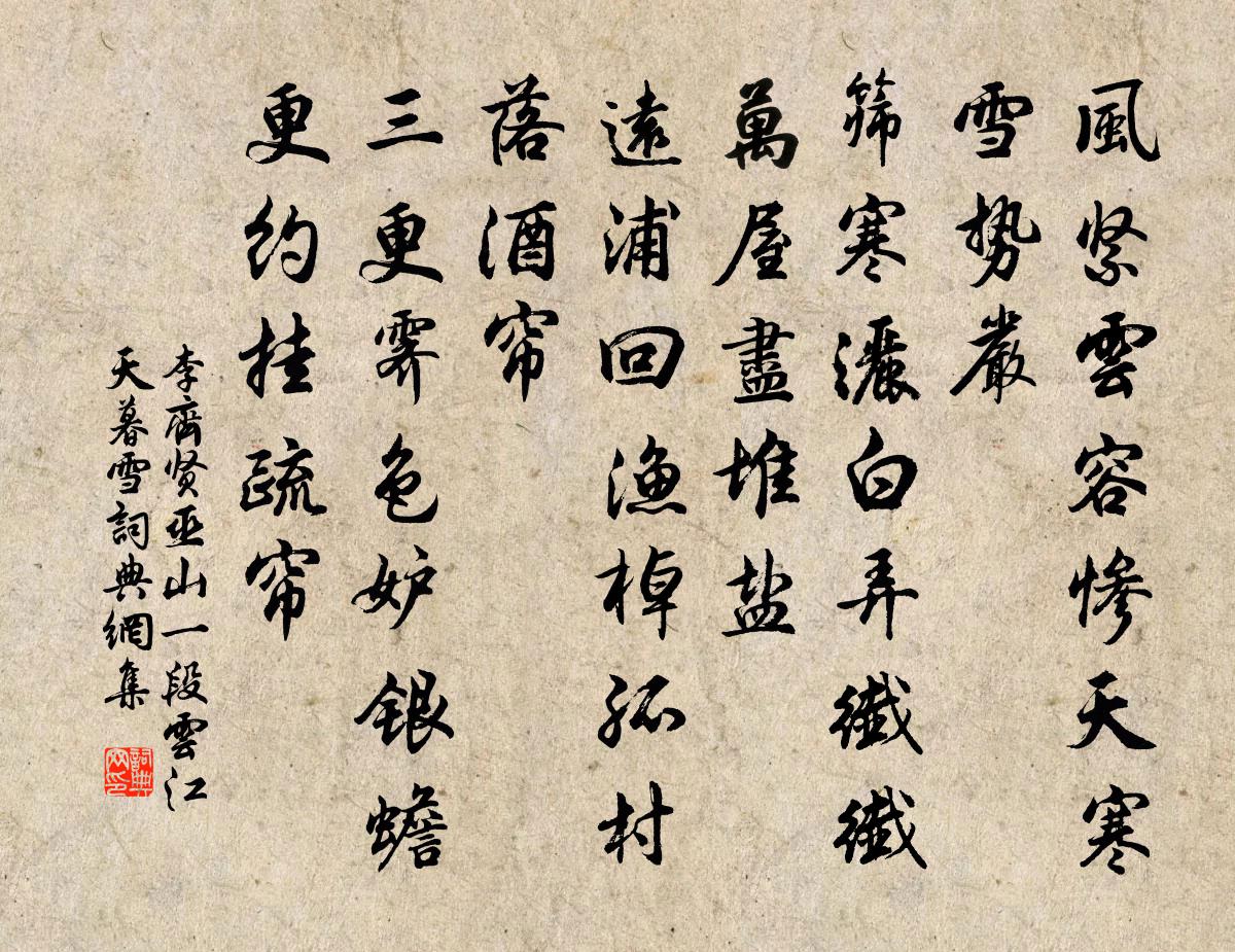 詩詞名句歷史字典書法欣賞書法字典國語詞典說文解字康熙字典古漢語字典標 題 作 者 詩 句 巫山一段雲 江天暮雪作者:李齊賢 朝代:元代巫山一段雲 江天暮雪原文風緊雲容慘,天寒雪勢嚴。篩寒灑白弄纖纖。萬屋盡堆鹽。遠浦回漁棹,孤村落酒帘。三更霽色妒銀蟾。更約掛疏簾。詩詞問答問:巫山一段雲 江天暮雪的作者是誰?答:李齊賢問:巫山一段雲 江天暮雪寫於哪個朝代?答:元代問:巫山一段雲 江天暮雪是什麼體裁?答:詞李齊賢巫山一段雲 江天暮雪書法欣賞巫山一段雲 江天暮雪書法作品詩詞推薦題毛霆甫詩集文天祥〔宋代〕英英白雲,在澗之濆。彼美人兮,其德孔純。春日陳元晉〔宋代〕金旛勝里喚春歸,卻後新正八日期。紅紫莫嫌春較晚,開遲應是落還遲。邇英閣早直鄭獬〔宋代〕綠樹蔭修廊,雲深別殿涼。星文開帝座,玉色泛天光。大典尊周孔,名家盛漢唐。自憐攜釣手,持筆翠旒旁。八十一吟陸游〔宋代〕八十古雲耄,吾今不啻過。山程雨芒屩,水宿一漁蓑。雞唱劉琨舞,牛疲甯戚歌。春寒欺短褐,將奈此翁何!反賈客樂(樂府有賈客樂,今反之)劉駕〔唐代〕無言賈客樂,賈客多無墓。行舟觸風浪,盡入魚腹去。農夫更苦辛,所以羨爾身。雜曲歌辭樂世白居易〔唐代〕管急絲繁拍漸稠,綠腰宛轉曲終頭。誠知樂世聲聲樂,老病人聽未免愁。呈朱叢瑞陳起〔宋代〕囊中五色絲,擬將舜裳補。玉階遠於天,莫睹乾戚舞。治朝足文物,一室自規矩。少賤人或欺,黔婁況貧窶。毋作陝下投姚諫議李頻〔唐代〕舊業在東鄙,西遊從楚荊。風雷幾夜坐,山水半年行。夢永秋燈滅,吟孤曉露明。前心若不遂,有恥卻歸耕。中秋雨過月出曹勛〔宋代〕欲遣清風掃亂雲,先將一雨淨游塵。今年大作中秋事,月色何孤我輩人。照卻信方還剩在,看來千古許清新。不眠哀倪孟容父詞王柏〔宋代〕憶昔見公兮,季原之堂。兄弟怡怡兮,清約是將。藹子姓之弦歌兮,頭角昂昂。來者起敬兮,知德義之日昌。造化曲江野眺釋紹嵩〔宋代〕偶來清賞曲江頭,人自無言水自流。欲作新詩圖畫取,亂峰寒木更孤舟。靜台余靖〔宋代〕江城吏隱敞朱扉,旋築高台望翠微。景對雲山詩筆健,政移風俗訟筩稀。那將塵慮乾方寸,但覺仙蹤在四圍。花木隴頭水(一作吟)於濆〔唐代〕行人何彷徨,隴頭水嗚咽。寒沙戰鬼愁,白骨風霜切。薄日朦朧秋,怨氣陰雲結。殺成邊將名,名著生靈滅。偈頌一百零二首釋慧遠〔宋代〕門外春將半,岩花帶雨開。信從天外至,人自日邊來。虎嘯風生谷,龍吟霧滿腮。相逢眉蓋眼,平地舞三台。南歌子(春暮送別)趙長卿〔宋代〕枝上紅飛盡,梢頭綠已勻。遊絲柳絮媚青春。向晚暖風簾幕、練光新。春已匆匆去,那堪話別情。劉郎幾日便登程淳熙四年二月既望靜江守臣張某奉詔勸農於郊張栻〔宋代〕嗟爾父老,其訓其誡。俾務於本,惟土物愛。送覺新上人還越周弼〔宋代〕古越多精藍,名僧遞相接。青林瓶盂聚,丹壑樓觀疊。今乘秋濤便,莫待寒雨涉。何處聞鳴蛩,虛廊掃黃葉。奉和聖制行次成皋應制張說〔唐代〕夏氏階隋亂,自言河朔雄。王師進谷水,兵氣臨山東。前掃成皋陣,卻下洛陽宮。義合帝圖起,威加天宇同。軒台題畫馬圖李復〔宋代〕龍種天駒產渥窪,五雲毛色散成花。瑤池一去無訊息,只許丹青紙上夸。晝居池上亭獨吟劉禹錫〔唐代〕日午樹陰正,獨吟池上亭。靜看蜂教誨,閒想鶴儀形。法酒調神氣,清琴入性靈。浩然機已息,几杖復何銘。名句推薦國家將興,必有禎祥;國家將亡,必有妖孽。子思《中庸·第二十四章》 誰憐散髻吹笙,天涯芳草關情。納蘭性德《清平樂·孤花片葉》 人去空流水,花飛半掩門。秦觀《南歌子·香墨彎彎畫》 劍花寒,夜坐歸心壯,又是他鄉。張可久《滿庭芳·客中九日》 機不密,禍先行。馮夢龍《醒世恆言·卷二十》 別夢依稀咒逝川,故園三十二年前。 * 《七律·到韶山》 滿川風雨獨憑欄,綰結湘娥十二鬟。黃庭堅《雨中登岳陽樓望君山》 春山碧樹秋重綠,人在武陵溪。劉基《眼兒媚·秋思》 隰桑有阿,其葉有幽。佚名《隰桑》 玉露凋傷楓樹林,巫山巫峽氣蕭森杜甫《秋興八首·其一》