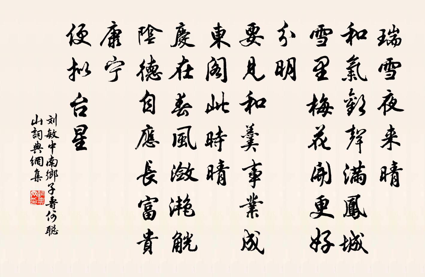 詩詞名句歷史字典書法欣賞書法字典國語詞典說文解字康熙字典古漢語字典標 題 作 者 詩 句 南鄉子 壽何聰山作者:劉敏中 朝代:元代南鄉子 壽何聰山原文瑞雪夜來晴。和氣歡聲滿鳳城。雪裡梅花開更好,分明。要見和羹事業成。東閣此時晴。慶在春風瀲灩觥。陰德自應長富貴,康寧。便擬台星詩詞問答問:南鄉子 壽何聰山的作者是誰?答:劉敏中問:南鄉子 壽何聰山寫於哪個朝代?答:元代問:南鄉子 壽何聰山是什麼體裁?答:詞劉敏中南鄉子 壽何聰山書法欣賞南鄉子 壽何聰山書法作品詩詞推薦摸魚兒·午日雨眺納蘭性德〔清代〕漲痕添、半篙柔綠,蒲梢荇葉無數。台榭空濛煙柳暗,白鳥銜魚欲舞。紅橋路,正一派、畫船蕭鼓中流住。嘔啞柔執契靜三邊李世民〔唐代〕執契靜三邊,持衡臨萬姓。玉彩輝關燭,金華流日鏡。無為宇宙清,有美璇璣正。皎佩星連景,飄衣雲結慶。戢武次韻四明孫常州陳著〔宋代〕忽忽光陰日隙塵,回頭十載兩襟分。聽經偶枉真人駕,過首猶懷處士墳。危世清風誰一面,青山啼鳥自相聞。殷勤游清潭呂資益蟠谷絕清潭劉過〔宋代〕一潭清淨水無泥,潭岩無泥石更奇。擬待月明垂釣去,前溪雨足怕龍歸。折齒歌羅椅〔宋代〕春衫未成錦機語,棠棣半花鳳一羽。象床雪綜小龍梭,細穴銀光吐冰縷。西鄰郎君東海歸,芙蓉露白杏雨肥。十二留行都陳造〔宋代〕久飫南來飯,長維北去船。薰衣子笑韻,入箸望潮鮮。意適忘漂泛,吾生計食眠。歸期何用數,寬待藕花天。挽葛簽判二首劉宰〔宋代〕先帝龍飛第一春,霜袍濟濟對嚴長。祗今舊侶能多少,又對西風哭此人。赴撫州對酬崔法曹夜雨滴空階五首戴叔倫〔唐代〕雨落濕孤客,心驚比棲鳥。空階夜滴繁,相亂應到曉。高會棗樹宅,清言蓮社僧。兩鄉同夜雨,旅館又無燈。謗議浪淘沙近宋祁〔宋代〕少年不管。流光如箭。因循不覺韶光換。至如今,始惜月滿、花滿、酒滿。扁舟欲解垂楊岸。尚同歡宴。日斜歌闋甲辰入京春深猶雪和吳{左山右肅}岩二首朱南傑〔宋代〕掀髯論時事,莫問是邪非。綠句池邊得,青陽柳外歸。夜深嫌薄酒,春淺怯單衣。門巷雪撩亂,低頭且掩扉。壽廣東陶漕徐泳〔宋代〕一幅飄飄漉酒巾,冰髯霜鬢兩清新。欲知冠冕都無意,自是羲皇上上人。明進士北齋避暑貫休〔唐代〕相訪多衝雨,由來德有鄰。捲簾繁暑退,濕樹一蟬新。道在誰為主,吾衰自有因。只應江海上,還作狎鷗人。奉陪侍中游石筍溪十二韻盧綸〔唐代〕朝日照靈山,山溪浩紛錯。圖書無舊記,鯀禹應新鑿。雙壁瀉天河,一峰吐蓮萼。潭心亂雪卷,岩腹繁珠落。彩蛤玉樓春(和李宜仲)王之道〔宋代〕少年心性消磨盡。三斗爛腸渾是悶。看書聊復強尋行,屬句不妨閒趁韻。此生自斷天休問。富貴時來還有分。一卮秋懷十首陳師道〔宋代〕籊籊孤竹君,長我一身半。凜然霜雪間,時至亦陰換。共與王子猷,永結忘言伴。可使溪壑姿,充我眼中玩。至論吟邵雍〔宋代〕民於萬物已稱珍,聖向民中更出群。介石不疑何盡日,知幾何患未如神。若無剛果難成善,既有精明又貴純。禍福君子吟邵雍〔宋代〕君子之去,亦如其來。小人之來,亦如其雲。既有恩情,且無怨怒。既有僧嫌,且無思慕。禽言十詠著新脫故姚勉〔宋代〕繰車欲動蠶春暮,水足秧青行白鷺。著新脫故山禽呼,也似催人闊耕布。著新脫故也自奇,闊耕闊布也自宜。冬苗送福昌周繇少府歸寧兼謀隱杜荀鶴〔唐代〕少見古人無遠慮,如君真得古人情。登科作尉官雖小,避世安親祿已榮。一路水雲生隱思,幾山猿鳥認吟聲。知君姑蘇泛月一首王阮〔宋代〕夜來誰共泛靈槎,飛上牽牛織女家。但覺滿身天雨露,絕無一點世塵沙。秋將寒玉清風陣,月借鎔銀潑浪花。投曉名句推薦救寒莫如重裘,止謗莫如自修。司馬光《資治通鑑·魏紀五》 強整繡衾,獨掩朱扉,枕簟為誰鋪設。阮逸女《花心動·春詞》 水至清則無魚,人太急則無智。佚名《增廣賢文·上集》 短景歸秋,吟思又接愁邊。史達祖《玉蝴蝶·晚雨未摧宮樹》 雪雰雰而薄木兮,雲霏霏而隕集。劉向《九嘆》 秋風蕭瑟天氣涼,草木搖落露為霜,群燕辭歸鵠南翔。曹丕《燕歌行二首·其一》 意少一字則義闕,句長一言則辭妨劉勰《文心雕龍·書記》 遠看山有色,近聽水無聲王維《畫》 兒童散學歸來早,忙趁東風放紙鳶。高鼎《村居》 行路難,不在水,不在山,只在人情反覆間。白居易《太行路》