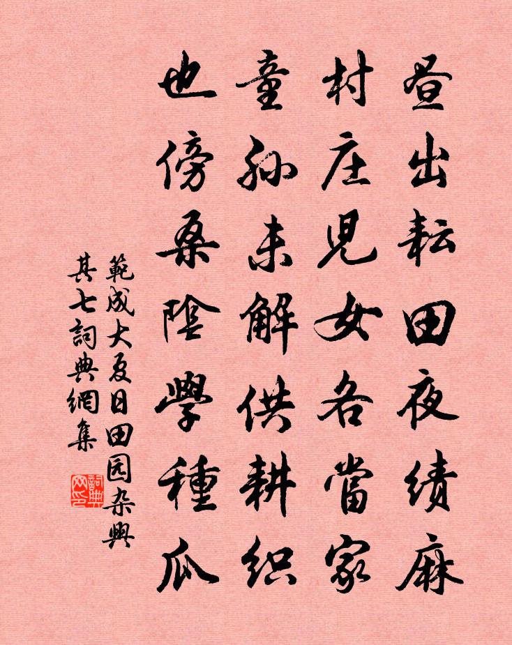 首句“晝出耘田夜績麻”是說:白天下田去除草,晚上搓麻線。“耘田”即除草。初夏,水稻田裡秧苗需要除草了。這是男人們幹的活。“績麻”是指婦女們在白天干完別的活後,晚上就搓麻線,再織成布。這句直接寫勞動場面。次句“村莊兒女各當家”,“兒女”即男女,全詩用老農的口氣,“兒女”也就是指年輕人。“當家”指男女都不得閒,各司其事,各管一行。第三句“童孫未解供耕織”,“童孫”指那些孩子們,他們不會耕也不會織,卻也不閒著。他們從小耳濡目染,喜愛勞動,於是“也傍桑陰學種瓜”,也就在茂盛成陰的桑樹底下學種瓜。這是農村中常見的現象,卻頗有特色。結句表現了農村兒童的天真情趣。