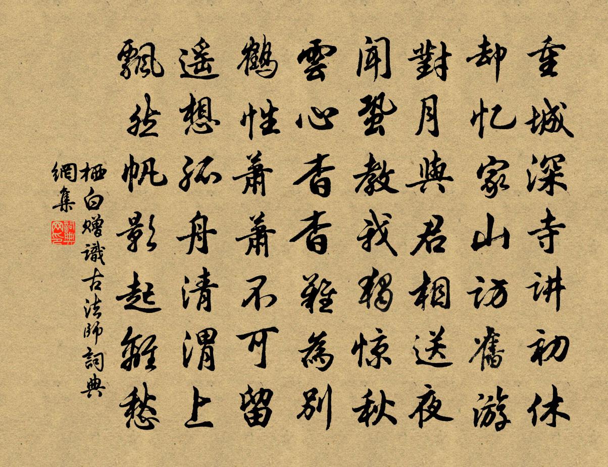 詩詞名句歷史字典書法欣賞書法字典國語詞典說文解字康熙字典古漢語字典標 題 作 者 詩 句 贈識古法師作者:棲白 朝代:唐代贈識古法師原文重城深寺講初休,卻憶家山訪舊遊。對月與君相送夜,聞蛩教我獨驚秋。雲心杳杳難為別,鶴性蕭蕭不可留。遙想孤舟清渭上,飄然帆影起離愁。詩詞問答問:贈識古法師的作者是誰?答:棲白問:贈識古法師寫於哪個朝代?答:唐代問:贈識古法師是什麼體裁?答:七律棲白贈識古法師書法欣賞贈識古法師書法作品注釋全唐詩:卷823-24詩詞推薦偈頌一百零九首釋可湘〔宋代〕打牛即是,打車即是。一種無弦琴,彈落知音耳。委不委,曹娥讀夜碑,且較三十里。登峴首阻雨楊時〔宋代〕江風飛雨上雕欄,庭樹蕭蕭影自閒。向晚微雲遮不盡,好山渾在有無間。自賀陸游〔宋代〕胎髮茸茸綠映巾,歸耕猶是太平民。流觴內史招同社,扛鼎將軍與卜鄰。曾冠六鰲非俗吏,已開九秩是陳人。一杯又和洪司令春日吳泳〔宋代〕房湖曾別苦吟身,兩度東風似一塵。柳外遊絲難系日,麥邊馴雉亦驚春。玄都君子皆通貴,栗里先生只一貧。珍重松齋自題 時為翰林學士。白居易〔唐代〕非老亦非少,年過三紀余。非賤亦非貴,朝登一命初。才小分易足,心寬體長舒。充腸皆美食,容膝即安居。況此次韻子瞻題長安王氏中隱堂五首蘇轍〔宋代〕秦中勝岷蜀,故國不須歸。甲第春風滿,巴山晝夢非。竹深啼鳥亂,花落晚蜂飛。我欲西還去,敲門慎勿違。唐朝雪竇道中樓鑰〔宋代〕城居久矣厭塵勞,來訪名山寫鬱陶。客路行隨流水遠,征人與坐白雲高。千林舞翠吹蓬鬢,二麥搖青照紵袍。努力步步嬌佚名〔宋代〕俺在炕上坐。唱個*哩*。因來睡一覺,如何。俺把陰陽顛倒過。俺笑俺笑你,空坐。送王西樞出鎮鄭圃八首之三賀鑄〔宋代〕公論由來重,高懷此去輕。吾非厚知己,感嘆此蒼生。送秦秘監以顯謨知潼川魏了翁〔宋代〕杜侯歸未幾,又送秦侯歸。錦衣赫相望,里閈生光輝。僅存二三士,去意不可羈。王張屢乞身,余亦五請祠。豈不周五聲調曲 宮調曲 三庾信〔南北朝〕握衡平地紀。觀象正天樞。祺祥鍾赤縣。靈瑞炳皇都。更受昭華玉。還披蘭葉圖。金波來白兔。弱木下蒼烏。玉斗宿洪岩寺艾性夫〔宋代〕形枯面冷住山人,仿佛錢塘老惠勤。寺窶不充黃粟飯,佛寒添繡碧苔紋。秋聲茅屋三間雨,野色松岩幾樹雲。嚼菜木蘭花慢 己未十月十七日壽溪月真人張雨〔元代〕試瑤台借雪,春意早,滿林巒。笑東老殷勤,能傾家釀,與盡清歡。曾因求賢把詔,便朗吟、湓浦又廬山。自愛西柳枝文同〔宋代〕牆宇周回院落深,日光風色淨陰陰。柔條一似孫荊玉,貼地反腰銜寶簪。燭影搖紅(隔窗聞歌)張炎〔宋代〕閒苑深迷,趁香隨粉都行遍。隔窗花氣暖扶春,只許鶯鶯占。燭焰晴烘醉臉。想東鄰、 * 笑眼。欲尋無處,暗掐風雨終夜獨坐不寐蒲壽宬〔宋代〕風雨瀟瀟到夜終,夜寒一室坐虛空。何當樂與二三子,免使淒其六一翁。老大自甘為老大,窮通休苦較窮通。此心游紫霄宮七言八句白居易〔唐代〕水洗塵埃道味甞,甘於名利相相忘。心懷天洞丹霞客,各誦三清紫府章。早里採蓮歌達旦,一輪明月桂飄香。日高遇風雨作(一作權德輿詩)皇甫曾〔唐代〕草草理夜裝,涉江又登入。望路殊未窮,指期今已促。傳呼戒徒馭,振轡轉林麓。陰雲擁岩端,沾雨當山腹。震雷送安惇秀才失解西歸蘇軾〔宋代〕舊書不厭百回讀,熟讀深思子自知。他年名宦恐不免,今日棲遲那可追。我昔家居斷還往,著書不復窺園葵。朅來定風波慢佚名〔宋代〕漏新春、訊息前村,數枝楚梅輕綻。□雪艷精神,冰膚淡佇,姑射依稀見。冷香凝,金蕊淺。青女饒伊妒無限。堪名句推薦喜遇重陽,更佳釀今朝新熟。宋江《滿江紅·喜遇重陽》 反聽之謂聰,內視之謂明,自勝之謂強。司馬遷《史記·商君列傳》 試問梅花何處好,與君藉草攜壺。張孝祥《臨江仙·試問梅花何處好》 飛鴻過也。萬結愁腸無晝夜。蔣氏女《減字木蘭花·題雄州驛》 螢飛秋窗滿,月度霜閨遲。李白《塞下曲六首》 利之中取大,害之中取小。墨子《墨子·44章 大取》 滿則慮嗛,平則慮險,安則慮危荀子《荀子·仲尼》 酒入愁腸,化作相思淚。范仲淹《蘇幕遮·懷舊》 粽包分兩髻,艾束著危冠。陸游《乙卯重五詩》 有才必韜藏,如渾金璞玉,暗然而日章也王永彬《圍爐夜話·第十四則》