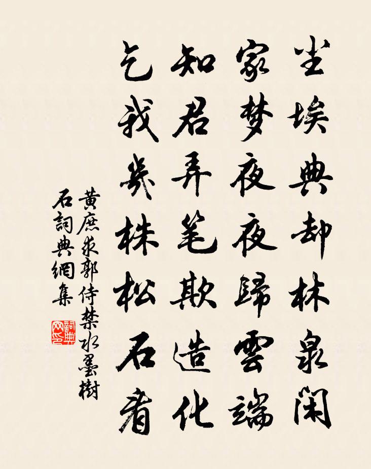 詩詞名句歷史字典書法欣賞書法字典國語詞典說文解字康熙字典古漢語字典標 題 作 者 詩 句 求郭侍禁水墨樹石作者:黃庶 朝代:宋代求郭侍禁水墨樹石原文塵埃典卻林泉閒,家夢夜夜歸雲端。知君弄筆欺造化,乞我幾株松石看。詩詞問答問:求郭侍禁水墨樹石的作者是誰?答:黃庶問:求郭侍禁水墨樹石寫於哪個朝代?答:宋代黃庶求郭侍禁水墨樹石書法欣賞求郭侍禁水墨樹石書法作品詩詞推薦夾竹桃湯清伯〔宋代〕芳姿勁節本來同,綠蔭紅妝一樣濃。我若化龍君作浪,信知何處不相逢。庭雨應詔詩沈約〔南北朝〕出空寧可圖。入庭位難賦。非煙復非雲。如絲復如霧。霢霂裁欲垂。霏微不能注。雖無千金質。聊為一辰趣。旌德觀鄭清之〔宋代〕瀛丈移從弱水間,君恩泮奐得躋攀。茗香壺酒成三事,巾褐枝筇占獨班。培勝亦能充道勝,官閒何似在家閒。玄都句孫月境〔宋代〕莫欺春到荼醾盡,更有楊花落後飛。八聲甘州(雁)劉克莊〔宋代〕物微生處遠,往還來、非但稻粱求。似愛長安日,怕陰山雪,善自為謀。個裡幸無鳴鏑,隨意占沙洲。歸興何妨待笙張祜〔唐代〕董雙成一妙,歷歷韻風篁。清露鶴聲遠,碧雲仙吹長。氣侵銀項濕,膏胤漆瓢香。曲罷不知處,巫山空夕陽。和程刑部三首清漣閤王周〔唐代〕照影翻窗綺,層紋滉額波。絲青迷岸柳,茸綠蘸汀莎。片雪翹飢鷺,孤香卷嫩荷。憑欄堪入畫,時聽竹枝歌。十九日歸洛城路游龍門邵雍〔宋代〕伊川往復過龍山,每過龍山意且閒。莫道移人不由境,可堪深著利名閒。悼虎丘枯椿和尚釋了惠〔宋代〕華雨台前倒法幢,海門浪裹釘枯椿。千古萬古撼不動,礙塞潑天揚子江。客行許棠〔唐代〕旅食唯草草,此生誰我同。故園魂夢外,長路別離中。人事萍隨水,年光鳥過空。欲吟先落淚,多是怨途窮。酬集賢劉郎中對月見寄兼懷元浙東白居易〔唐代〕月在洛陽天,天高淨如水。下有白頭人,攬衣中夜起。思遠鏡亭上,光深書殿里。眇然三處心,相去各千里。蓮生丘葵〔宋代〕蓮生污泥中,其葉何鬱郁。人生有恆性,雲胡蔽於欲。寄漫客汪子美兼簡竹牖東美吳錫疇〔宋代〕雁斷無書到筆峰,暮雲空自滿江東。漫郎一片襟期杳,子美三生習氣同。身外有貲惟老硯,竹邊無價是清風。何時向以書戲邦衡雲某自廬山游西山當就迎公召節周必大〔宋代〕慧遠遙同社,洪崖近拍肩。松枝年紀萬,棐實歲逾千。徑欲通天漢,忙因棹酒船。午城均一握,易地即皆然。小重山黃鑄〔宋代〕涼入秋檐雨意長。竹深啼絡緯,響虛堂。一枝燈影耿昏黃。疏簾外,風度木樨香。心事易成傷。燕支坡下路,語如龍陽縣歌劉禹錫〔唐代〕縣門白日無塵土,百姓縣前挽魚罟。主人引客登大堤,小兒縱觀黃犬怒。鷓鴣驚鳴繞籬落,橘柚垂芳照窗戶。沙平雜歌謠辭。李夫人歌李商隱〔唐代〕一帶不結心,兩股方安髻。慚愧白茅人,月沒教星替。剩結茱萸枝,多擘秋蓮的。獨自有波光,彩囊盛不得。蠻絲冬夜讀書陸游〔宋代〕平生喜藏書,拱璧未為寶!歸來稽山下,爛漫恣探討。六經萬世眼,守此可以老。多聞竟何用,綺語期一掃。幽居石門陸游〔宋代〕昔讀康樂詩,夢到石門山。中有醉道士,倒珮落其冠。來游一一是,嵌岩如屋寬。噴薄三百尺,萬珠落珊珊。峭壁送禪客入高峰李處權〔宋代〕茫茫人間世,佛法最長久。山林坐九年,面壁不掛口。須是丈夫兒,懸崖能撒手。為語學道人,何須天下走。夜寒名句推薦念碎劈芳心,縈思千縷,贈將幽素,偷翦重雲。吳文英《風流子·黃鐘商芍藥》 夫謀必素見成事焉,而後履之左丘明《國語·吳語·越王勾踐命諸稽郢行成於吳》 文人之筆,勸善懲惡也。王充《論衡·卷二十·佚文篇》 滿地黃花堆積。憔悴損,如今有誰堪摘?李清照《聲聲慢·尋尋覓覓》 三山半落青天外,二水中分白鷺洲李白《登金陵鳳凰台》 卻將萬字平戎策,換得東家種樹書。辛棄疾《鷓鴣天·有客慨然談功名因追念少年時事戲作》 紅燭背,繡簾垂,夢長君不知。溫庭筠《更漏子·柳絲長》 君思潁水綠,忽復歸嵩岑。李白《送裴十八圖南歸嵩山二首》 不興其藝,不能樂學。戴聖《禮記·學記》 誰念遷客歸來,老大傷名節。李綱《六么令·次韻和賀方回金陵懷古鄱陽席上作》