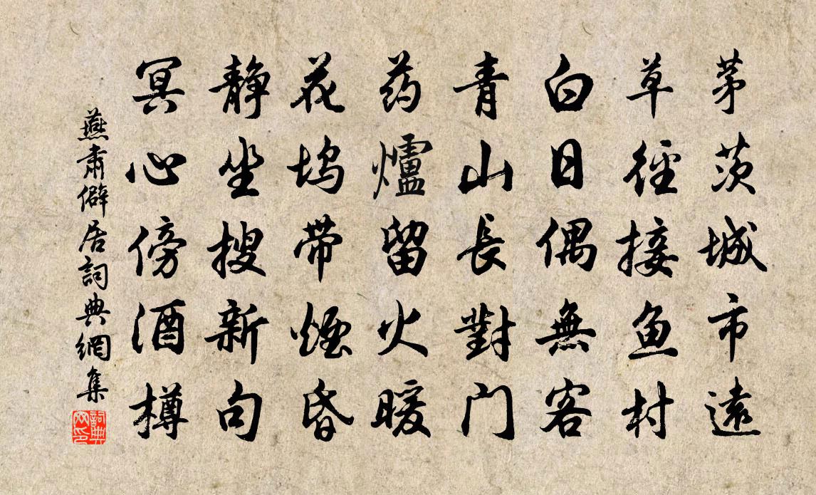 詩詞名句歷史字典書法欣賞書法字典國語詞典說文解字康熙字典古漢語字典標 題 作 者 詩 句 僻居作者:燕肅 朝代:宋代僻居原文茅茨城市遠,草徑接魚村。白日偶無客,青山長對門。藥爐留火暖,花塢帶煙昏。靜坐搜新句,冥心傍酒樽。詩詞問答問:僻居的作者是誰?答:燕肅問:僻居寫於哪個朝代?答:宋代燕肅僻居書法欣賞僻居書法作品詩詞推薦招客白居易〔唐代〕日午微風且暮寒,春風冷峭雪乾殘。碧氈帳下紅爐畔,試為來嘗一盞看。喜雨和轉庵韻蘇泂〔宋代〕香霧騰雲滃鬱蒸,九重精禱格真清。連朝潤澤非凡雨,通國歡呼荷聖情。好句便疑從地涌,勞歌不復和車聲。鵓鳩次韻寄晁以道黃庭堅〔宋代〕河漢牛與女,咫尺不得語。歡然共秋盤,以茲不忘故。我友在天末,問天許見否。雲雨隔九關,日月不我與。念公紹興以後蜡祭四十二首佚名〔宋代〕維後之功,配天其大。祀而稷之,萬世如在。黃冠野服,駿奔皇皇。自古有年,神其降康。江南曲李叔卿〔唐代〕湖上女,江南花,無雙越女春浣紗。風似箭,月如弦,少年吳兒曉進船。郗家子弟謝家郎,烏巾白袷紫香囊。菱歌送京學林申甫姚勉〔宋代〕林飛倦翼已知不,小隱何妨且住山。未始便為長往計,回頭魏闕五雲間。送人還荊州(一作李嘉祐詩)皇甫曾〔唐代〕草色隨驄馬,悠悠同出秦。水傳雲夢曉,山接洞庭春。帆影連三峽,猿聲近四鄰。青門一分手,難見杜陵人。大江東去 壽高伯川王旭〔元代〕月臨南呂,正庭階、開到堯*三葉。風露清明鍾氣質,誕作人間豪傑。器宇宏深,襟靈闊遠,物我俱融徹。滔滔欲題鄭駙馬林亭姚合〔唐代〕東園連宅起,勝事與心期。幽洞自生藥,新篁迸入池。密林行不盡,芳草坐難移。石翠疑無質,鶯歌似有詞。莎台聽袁子方彈琴倪瓚〔元代〕蕙悵凝夕清,高堂流月明。芳琴發綺席,列坐散繁纓。迴翔別鵠意,縹緲孤鸞鳴。一寫冰霜操,掩抑寄余情。感皇恩葛郯〔宋代〕風雨半摧殘,一園花老。綠遍池塘夜來草。看花何處,莫被此花相惱。世間多少事,邯鄲道。憑遠下臨,暗塵飛繞晨起趙蕃〔宋代〕人語村村好,雞聲處處聞。樹猶埋宿雨,山未釋停雲。俯仰夏已度,屈伸秋又分。平生燈火念,牢落嘆離群。賢者之孝二百四十首韋孟林同〔宋代〕去王猶諷諫,懷祖重傷情。誰識有韋孟,人惟說穆生。永安宮汪元量〔宋代〕蜀主遺宮有古槐,頹牆古木鳥喈喈。金輿罷幸荒金屋,玉仗休班廢玉階。三峽浪舂紅日碎,兩岸風振黑雲霾。孔明南歌子陳克〔宋代〕畫幛經梅潤,羅衣尚麥寒。古苔蒼石綠句欄。簾外映花新竹、兩三竿。蠢蠢吳蠶臥,娉娉楚女閒。紅陰角子共嘗酸訊黃乙山於壽寧寺黃敏求〔宋代〕客中聽雨況僧寮,盡日無人訪寂寥。一枕秋聲供痛快,隔窗風裡有芭蕉。走筆代書答西士戴栩〔宋代〕帝城龜百司官事少,故府庭閒長春草。獨餘人事十倍多,一月束龜逾束稿。我於其間厭見之,語可摹龜百不移。深禁火薛逢〔唐代〕日日冒煙塵,忽忽禁火辰。塞榆關水濕,邊草賊回春。歲月傷風邁,瘡痍念苦辛。沙中看白骨,腸斷故鄉人。秋日郊居陸游〔宋代〕兒童冬學鬧比鄰,據案愚儒卻自珍。授罷村書閉門睡,終年不著面看人。嘆老陸游〔宋代〕齒墮因廢談,發短不入把。餘年似殘尊,欲盡不禁瀉。出門見鄉曲,每恨識面寡。往昔同戲兒,累累冢盈野。名句推薦以反求諸己為要法,以言人不善為至戒。胡宏《知言·文王》 水上遊人沙上女,回顧,笑指芭蕉林里住。歐陽炯《南鄉子·畫舸停橈》 知有兒童挑促織,夜深籬落一燈明。葉紹翁《夜書所見》 富貴多憂,貧窮自在。佚名《增廣賢文·上集》 玉帛朝回望帝鄉,烏孫歸去不稱王常建《塞下曲四首·其一》 笑漸不聞聲漸悄,多情卻被無情惱。蘇軾《蝶戀花·春景》 濤瀾洶湧,風雲開闔。蘇轍《黃州快哉亭記》 二月巴陵日日風,春寒未了怯園公。陳與義《春寒》 幾時能命駕,對酒落花前。賈島《清明日園林寄友人》 改章難於造篇,易字艱於代句劉勰《文心雕龍·附會》