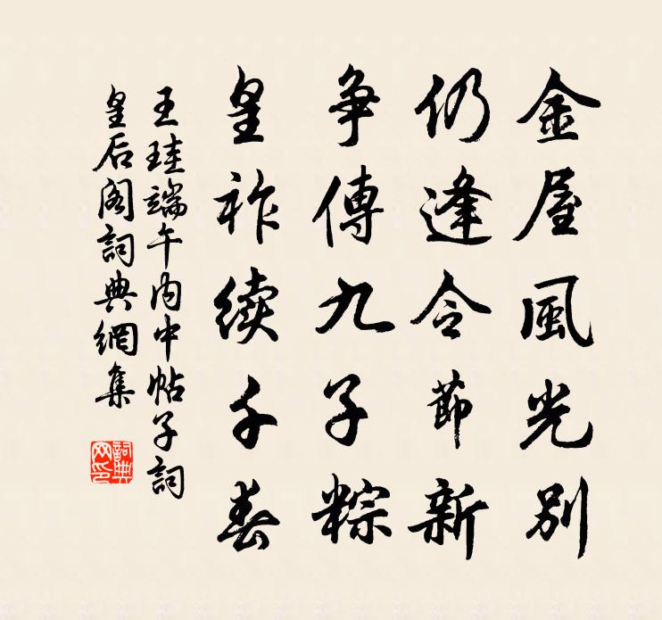 詩詞名句歷史字典書法欣賞書法字典國語詞典說文解字康熙字典古漢語字典標 題 作 者 詩 句 端午內中帖子詞皇后閣作者:王珪 朝代:唐代端午內中帖子詞皇后閣原文金屋風光別,仍逢令節新。爭傳九子粽,皇祚續千春。詩詞問答問:端午內中帖子詞皇后閣的作者是誰?答:王珪問:端午內中帖子詞皇后閣寫於哪個朝代?答:唐代王珪端午內中帖子詞皇后閣書法欣賞端午內中帖子詞皇后閣書法作品詩詞推薦再繼土修三絕王洋〔宋代〕主獻賓酬卒舉觥,禮成賓主不遺榮。自慚館客殊無禮,終又不聞食器聲。寄吳道子王冕〔元代〕三月不見吳道子,十日兩渡錢塘江。詩書壓架自足樂,風月滿壇誰敢降?菖蒲青青繞石壁,薜荔密密緣山窗。歸來新釀熟小酌索笑亭陸游〔宋代〕新酒黃如脫殼鵝,小園持盞暫婆娑。文章不進技止此,仕宦忘歸人謂何。宿業簿書昏病眼,夢遊煙雨濕漁蓑。醉中題窗上詩隔窗鬼〔唐代〕何人窗下讀書聲,南斗闌乾北斗橫。千里思家歸不得,春風腸斷石頭城。摸魚子 明初賦摸魚子壽予,既次其韻,而可許有壬〔元代〕買陂塘旋載楊柳,歸來此是先務。他鄉故里都休校,舊雨不如今雨。鴻在渚。笑爾尚南飛,吾已安孤嶼。黃花解語奉祠太一葛立方〔宋代〕冬冬鼛鼓不勤民,幻出琳宮遠世塵。風咽唄聲金殿邃,日移幡影石壇新。雲軿搖曳來三境,霧帳淒迷妥十神。堪笑偈頌一百二十三首釋崇岳〔宋代〕有句無句,如藤倚樹。築著磕著,了無回互,八臂那吒留不住。南亭寇準〔宋代〕 * 南亭望,清吟露濕衣。雨餘群籟發,天淡數星稀。秋氣又還至,故園猶未歸。虛堂愁重入,燭白冷光微。題黃文叔燕堂劉過〔宋代〕仁宦不愜意,有家胡不歸。林棲烏反哺,梁語燕于飛。鷗鷺忘之久,貂蟬貴者稀。但存慈母健。日日舞斑衣。睡起二首舒邦佐〔宋代〕蝶夢驚回思尚迷,起煎蟹眼試新旗。桃花貼地楊花起,正是江南二月時。偈頌一百四十一首釋師範〔宋代〕過去已過去,未來亦未來,即今名現在,現在安在哉。鷓鴣天(正月十四夜)朱敦儒〔宋代〕鳳燭星球初試燈。冰輪碾破碧稜層。來宵雖道十分滿,未必勝如此夜明。留上客,換瑤觥。任教樓外曉參橫。春風寄題贛簿彭南夫讀書樓二絕周必大〔宋代〕曾門嘗佐虎頭州,濟美人猶羨督郵。三仕今看孫又子,會持麾節繼前修。次韻林芳叔夜雨立春二首陳著〔宋代〕今春第一雨,颯颯打窗紗。莫怪妨鐙節,惟憂釀雪花。報晴俄喜鵲,吠早底嫌蛙。不自知年耄,隨人樂歲華。呈唐德輿兼寄呈可久三首趙蕃〔宋代〕敬作沙隨問,歸來安穩不。一官成棄卻,微恙想今瘳。詩篋猶堪倒,錢囊不用謀。更思從二老,何日具扁舟。題石門奉真觀劉宰〔宋代〕疊障為屏石作門,陰雲漠漠雨昏昏。清游到晚不知去,要上峰頭望曉暾。頌古九十八首釋印肅〔宋代〕沒眼休談見藥山,免將明暗警盲參。特牛生子猶為易,石女生兒豈似凡。孤明獨朗光無二,只恐痴猿攪碧潭。送韓玉汝太傅知洋州三首梅堯臣〔宋代〕函關見殘雪,褎谷聞春禽。禽響通朱輪,馬嘶入青林。花明亂石路,雲抱寒泉岑。天外漢江來,城下漁網沉。庖供聽尹鍊師彈琴吳筠〔唐代〕至樂本太一,幽琴和乾坤。鄭聲久亂雅,此道稀能尊。吾見尹仙翁,伯牙今復存。眾人乘其流,夫子達其源。在山投曾秀州逢四首趙蕃〔宋代〕諸到江西得正宗,後來曾呂出群雄。大陽遺履歸何處,端欲從公一破聾。名句推薦願借天風吹得遠,家家門巷盡成春。李方膺《題畫梅》 忽大風起,塵氣莽莽然,城市依稀而已。蒲松齡《山市》 悲吟雨雪動林木,放書輟劍思高堂。李白《留別於十一兄逖裴十三游塞垣》 紫萸一枝傳賜,夢誰到、漢家陵。姚雲文《紫萸香慢·近重陽》 偏皎潔,知他多少,陰晴圓缺。徐有貞《中秋月·中秋月》 半死梧桐老病身,重泉一念一傷神。白居易《為薛台悼亡》 遮莫圓明似前度,不知誰續廣寒游。慧霖《閏中秋玩月》 河水縈帶,群山糾紛。李華《弔古戰場文》 陌上風光濃處。第一寒梅先吐。李彌遜《十樣花·陌上風光濃處》 敏捷詩千首,飄零酒一杯。杜甫《不見》