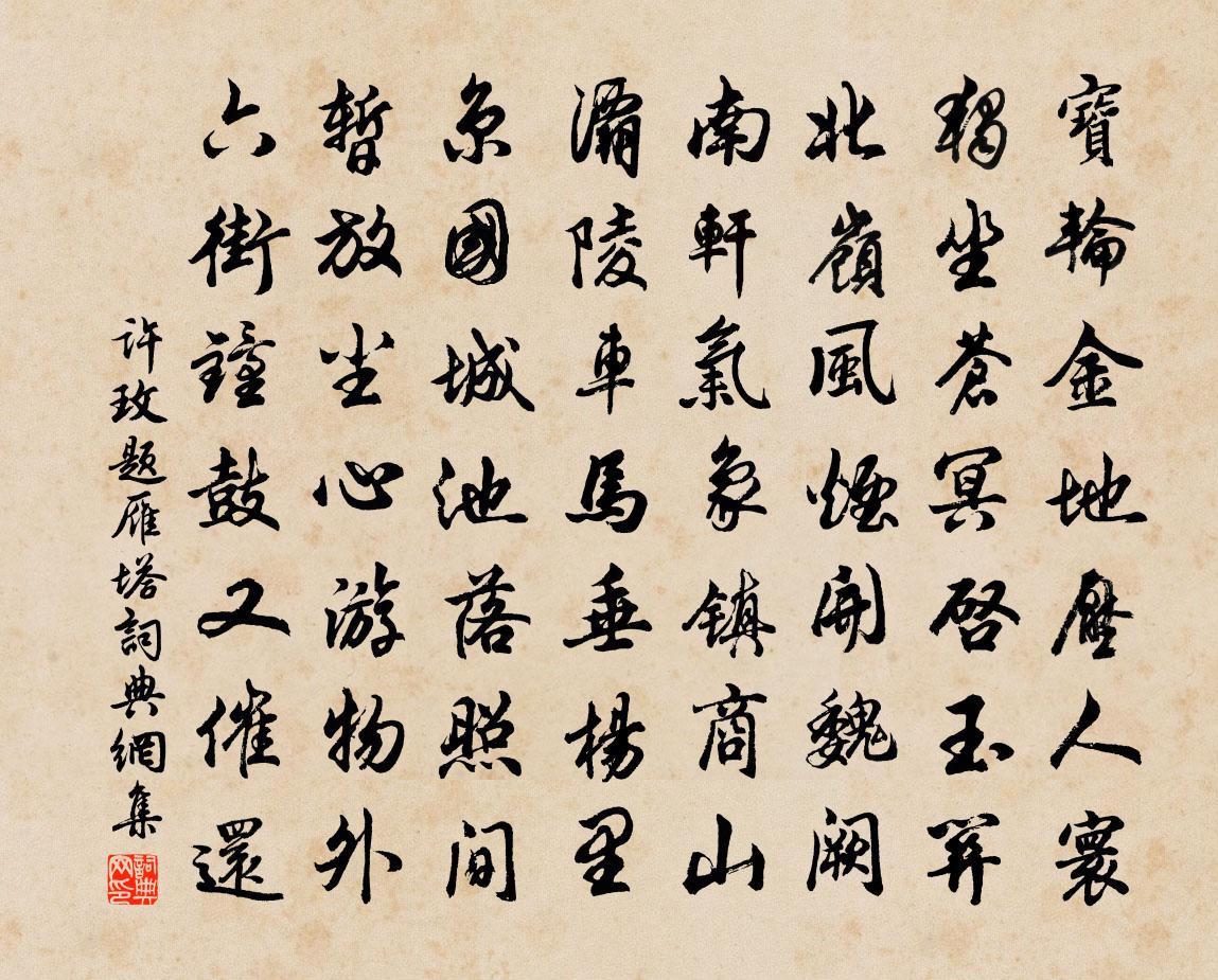 詩詞名句歷史字典書法欣賞書法字典國語詞典說文解字康熙字典古漢語字典標 題 作 者 詩 句 題雁塔作者:許玫 朝代:唐代題雁塔原文寶輪金地壓人寰,獨坐蒼冥啟玉關。北嶺風煙開魏闕,南軒氣象鎮商山。灞陵車馬垂楊里,京國城池落照間。暫放塵心游物外,六街鐘鼓又催還。詩詞問答問:題雁塔的作者是誰?答:許玫問:題雁塔寫於哪個朝代?答:唐代問:題雁塔是什麼體裁?答:七律許玫題雁塔書法欣賞題雁塔書法作品注釋全唐詩:卷516-3詩詞推薦和孔武仲金陵九詠其三鳳凰台蘇轍〔宋代〕鳳鳥久不至,斯台空復高。何年種梧竹,特地翦蓬蒿。白水來無際,青山轉幾遭。南遊且未返,江海共滔滔。觀音大士贊釋道沖〔宋代〕一切音聲相,是人聽以耳。我圜通大士,唯以眼而聽。非物以眼聽,六根互為用。當其互用時,根境不相雜。譬如邊上齊己〔唐代〕漢地從休馬,胡家自牧羊。都來銷帝道,渾不用兵防。草上孤城白,沙翻大漠黃。秋風起邊雁,一一向瀟湘。西風釋文珦〔宋代〕西風吹鬢鬢成霜,變異無端那有常。交友後先同昨夢,老人八十尚他鄉。書空雁字行疎密,泣砌蟲吟韻短長。儘是所聞方回〔宋代〕荷鍤除園棘,鄰翁誦所聞。花開爭共折,草長竟誰耘。薪赭近郊樹,畲燒主墳。問言何至此,軍馬日紛紛。題劉君鼎臣盤谷圖史彌寧〔宋代〕岩壁開張半幅慳,權名人見若為顏。那知別有具丘壑,不在區區紙上山。晝寢陸游〔宋代〕困睫芒羊一欠伸,頹然忽已墮紗巾。鼻端雷動君無怪,路熟華胥不問津。長洲趙嘏〔唐代〕扁舟殊不系,浩蕩路才分。范蠡湖中樹,吳王苑外雲。悲心人望月,獨夜雁離群。明發還驅馬,關城見日曛。奉和聖制送張說上集賢學士賜宴(賦得催字)李暠〔唐代〕偃武堯風接,崇文漢道恢。集賢更內殿,清選自中台。佐命留侯業,詞華博物才。天廚千品降,御酒百壺催。鵷鷺【仙呂】醉中天 嘲人右手三指佚名〔元代〕把盞難舒手,施禮怎合十?虧他朝朝洗麵皮,早是剛拿管筆。便有那舉鼎拔山的氣力,諸般兒都會,怎拿他鞭簡丫陳情晁說之〔宋代〕春風到來久,今日令得行。蛙聲曲池滿,柳色深巷明。負疴老客子,徜徉難為情。豈不懷故隱,盜賊間徂征。近得春夜書懷釋紹嵩〔宋代〕海內艱難各飽更,鬢毛寧與化工爭。春宵思極蘭燈暗,曉角初吹客夢驚。壯思不逢韓吏部,絕交益愧孔方兄。到頭十用喜雨韻三首吳潛〔宋代〕江南九月菊花香,獵子牽黃與臂蒼。歲幸豐登連楚越,地非磽薄比渠涼。雨收甘澤歸三印,雷斂神功入五箱。作解夜飲以白糖嚼梅花楊萬里〔宋代〕剪雪作梅只堪嗅,點蜜如霜新可口。一花自可咽一杯,嚼盡寒花幾杯酒。先生清貧似飢蚊,饞涎流到瘦脛根。贛江次韻王鞏上元見寄三首蘇轍〔宋代〕棄擲良宵君謂何,清天流月鑒初磨。莫辭病眼羞紅燭,且試春衫剪薄羅。蓮艷參差明繡戶,舞腰輕瘦颭驚鼉。少年西江月(道調宮)張先〔宋代〕泛泛春船載樂,溶溶湖水平橋。高鬟照影翠煙搖。白紵一聲雲杪。倦醉天然玉軟,弄妝人惜花嬌。風情遺恨幾時消臨賀別駕李子西同年寄五字詩,以杜句君隨丞楊萬里〔宋代〕謪仙幾代孫,今日臨賀丞。風月三千首,吾子豈未能。長把修月斧,細雕玉壺冰。天池羽翼就,即看垂天鵬。郊廟歌辭。朝日樂章。送神佚名〔唐代〕五齊兼酌,百羞具陳。樂終廣奏,禮畢崇禋。明鑑萬宇,照臨兆人。永流洪慶,式動曦輪。省中橋亭即事項安世〔宋代〕虞閣跨芳沼,陰溪生綠苔。雨晴梅子長,春過芍花開。坐久談微縱,情深首重回。最憐清蔭里,時有細香來。送李中丞之襄州 / 送李中丞歸漢陽別業劉長卿〔唐代〕流落征南將,曾驅十萬師。罷歸無舊業,老去戀明時。獨立三邊靜,輕生一劍知。茫茫江漢上,日暮欲何之。名句推薦黃河萬里觸山動,盤渦轂轉秦地雷。李白《西嶽雲台歌送丹丘子》 綠葉素榮,紛其可喜兮。屈原《九章》 爽口物多終作疾,快心事過必為殃。馮夢龍《喻世明言·卷三》 綠陰不減來時路,添得黃鸝四五聲。曾幾《三衢道中》 方慚不耕者,祿食出閭里。韋應物《觀田家》 明妃一朝西入胡,胡中美女多羞死。李白《于闐採花》 妙極生知,睿哲惟宰。精理為文,秀氣成采。劉勰《文心雕龍·徵聖》 暗暗淡淡紫,融融冶冶黃。李商隱《菊花》 攜籮驅出敢偷閒,雪脛冰須慣忍寒。范成大《雪中聞牆外鬻魚菜者求售之聲甚苦有感》 夢入藍橋,幾點疏星映朱戶。吳文英《荔枝香近·七夕》
