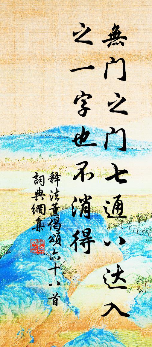 詩詞名句歷史字典書法欣賞書法字典國語詞典說文解字康熙字典古漢語字典標 題 作 者 詩 句 偈頌六十八首作者:釋法薰 朝代:宋代偈頌六十八首原文無門之門,七通八達。入之一字,也不消得。詩詞問答問:偈頌六十八首的作者是誰?答:釋法薰問:偈頌六十八首寫於哪個朝代?答:宋代釋法薰偈頌六十八首書法欣賞偈頌六十八首書法作品詩詞推薦偈二首釋雲賁〔宋代〕一見便見,八角磨盤空晨轉。一得永得,奪錦硃砂如墨黑。秋風吹渭水,已落雲門三句里。落葉滿長安,幾個而今聽箏姜特立〔宋代〕鶢鶋設鐘鼓,固已非所樂。我今對秦箏,聽之亦藐藐。老人難遣日,藉此慰牢落。此意只有知,勿令兒輩覺。清平樂(再和)李之儀〔宋代〕當時命友。曾借鄰家酒。舊曲不知何處奏。夢斷空思縴手。卻應去路非遙。今朝還有明朝。謾道人能化石,須知石和竟陵王抄書詩沈約〔南北朝〕教微因弛轡。維峻屬貞期。義乖良未遠。斯文炴在茲。超河綜絕禮。冠楚綴淪詩。披縢辨蠹冊。酌醴訪深疑。澄流禪人並化主寫真求贊釋正覺〔宋代〕妙處難傳,明明像先。光凝雪月,秋連水天。百億分身隨應事,更嫌何處不周旋。次韻何子聞安靜觀李流謙〔宋代〕日壓茅檐醉擁蓑,靜聽寒溜奏雲和。深藏本自身全路,瞪眎元知語不多。紫府地嚴須一到,蒼崖文古要重磨。新宮詠塵駱賓王〔唐代〕凌波起羅襪,含風染素衣。別有知音調,聞歌應自飛。青雲亭李壁〔宋代〕青雲歧路休回首,扁榜看來也自驚。何日深山更深處,只留黃犢伴春耕。疇依王柏〔宋代〕湯聘莘尹,五進就桀。天命人歸,鳴條自葛。以義制事,以禮制心。日新厥德,鑒此盤銘。植萱石介〔宋代〕一人鬼橫行,武鬼王則羞鬼。今西鬼夷之鬼。抗中國而敵萬乘。西夷之服,升黃堂而驕諸侯。尊於天子,滿於九州陳頵徐鈞〔宋代〕中華傾弊無他故,習尚淡談出望門。奏議救時翻見黜,搜揚隱逸更誰論。晚晴董嗣杲〔宋代〕空庭斷履跡,江色搖籬門。夕陽雨忽收,晴意回乾坤。水零鷗鷺光,煙淡蘆葦痕。遠客此棲遲,敢昧元造恩。青衫丙子重陽觸事有賦絕句七首程公許〔宋代〕風雨連宵苦淚潸,可憐半作冢累然。鍾情叔氏如酥酪,歲旬相隨對榻眠。扇子詩李石〔宋代〕竹影月來去,荷香風送迎。南窗枕書臥,醉眼看山橫。壁間韻趙崇鉘〔宋代〕山月溪風兩自由,紫蘭綠桂等離憂。狂歌鬱郁成何事,一片夕陽蘆荻秋。天台野興釋文珦〔宋代〕短策堪扶老,飄飄野興濃。山行不知遠,真侶或相逢。積溜空幽石,長蘿上古松。今宵隨處宿,難定在何峰。傷白雞梅堯臣〔宋代〕我庭有素雞,翎羽白如脂。日所慮狂犬,未嘗憂孽狸。暝棲向檐隙,朝啄循階基。每先烏鳥鳴,不失風雨時。唯吾辛卯滿散天基節即事六首劉克莊〔宋代〕約已隆親禮不同,鈞天無宴錫臣工。太皇勛德侔高帝,陛下謙恭似孝宗。夢至成都悵然有作陸游〔宋代〕宦途元不羨飛騰,錦里豪華壓五陵。紅袖引行游玉局,華燈圍坐醉金繩。階前汗血洮河馬,架上霜毛海國鷹。世事送牛學士知潤州王禹偁〔宋代〕詔從書殿理江乾,江外生民識諫官。京口浪花迎棹白,海門山色入樓寒。茅君仙洞披圖見,張祜詩牌拂蘚看。他日名句推薦一年三百六十日,多是橫戈馬上行。戚繼光《馬上作》 言以足志,文以足言。左丘明《左傳·襄公·襄公二十五年》 寄相思,寒雨燈窗,芙蓉舊院。吳文英《宴清都·秋感》 美人自古如名將,不許人間見白頭。袁枚《隨園詩話·卷四》 奸巧語,穢污詞。市井氣,切戒之。李毓秀《弟子規·信》 不似秋光,只與離人照斷腸。蘇軾《減字木蘭花·春月》 形影忽不見,翩翩傷我心。曹植《雜詩六首·其一》 未知鹿死誰手房玄齡《晉書·載記·第五章》 微雨眾卉新,一雷驚蟄始。韋應物《觀田家》 滿招損,謙受益佚名《尚書·虞書·大禹謨》
