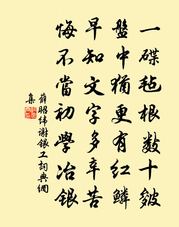 詩詞名句歷史字典書法欣賞書法字典國語詞典說文解字康熙字典古漢語字典標 題 作 者 詩 句 謝銀工作者:薛昭緯 朝代:唐代謝銀工原文一碟氈根數十皴,盤中猶更有紅鱗。早知文字多辛苦,悔不當初學冶銀。詩詞問答問:謝銀工的作者是誰?答:薛昭緯問:謝銀工寫於哪個朝代?答:唐代問:謝銀工是什麼體裁?答:七絕薛昭緯謝銀工書法欣賞謝銀工書法作品注釋全唐詩:卷688-8詩詞推薦宋奧寄友陳某〔宋代〕落日猶未落,青山還自青。鳥飛雲外見,泉過竹邊聽。童子求新汲,先生守舊扃。相看不相見,應註太玄經。哭中師雪崖薛嵎〔宋代〕眾里知心少,唯師是故人。臨終書未答,昨夜夢全真。鶴唳渾如哭,花開不似春。近逢同住者,得問病元因。秋日游柯市張耒〔宋代〕柯市漁樵暮,遊人落落稀。肩禾新獲野,炷火欲鳴機。草木經寒雨,川原淡夕暉。北歸吾敢必,身世正多違。灞橋待李將軍長孫無忌〔唐代〕颯颯風葉下,遙遙煙景曛。霸陵無醉尉,誰滯李將軍。遊仙詩嵇康〔兩漢〕翩翩鳳翮。逢此網羅。夫入相寄姨妹(載拜相,韞秀銜宿恨,寄姨妹)王韞秀〔唐代〕相國已隨麟閣貴,家風第一右丞詩。笄年解笑鳴機婦,恥見蘇秦富貴時。宿古寺趙汝鐩〔宋代〕黃昏投寺宿,古屋瞰荒江。村酒沽春瓮,山房耿夜釭。灘高聲撼枕,月落影收窗。僧老人皆玩,樓鍾曉未撞。永叔寄澄心堂紙二幅梅堯臣〔宋代〕昨朝人自東郡來,古紙兩軸緘縢開。滑如春冰密如繭,把玩驚喜心徘徊。蜀牋蠹脆不禁久,剡楮薄慢還可咍。書言題金山四首吳芾〔宋代〕老大疏慵百不堪,倦遊猶未脫征衫。君王若許投簪去,擬與頭陀共此岩。過臨平蓮盪四首楊萬里〔宋代〕蓮盪層層鏡樣方,春來嫩玉斬新光。角頭一一張蘆箔,不遣魚蝦過別塘。和人見詠新鶴魏野〔宋代〕雪霜毛羽瘦形儀,養處人家覺道肥。龜有壽齡方可近,鷺無仙分莫相依。千年松上疑孤立,五色雲中好並飛。不競奉使契丹二十八首其二十二學士院端午帖子二蘇轍〔宋代〕玉殿清虛過暑天,草廬煩促念民編。外家近許遷新宅,不遣司農費一錢。遣興陳鑒之〔宋代〕踏遍茹溪石,梅花又滿林。山川春人望,宇宙月知心。一紀別鄉井,八年無雁音。危巢老松頂,日暮有歸禽。謁告得歸拜呈內機知府郎官五首程公許〔宋代〕公餘賡載不曾間,一段風流嗣建安。霜月西窗誰畫取,詩人雙聳玉樓寒。依韻答胡侍郎見寄范仲淹〔宋代〕千年風采逢明主,一寸襟靈慕昔賢。待看朝廷興禮讓,天衢何敢斗先鞭。鵲踏枝馮延巳〔唐代〕霜落小園瑤草短,瘦葉和風,惆悵芳時換。懊恨年年秋不管,朦朧如夢空腸斷。獨立荒池斜日岸,牆外遙山,隱隱木蘭花慢劉秉忠〔元代〕到閒人閒處,更何必,問窮通。但遣興喔詩,洗心觀易,散步攜筇。浮雲不堪攀慕,看長空、淡淡沒孤鴻。今古漁寄劉孝叔蘇軾〔宋代〕君王有意誅驕虜,椎破銅山鑄銅虎。聯翩三十七將軍,走馬西來各開府。南山伐木作車軸,東海取鼉漫戰鼓。汗流浪淘沙劉禹錫〔唐代〕八月濤聲吼地來,頭高數丈觸山回。須臾卻入海門去,捲起沙堆似雪堆。斫病竹趙蕃〔宋代〕採掘寧慳供,護持期有成。時今閱春夏,爾獨意枯榮。瑣碎日無影,蕭騷風罷聲。樵蘇勿懷辱,而我豈無情。名句推薦馬逢伯樂而嘶,人遇知己而死。羅貫中《三國演義·第六十回》 十年生死兩茫茫,不思量,自難忘。蘇軾《江城子·乙卯正月二十日夜記夢》 亭上秋風,記去年裊裊,曾到吾廬。辛棄疾《漢宮春·會稽秋風亭觀雨》 前不見古人,後不見來者。陳子昂《登幽州台歌》 朱弦已為佳人絕,青眼聊因美酒橫。黃庭堅《登快閣》 坐看黑雲銜猛雨,噴灑前山此獨晴。崔道融《溪上遇雨二首》 未覺池塘春草夢,階前梧葉已秋聲。朱熹《偶成》 駐馬橋西,還系舊時芳樹。高觀國《玲瓏四犯·水外輕陰》 孤村芳草遠,斜日杏花飛。寇準《江南春·波渺渺》 春風知別苦,不遣柳條青。李白《勞勞亭》