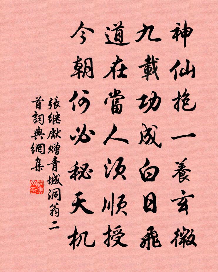 詩詞名句歷史字典書法欣賞書法字典國語詞典說文解字康熙字典古漢語字典標 題 作 者 詩 句 贈青城洞翁二首作者:張繼先 朝代:宋代贈青城洞翁二首原文神仙抱一養玄微,九載功成白日飛。道在當人須順授,今朝何必秘天機。詩詞問答問:贈青城洞翁二首的作者是誰?答:張繼先問:贈青城洞翁二首寫於哪個朝代?答:宋代張繼先贈青城洞翁二首書法欣賞贈青城洞翁二首書法作品詩詞推薦答祿將軍射虎行迺賢〔元代〕將軍部曲瀚海東,三千鐵騎精且雄。久知天命屬真主,奮身來建非常功。世祖神謨涵宇宙,坐使英雄皆入彀。十年甲子雨方回〔宋代〕紫陽元日得晴日,曉鵲聲邊駢賀客。玉梅爛漫照椒觴,盡我真珠紅一石。祁山山下初立春,馬上送迎逢故人。故人登烏龍山詩閣張伯玉〔宋代〕桐川本無塵,況此幽閣逈。萬木含秋聲,一軒與天淨。前峰翠分滴,後谷語相應。檻下江雲歸,檐前古雪凝。岩僧和李秀才郊墅早春吟興十韻韋莊〔唐代〕暖律變寒光,東君景漸長。我悲游海嶠,君說住柴桑。雪色隨高岳,冰聲陷古塘。草根微吐翠,梅朵半含霜。酒市既離洞霄遇雨卻寄道友周文璞〔宋代〕凡骨何堪得再行,渴心猶要謁通明。驚聞竹樹連山雨,疑有風雷{左扌右暴}地聲。鹿啖黃精知歲久,人逢青箬便和馮潔已節夜見過二首程公許〔宋代〕破悶孤莫莫厭深,風箏時為送清音。平生遇境無餘戀,令節因君忽愴心。梅角吹殘愁不寐,柳枝放去杳難尋。蛾眉荊巫夢思徐凝〔唐代〕楚水白波風裊裊,荊門暮色雨蕭蕭。相思合眼夢何處,十二峰高巴字遙。鍾陵道中作陳陶〔唐代〕原隰經霜蕙草黃,塞鴻訊息怨流芳。秋山落照見麋鹿,南國異花開雪霜。煙火近通槃瓠俗,水雲深入武陵鄉。曾逢送廣東憲劉克莊〔宋代〕疏屢循牆詔屢催,繡衣安得更徘徊。直從象窟埋輪去,曾向龍墀折檻來。度嶺尊堯心未已,登台叫舜首頻回。遙知有感李流謙〔宋代〕眼看燕雀鬧雲間,塌翼蓬榛笑孔鸞。未暇持竿釣渭水,卻因採菊見南山。床頭有酒三冬足,案上無書一日閒。世路經錢塘故宮蔡襄〔宋代〕廢苑蕪城裹故宮,行人苑外問秋風。當時歌舞何年盡,此意古今無處窮。往事蕭條隨改葉,客情迢遞寄孤鴻。扁般江神子侯善淵〔元代〕丹華虛托假形骸。久沈埋。惹非災。冗冗蜉蝣,都被死生催。頓覺悟知亡彼我,任空色,眼中來。海底金烏初出現喜遷鶯 煉心丘處機〔元代〕要離生滅。把舊習般般,從頭磨徹。 * 千重,身心百鍊,煉出寸心如鐵。放教六神,和暢不動,三屍顛蹶。事猛羅提舉見和再用韻四首陳造〔宋代〕又作凝香齋宿,未容燥吻得濡。頗怪太湖龍伯,貝宮臥戲明珠。和於判官登萬山亭因贈洪府都督韓公孟浩然〔唐代〕韓公是襄土,日賞城西岑。結構意不淺,岩潭趣轉深。皇華一動詠,荊國幾謳吟。舊徑蘭勿剪,新堤柳欲陰。砌傍偈頌一百四十一首釋師範〔宋代〕錦包特石,鐵裹泥團。現成活計,格外鄉談。明眼衲僧會不得,月移梅影上欄乾。方竹張詠〔宋代〕筍從初籜已方堅,峻節凌霜更可憐。為報世間邪佞者,如何不似竹枝賢。念奴嬌佚名〔宋代〕綠雲霽雨,倚晴空千尺,長江澄縠。十里薰低、繡幕四葉,其餘華屋。怪得清都,奔雲擁鶴,環佩聲相續。朝來無丞廳後圃雙梅一枝發和似表弟韻李彌遜〔宋代〕漫遊蹤跡成浮家,一身四海驚年華。不禁草木競時節,忽見霜乾排新花。曉雲生寒日未透,南枝半肥北枝瘦。就中感興蒲壽宬〔宋代〕晨起自理髮,握髮雙淚流。不見結髮人,惆悵空白頭。君留白髮種,種作一段愁。茁哉秋蓬根,念此春荑柔。名句推薦不似天涯,捲起楊花似雪花。蘇軾《減字木蘭花·立春》 秋送新鴻哀破國,晝行飢虎齧空林。鄭思肖《二礪》 新寒中酒敲窗雨,殘香細裊秋情緒。納蘭性德《菩薩蠻·新寒中酒敲窗雨》 湖上春來似畫圖,亂峰圍繞水平鋪。白居易《春題湖上》 一寸光陰一寸金,寸金難買寸光陰。佚名《增廣賢文·上集》 風一更,雪一更,聒碎鄉心夢不成,故園無此聲。納蘭性德《長相思·山一程》 萬里無人收白骨,家家城下招魂葬。張籍《征婦怨》 總是向人深處,當時枉道無情陸游《朝中措·代譚德稱作》 胸中有誓深于海,肯使神州竟陸沉?鄭思肖《二礪》 齊有倜儻生,魯連特高妙。李白《古風·齊有倜儻生》