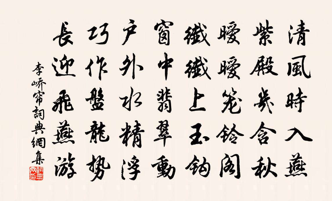詩詞名句歷史字典書法欣賞書法字典國語詞典說文解字康熙字典古漢語字典標 題 作 者 詩 句 簾作者:李嶠 朝代:唐代簾原文清風時入燕,紫殿幾含秋。曖曖籠鈴閣,纖纖上玉鉤。窗中翡翠動,戶外水精浮。巧作盤龍勢,長迎飛燕遊。詩詞問答問:簾的作者是誰?答:李嶠問:簾寫於哪個朝代?答:唐代問:簾是什麼體裁?答:五律李嶠簾書法欣賞簾書法作品注釋全唐詩:卷60_16詩詞推薦題薦嚴院歐陽修〔宋代〕那堪多難百憂攻,三十衰容一病翁。卻把西都看花眼,斷腸來此哭東風。和趙晦之司戶三首鄭剛中〔宋代〕文士務悅目,常患器局卑。余雖嗜古勁,而乏撫媚姿。袖繹起深愧。漸摩賴良規。溫言謾相訹,何以慰所思。素梅 十四王冕〔元代〕朔風吹冷過山城,巾子峰頭雪未晴。十載西湖閒客夢,夜來山月最分明。泛舟丘葵〔宋代〕泛舟游碧渚,避世作漁翁。試問千鍾祿,何如一釣筒。雨添春後水,帆漲晚來風。緡卷看魚上,停橈倚荻叢。教學退作二首陳著〔宋代〕昔年堂上來三鱣,今日溪頭領隊魚。方信卜居初意好,要教同里識詩書。送晁補闕歸日本國趙驊〔唐代〕西掖承休浣,東隅返故林。來稱郯子學,歸是越人吟。馬上秋郊遠,舟中曙海陰。知君懷魏闕,萬里獨搖心。第一句陳韡〔宋代〕寄語園丁勤劃草,有時病叟出看花。西山戲題武昌王居士並引蘇軾〔宋代〕予往在武昌,西山九曲亭上有題一句云:玄鴻橫號黃槲峴。九曲亭即吳王峴山,一山皆槲葉,其旁即元結陂湖也,雜書陸游〔宋代〕身似匡廬老病僧,閉門一衲坐騰騰。雨聲驚斷長安夢,惆悵西窗夜半燈。用謝艮齋韻題歐陽長老墨梅袁說友〔宋代〕溪藤橫翠約,老眼頗眵昏。喚入凌煙後,江村不是村。偈一首釋延壽〔宋代〕孤猿叫落中岩月,野客吟殘半夜燈。此境此時認會意,白雲深處坐禪僧。海邊僧寺絕筆諸葛夢宇〔宋代〕孤臣垂死愈心傷,捲土重來豈望還。萬裏海濤鳴戰鼓,千年靈氣結浮山。魚龍亦解齊殊類,犬馬誰教到此間。留得端午帖子皇帝合六首歐陽修〔宋代〕彩索盤中結,楊梅棕里紅。宮闈九重樂,風俗萬方同。依韻和李君讀余注孫子梅堯臣〔宋代〕我世本儒術,所談聖人篇。聖篇辟乎道,信謂天地根。眾賢發蘊奧,授業稱專門。傳箋與註解,璨璨今猶存。始欲寒山持經拾得手接釋師範〔宋代〕手持經卷,付與同倫。已所不欲,勿施於人。舊將劉筠〔宋代〕丈八蛇矛戰血乾,子孫今已列材官。青煙碧瓦開新第,白草黃雲廢舊壇。勞薄可甘先蘭舌,爵高還許戴劉冠。秋來次韻隱者陳無隅二首李彌遜〔宋代〕歷井捫參蹋蘚苔,山腰海角偶徘徊。身從飄泊似浮水,眼見紛華等濕灰。共煮松風占乳信,試尋香雪探芳媒。笑談史館陳太丞知壽州楊億〔宋代〕忽佩魚符下玉京,長安廄吏駕車迎。淮王舊地餘風物,太史新書見姓名。弩矢前驅殊覺貴,河梁執別豈勝情。小山自貽陸游〔宋代〕退士憤驕虜,閒人憂旱年。耄期身未病,貧困氣猶全。七歌效杜陵體丘葵〔宋代〕十家九室廚無煙,兒夫仆後妻僵前。米珠薪桂內如玉,野無青草飛烏鳶。手持空券向何許,官司有印儂無錢。嗚呼名句推薦閒中件件思,暗裡般般量。康海《雁兒落帶得勝令·飲中閒詠》 鵲橋波里出,龍車霄外飛。任希古《和長孫秘監七夕》 儒有博學而不窮,篤行而不倦戴聖《禮記·儒行》 龜游蓮葉上,鳥宿蘆花里。李白《姑孰十詠》 花明月暗籠輕霧,今宵好向郎邊去。李煜《菩薩蠻·花明月暗籠輕霧》 不忍登高臨遠,望故鄉渺邈,歸思難收。柳永《八聲甘州·對瀟瀟暮雨灑江天》 庭有枇杷樹,吾妻死之年所手植也,今已亭亭如蓋矣。歸有光《項脊軒志》 為學日益,為道日損。老子《老子·德經·第四十八章》 江山如此多嬌,引無數英雄競折腰 * 《沁園春·雪》 城中桃李愁風雨,春在溪頭薺菜花。辛棄疾《鷓鴣天·陌上柔桑破嫩芽》