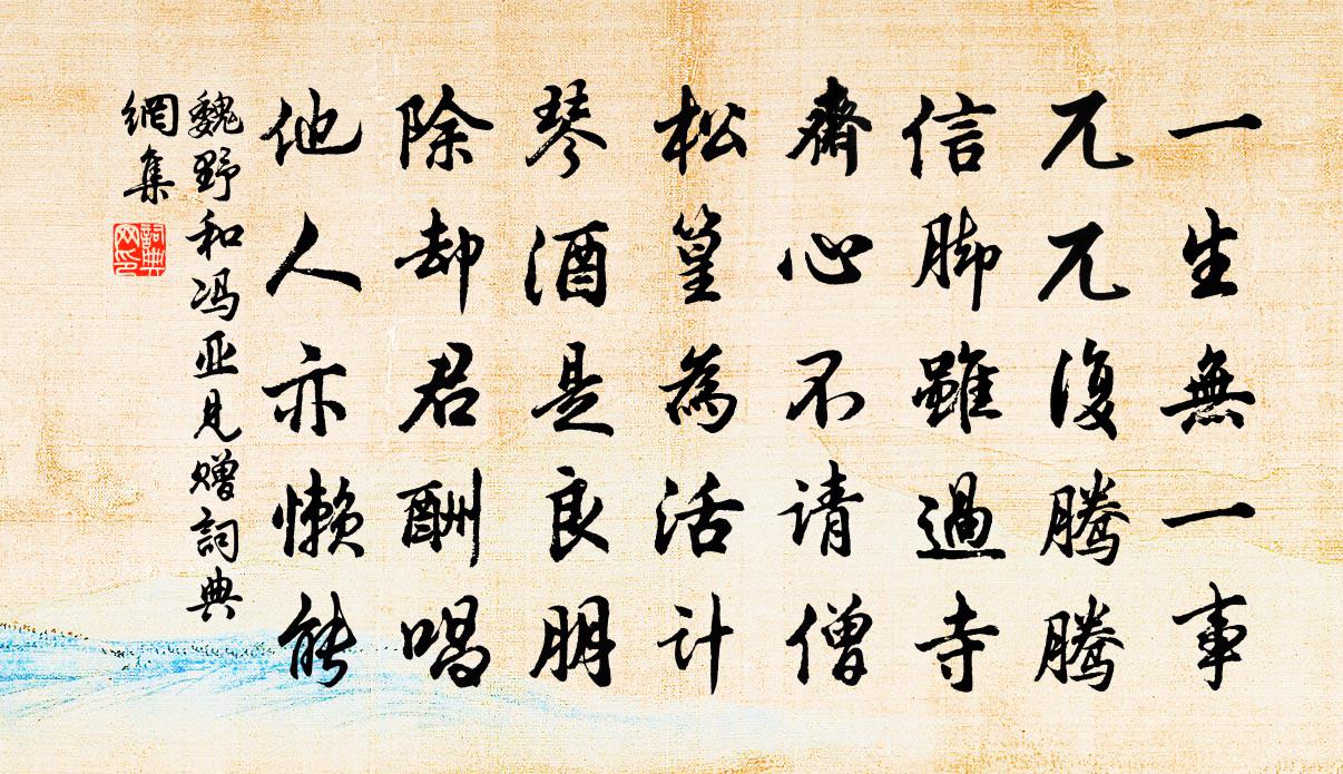 詩詞名句歷史字典書法欣賞書法字典國語詞典說文解字康熙字典古漢語字典標 題 作 者 詩 句 和馮亞見贈作者:魏野 朝代:宋代和馮亞見贈原文一生無一事,兀兀復騰騰。信腳雖過寺,齋心不請僧。松篁為活計,琴酒是良朋。除卻君酬唱,他人亦懶能。詩詞問答問:和馮亞見贈的作者是誰?答:魏野問:和馮亞見贈寫於哪個朝代?答:宋代魏野和馮亞見贈書法欣賞和馮亞見贈書法作品詩詞推薦夜飲二首楊萬里〔宋代〕飲酒無奇訣,且斟三四分。初頭只嫌淺,忽地有餘春。身外多少事,燈前子細論。絕憐青女老,忍冷撒瓊塵。春晚即事曹勛〔宋代〕化國舒長日正遲,漫天風柳綠成姿。高低蝴蝶尚春色,零落荼醾猶晚枝。倦思有餘時種竹,老懷無著強賡詩。人人重疊金(春遊)趙善扛〔宋代〕楚宮楊柳依依碧。遙山翠隱橫波溢。絕 * 穠春。春光欲醉人。纖纖芳草嫩。微步輕羅襯。花戴滿頭歸。游蜂花上青蓮池上客 繼重陽韻馬鈺〔元代〕元宵內景閒閒看。見雲霧、風吹散。洞裡天晴如碧案。一輪心月,十分明更,性燭非常燦。靈台結個燈球煥。慧照壽黃復庵陳郁〔宋代〕移家載雪河橋住,吟過余寒不出門。人遺奚奴傳吉語,天教詞客壽清樽。上林開到梨花了,次第牡丹紅欲笑。眉端牧童歌十首蒲壽宬〔宋代〕荷笠小蒼頭,犢裩乘水牛。揚鞭自叱吒,度隴復憑溝。秋懷十首汪莘〔宋代〕形骸欹仄麵皮黃,破屋三間號柳塘。自大暑來真畏暑,到微涼處便知涼。繫舟陸游〔宋代〕繫舟江浦待潮平,嘆息無人共月明。歷盡世間多少事,飄然依舊老書生。送楊先輩登第還家歐陽修〔宋代〕解榻方欣待◇英,掛帆千里忽南征。錦衣白日還家樂,鶴髮高堂獻壽榮。殘雪楚天寒料峭,春風淮水浪崢嶸。知君子期台張至龍〔宋代〕拾葉題詩愧不才,袖遮微日上層台。山僧分我松陰坐,隔岸花香渡水來。題范子濟雙頭芍藥二首王洋〔宋代〕趙家姊妹在椒房,宮漏春遲午夢長。淡拂蛾眉減脂粉,一般裝束奉君王。虞美人蘇軾〔宋代〕深深庭院清明過。桃李初紅破。柳絲搭在玉闌乾。簾外瀟瀟微雨、做輕寒。晚晴台榭增明媚。已拼花前醉。更闌人滿江紅陳三聘〔宋代〕天豈無情,天若道、有情亦老。功名事、問天因甚,蒙人不了。好伴雲煙耕谷口,休將翰墨傳江表。算鬢邊、能得偈頌十一首釋了演〔宋代〕踢倒飛來回首去,倒騎佛殿出皇都。須知此外封疆闕,八面騰騰任卷舒。和王子元中秋會飲余靖〔宋代〕混元鼓橐四氣平,西商之氣爽且輕。望舒按轡出東海,孤輪斲冰碾太清。碧落坦夷輪不停,銀河浩蕩波無聲。千家贈長沙讚頭陀劉禹錫〔唐代〕外道邪山千萬重,真言一發盡摧峰。有時明月無人夜,獨向昭潭制惡龍。句釋洪英〔宋代〕喜得狼煙息,弓弰壁上懸。【雙調】折桂令 擬張鳴善倪瓚〔元代〕草茫茫秦漢陵闕,世代興亡,卻便似月影圓缺。山人家堆案圖書,當窗松桂,滿地薇蕨。侯門深何須刺謁,白雲自頌古五十五首釋紹曇〔宋代〕收拾成都賣卜家,君平術肆獨宏開。鬧中人獻支機石,掀倒卦盤歸去來。端嘉雜詩二十首劉克莊〔宋代〕鞏洛山川幾過兵,漢家初遣使修陵。可無神物呵豺虎,直護香菸到柏城。名句推薦記得綠羅裙,處處憐芳草。賀鑄《綠羅裙·東風柳陌長》 治國常富,而亂國常貧。管仲《管子·治國》 煙霏雲斂;其容清明,天高日晶;歐陽修《秋聲賦》 長他人志氣,滅自己威風。張南莊《何典·第十回》 雁字無多,寫得相思幾許。周密《掃花游·九日懷歸》 愁絕行人天易暮,行向鷓鴣聲里住納蘭性德《菊花新·用韻送張見陽令江華》 田舍清明日,家家出火遲。王建《寒食》 恨無千日酒,空斷九迴腸。劉彤《臨江仙·千里長安名利客》 落日照大旗,馬鳴風蕭蕭。杜甫《後出塞五首》 萬頃風濤不記蘇。雪晴江上麥千車。但令人飽我愁無。蘇軾《浣溪沙·萬頃風濤不記蘇》