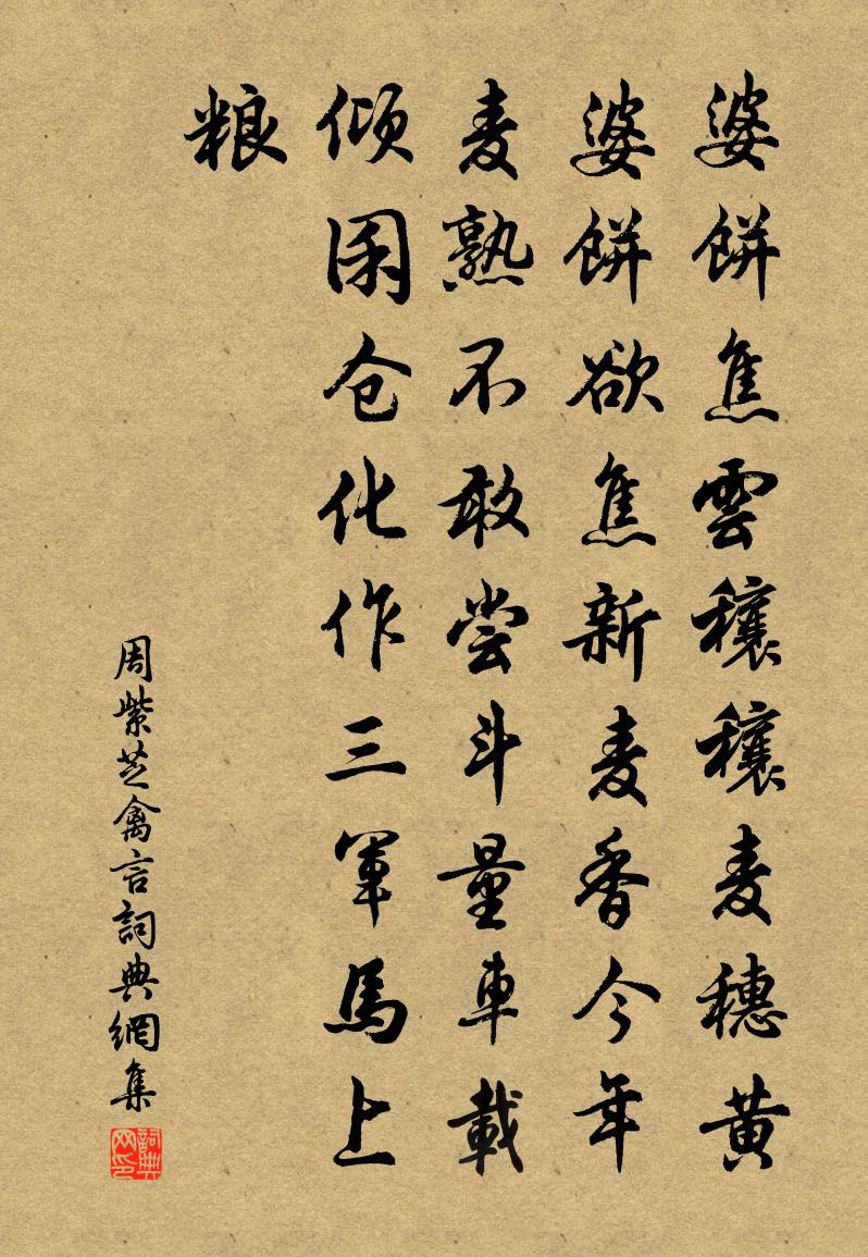 婆餅焦雲穰穰,麥穗黃。婆餅欲焦新麥香,今年麥熟不敢嘗,斗量車載傾囷倉,化作三軍馬上糧。