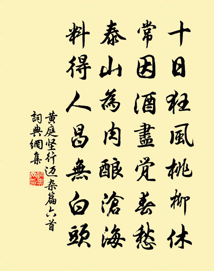 詩詞名句歷史字典書法欣賞書法字典國語詞典說文解字康熙字典古漢語字典標 題 作 者 詩 句 行邁雜篇六首作者:黃庭堅 朝代:宋代行邁雜篇六首原文十日狂風桃柳休,常因酒盡覺春愁。泰山為肉釀滄海,料得人昌無白頭。詩詞問答問:行邁雜篇六首的作者是誰?答:黃庭堅問:行邁雜篇六首寫於哪個朝代?答:宋代問:黃庭堅的名句有哪些?答:黃庭堅名句大全黃庭堅行邁雜篇六首書法欣賞行邁雜篇六首書法作品詩詞推薦歐陽詢陰符經帖贊岳珂〔宋代〕內史書如率令,善奴秀比官奴。千古會稽楷則,於今重見陰符。和餘子美即事二首黃公度〔宋代〕黌堂歸去葛衣輕,怪底形容太瘦生。抖擻慳囊償酒債,安排嶮韻主詩盟。妖韶梅老自餘態,滋味韓休薄大羹。強策送洪侍御二首劉克莊〔宋代〕曾峨豸角立朝端,貴近聞名膽尚寒。古冢狐狸何足問,法筵龍象各傍觀。青霄直上雲梯易,白首能堅鐵壁難。想見幽居陸游〔宋代〕花過鶯初嬾,泥新燕正忙。病餘猶止酒,睡起獨焚香。拄杖嫌園窄,棋枰喜日長。北窗元可樂,不是傲羲皇。頻載酒/浣溪沙賀鑄〔宋代〕金斗城南載酒頻。東西飛觀跨通津。漾舟聊送雨餘春。桃李趣行無算酌,桑榆收得自由身。酣歌一曲太平人。晏公喪過州北哭罷成篇二首宋庠〔宋代〕故郡迎喪匝野悲,柳車丹旐共逶迆。泉塗自古無春色,可惜森森瓊樹枝。邊思釋文珦〔宋代〕十年辛苦戍邊城,朔漠漫漫萬里平。厭聽胡兒吹曉角,聲聲都是斷腸聲。次韻元實病目黃庭堅〔宋代〕道人嘗恨未灰心,儒士苦愛讀書眼。要須玄覽照鏡空,莫作白魚鑽蠹簡。閱人朦朧似有味,看字昏澀尤宜懶。范侯次韻劉貢父西掖種竹蘇轍〔宋代〕竹迷誰定知迷否,趁取滂沱好雨初。栽向鳳池吹律處,劚從芸閣殺青余。迎風一嘯朝回早,弄月相差直宿疏。應怪岐亭五首(並敘)蘇軾〔宋代〕元豐三年正月,余始謫黃州。至岐亭北二十五里山上,有白馬青蓋來迎者,則余故人陳慥季常也,為留五日,賦詩芳所堂賞桂楊順齋酒邊賦顧逢〔宋代〕秋風芳所地,把酒又重來。種有仙凡異,花分早晚開。滿簪烏帽去,如入月宮回。莫說郄詵事,功名念已灰。次韻答正老強至〔宋代〕幽歡閒憶去年時,飲量人人灌漏卮。我更典衣邀淺飲,君猶刻燭賦新詩。由來世事都無定,再結朋游未可期。一紙南行羅鄴〔唐代〕臘晴江暖鸊鵜飛,梅雪香黏越女衣。魚市酒村相識遍,短船歌月醉方歸。水調歌頭(贈九霞子鞠九思)陳楠〔宋代〕奪取天機妙,夜半看辰杓。一些珠露,阿誰運倒稻花頭。便向此時採取,宛如碧蓮合蕊,滴破玉池秋。萬籟風初起邕州陶弼〔宋代〕出撫驩兜俗,親提季子軍。隨人雨關月,迎馬二溪雲。挽劉學諭玗廖行之〔宋代〕詩禮家傳舊,箕裘世襲良。蚤同花萼秀,晚並桂椿芳。方恨違同氣,那知嘆肯堂。斯文今已矣,繼踵屬賢郎。殘句杜牧〔唐代〕幽人聽達曙,聊罷蘇床琴。[《海錄碎事》]魚多知海熟,藥少覺山貧。[以下《方輿勝覽》]土控吳兼越,州連晚步門外書觸目陸游〔宋代〕數椽茆屋鏡湖傍,喬木蒼煙一徑長。酒賤過門多醉叟,天寒棲畝有餘糧。歌呼草市知人樂,簫鼓叢祠喜歲穰。只道茂林見訪有詩次韻奉酬喻良能〔宋代〕解鞍揮玉麈,亹亹笑談清。昨夜燈花喜,今朝乾鵲聲。興同狂秘監,詩似老彌明。憶昔南台北,相逢蓋始傾。喜李余自蜀至賈島〔唐代〕迢遞岷峨外,西南驛路高。幾程尋嶮棧,獨宿聽寒濤。白鳥飛還立,青猿斷更號。往來從此過,詞體近風騷。名句推薦今夜鄜州月,閨中只獨看。杜甫《月夜》 悲歌可以當泣,遠望可以當歸。佚名《悲歌》 稱是秦時避世人,勸酒相歡不知老。李白《山人勸酒》 何當共剪西窗燭,卻話巴山夜雨時。李商隱《夜雨寄北》 讓利精於取利,逃名巧於邀名。陳繼儒《小窗幽記·集靈篇》 候館梅殘,溪橋柳細。歐陽修《踏莎行·候館梅殘》 試上吳門窺郡郭,清明幾處有新煙。張繼《閭門即事》 城上日出群烏飛,鴉鴉爭赴朝陽枝。柳宗元《跂烏詞》 荷葉生時春恨生,荷葉枯時秋恨成。李商隱《暮秋獨游曲江》 與君別。相思一夜梅花發。房舜卿《憶秦娥·與君別》