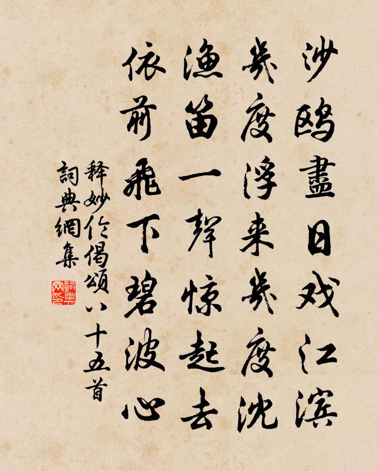 詩詞名句歷史字典書法欣賞書法字典國語詞典說文解字康熙字典古漢語字典標 題 作 者 詩 句 偈頌八十五首作者:釋妙倫 朝代:宋代偈頌八十五首原文沙鷗盡日戲江濱,幾度浮來幾度沈。漁笛一聲驚起去,依前飛下碧波心。詩詞問答問:偈頌八十五首的作者是誰?答:釋妙倫問:偈頌八十五首寫於哪個朝代?答:宋代釋妙倫偈頌八十五首書法欣賞偈頌八十五首書法作品詩詞推薦蘆山寺舒坦〔宋代〕江雲扶雨暖溶溶,來往東西只信風。早晚晴陰渾不定,青山半在有無中。鵝鴨相呼初出田,昏昏雲日澹平川。寒雲滿庭芳 證仙果馬鈺〔元代〕牝鎖玄通,龍奔虎走,微微調息綿綿。清風透戶,不放馬猿顛。奼女嬰兒相遇,論清淨、至妙根源。無作做,自然入興安界李曾伯〔宋代〕路入興安境,風光異昔年。山川雖好在,井邑頓悽然。雨打半頹屋,煙荒未闢田。起丁征糴急,官府為防邊。人皆以貧憂姚勉〔宋代〕人皆以貧憂,君子獨能樂。中心賤榮利,外物甘寂寞。富貴如春花,時去易凋落。不如一簞瓢,可以長處約。和張倅湖上十絕姜特立〔宋代〕夕寒山水閟清暉,歸到華堂月半扉。傾倒錦囊無賸語,風光那得更相違。水夫謠王建〔唐代〕苦哉生長當驛邊,官家使我牽驛船。辛苦日多樂日少,水宿沙行如海鳥。逆風上水萬斛重,前驛迢迢後淼淼。半夜再贈周國祥言相方回〔宋代〕紛紛世上少全人,鶴睫分光照始真。李相頭顱君莫笑,神仙猶現羽禽身。古松齊己〔唐代〕雷電不敢伐,鱗皴勢萬端。蠹依枯節死,蛇入朽根盤。影浸僧禪濕,聲吹鶴夢寒。尋常風雨夜,應有鬼神看。挽潛齋王樞相王柏〔宋代〕精舍北之北,幽宮南復南。兩山生死寄,千古姓名諳。地勢蟠空壯,溪聲戰晚酣。青烏髮天秘,萬壑拱遺龕。次韻參寥三首秦觀〔宋代〕武陵漁子入花源,但見秦人不得仙。會有黃鸝鳴翠柳,何妨白眼望青天。浣溪沙范成大〔宋代〕紅錦障泥杏葉韉。解鞍呼渡憶當年。馬驕不肯上航船。茅店竹籬開席市,絳裙青袂斸姜田。臨平風物故依然。句擊虎臣〔宋代〕彩旆西來橫鐵瓮,大江東圍涌金山。子山寺張弋〔宋代〕迢遞前朝寺,經過遂一游。白雲鴉樹曉,黃葉鳳台秋。僧舉開山話,人消在世愁。殿廊經劫火,已費十年修。明叔每見過不久輒去仲威尤難招致索居書事呈趙蕃〔宋代〕可人費招呼,奈此陳與胡。問事失昏忘,論詩辨精粗。清風不可絆,白日易成晡。欲睡難安枕,繙書得踞爐。聒人滿庭芳·小閣藏春李清照〔宋代〕小閣藏春,閒窗銷晝,畫堂無限深幽。篆香燒盡,日影下簾鉤。手種江梅更好,又何必、臨水登樓?無人到,寂寥偈頌七十八首釋正覺〔宋代〕法界無塵心月圓,本光還照未萌前。而今直下分明去,猶較南泉二十年。山中回憶東山老楊蟠〔宋代〕山遊興發特尋君,屐齒筇枝繞四鄰。峰北看去忘世務,澗南聽水得天真。名高寂寞存僧史,林下風流似晉人。何日送吳信叟卷剛中〔宋代〕人生聚散只尋常,特地關情是異鄉。夜話不知邊月落,離愁還似峽江長。摶風有力須騰上,守塞無能合退藏。黃閣竹亭詩李廌〔宋代〕繞岡修竹小亭深,風乾雲梢照碧潯。安得茂林帶左右,只應蕭爽似山陰。留癯翁釋行海〔宋代〕一載相思始見君,同心長是不同群。因看世上多青草,只話山中好白雲。路遠寄書難得到,放深別語豈堪聞。西湖名句推薦玉輪碾平芳草,半面惱紅妝。陳子龍《訴衷情·春遊》 平岡細草鳴黃犢,斜日寒林點暮鴉。辛棄疾《鷓鴣天·陌上柔桑破嫩芽》 歸去來兮,吾歸何處?蘇軾《滿庭芳·歸去來兮》 有桃花紅,李花白,菜花黃。秦觀《行香子·樹繞村莊》 不知庭霰今朝落,疑是林花昨夜開。宋之問《苑中遇雪應制》 楓樹夜猿愁自斷,女蘿山鬼語相邀李商隱《楚宮》 野戰格鬥死,敗馬號鳴向天悲。李白《戰城南》 金剛則折,革剛則裂。劉向《說苑·敬慎》 夫綴文者情動而辭發,觀文者披文以入情,沿波討源,雖幽必顯。劉勰《文心雕龍·知音》 白雲初下天山外,浮雲直向五原間。盧思道《從軍行》
