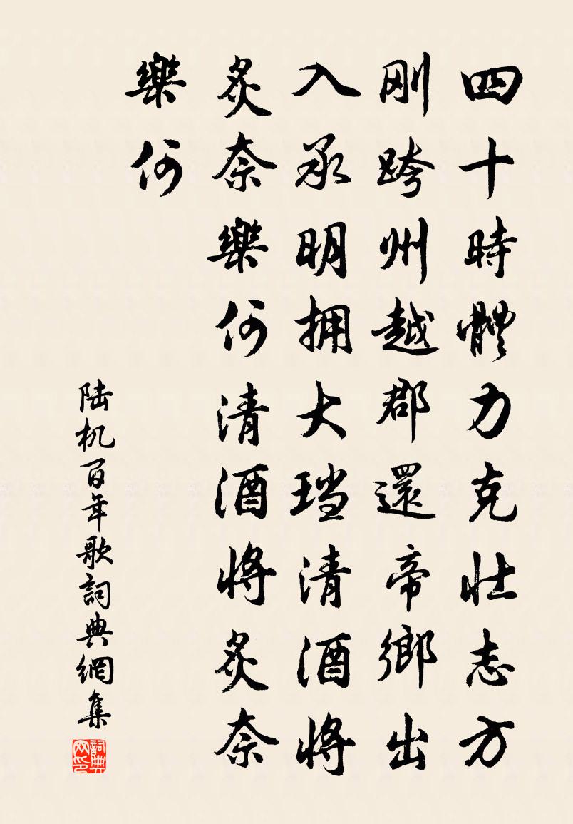 詩詞名句歷史字典書法欣賞書法字典國語詞典說文解字康熙字典古漢語字典標 題 作 者 詩 句 百年歌作者:陸機 朝代:魏晉百年歌原文四十時。體力克壯志方剛。跨州越郡還帝鄉。出入承明擁大璫。清酒將炙奈樂何。清酒將炙奈樂何。詩詞問答問:百年歌的作者是誰?答:陸機問:百年歌寫於哪個朝代?答:魏晉問:百年歌是什麼體裁?答:樂府陸機百年歌書法欣賞百年歌書法作品詩詞推薦八寶妝(秋宵有感)陳允平〔宋代〕望遠秋平。初過雨、微茫水滿煙汀。亂葓疏柳,猶帶數點殘螢。待月重簾誰共倚,信鴻斷續兩三聲。夜如何,頓涼梅開次韻答葉教授二首項安世〔宋代〕春風一點暗驚梅,便有千花動地開。卻似德人方寸事,等間流向筆端來。句何舟〔宋代〕魯望隱時曾為釣,季鷹歸日已成名。再授賓客分司白居易〔唐代〕優穩四皓官,清崇三品列。伊予再塵忝,內愧非才哲。俸錢七八萬,給受無虛月。分命在東司,又不勞朝謁。既資季夏雜興陸游〔宋代〕巉巉瘦驢嶺,莽莽老牛陂。四海均羈旅,何人感此詩?歲晚陸游〔宋代〕小岫嶙峋炷寶熏,卷書閒對一窗雲。雁聲忽向天邊過,起立中庭看斷群。荷露跳珠釋惟一〔宋代〕優曇初現葉團團,錯落明璣走碧盤。沆瀣莫將魚目比,看時容易覓時難。回望館娃故宮李紳〔唐代〕江雲斷續草綿連,雲隔秋波樹覆煙。飄雪荻花鋪漲渚,變霜楓葉卷平田。雀愁化水喧斜日,鴻怨驚風叫暮天。因問南浦(中呂)周邦彥〔宋代〕淺帶一帆風,向晚來、扁舟穩下南浦。迢遞阻瀟湘,衡皋迥,斜艤蕙蘭汀渚。危檣影里,斷雲點點遙天暮。菡萏里和書天慶觀賀秘監堂三首秦觀〔宋代〕衣屨蕭條氣久清,豪家門館未嘗行。朱甍碧瓦何從得,疑有陰兵夜助成。裴度語佚名〔唐代〕雞豬魚蒜,逢著則吃。生老病死,時至則行。初見白髮白居易〔唐代〕白髮生一莖,朝來明鏡里。勿言一莖少,滿頭從此始。青山方遠別,黃綬初從仕。未料容鬢間,蹉跎忽如此。七夕亞之置酒再用前韻韓元吉〔宋代〕烏鵲無聲夜向闌,空庭插竹巧誰看。長生殿里金釵暖,百子池邊五縷寒。夢破清風吹雨腳,醉余新月上林端。閒來昭慶寺朱繼芳〔宋代〕幽尋得勝趣,城市幾人能。古柳深呂磬,長廊盡處燈。畫龍聽說法,塑佛看齋僧。別寺經行遍,茲游昔未曾。就日館王珪〔唐代〕高原春霽盪妖氛,使馹重來路始分。雖遠長安初見日,漸親冀北已瞻雲。東風未破胡天凍,芳草應連紫陌薰。早晚和趙給事白蠅拂歌盧綸〔唐代〕華堂多眾珍,白拂稱殊異。柄裁沈節香襲人,上結為文下垂穗。霜縷霏微瑩且柔,虎鬚乍細龍髯稠。皎然素色不因神光燦王哲〔元代〕金關叩戶,玉鎖扃門,閒里不做修持。杳默昏冥,誰會舞弄嬰兒。睡到擒猿捉馬,醒來後、復采瓊芝。每依時,這登大半山李穎〔明代〕方仞雲峰護一山,九天風露透衣寒。固知仙境多靈跡,莫向枰棋著意看。和趙大監知宗韻鄭清之〔宋代〕萬里修程占學力,色絲黃娟新組織。只今下筆追二雅,端如養氣閉千息。公子何自知寒梅,須知三長具精識。亭亭偈頌五首釋了悟〔宋代〕今朝開爐向火,諸方說禪浩浩。靈山一字也無,普請大家證據。名句推薦雁聲不到東籬畔,滿城但、風雨淒涼吳文英《惜黃花慢·菊》 知君獨坐青軒下,此時結念同所懷。李白《早秋單父南樓酬竇公衡》 贈遠虛盈手,傷離適斷腸。李商隱《十一月中旬至扶風界見梅花》 日下壁而沉彩,月上軒而飛光。江淹《別賦》 落木千山天遠大,澄江一道月分明。黃庭堅《登快閣》 宣和舊日,臨安南渡,芳景猶自如故。劉辰翁《永遇樂·璧月初晴》 看來豈是尋常色,濃淡由他冰雪中。曹雪芹《詠紅梅花得“紅”字》 向來吟秀句,不覺已鳴鴉。韓翃《酬程延秋夜即事見贈》 竹馬踉蹡沖淖去,紙鳶跋扈挾風鳴。陸游《觀村童戲溪上》 少年辛苦終身事,莫向光陰惰寸功。杜荀鶴《題弟侄書堂》