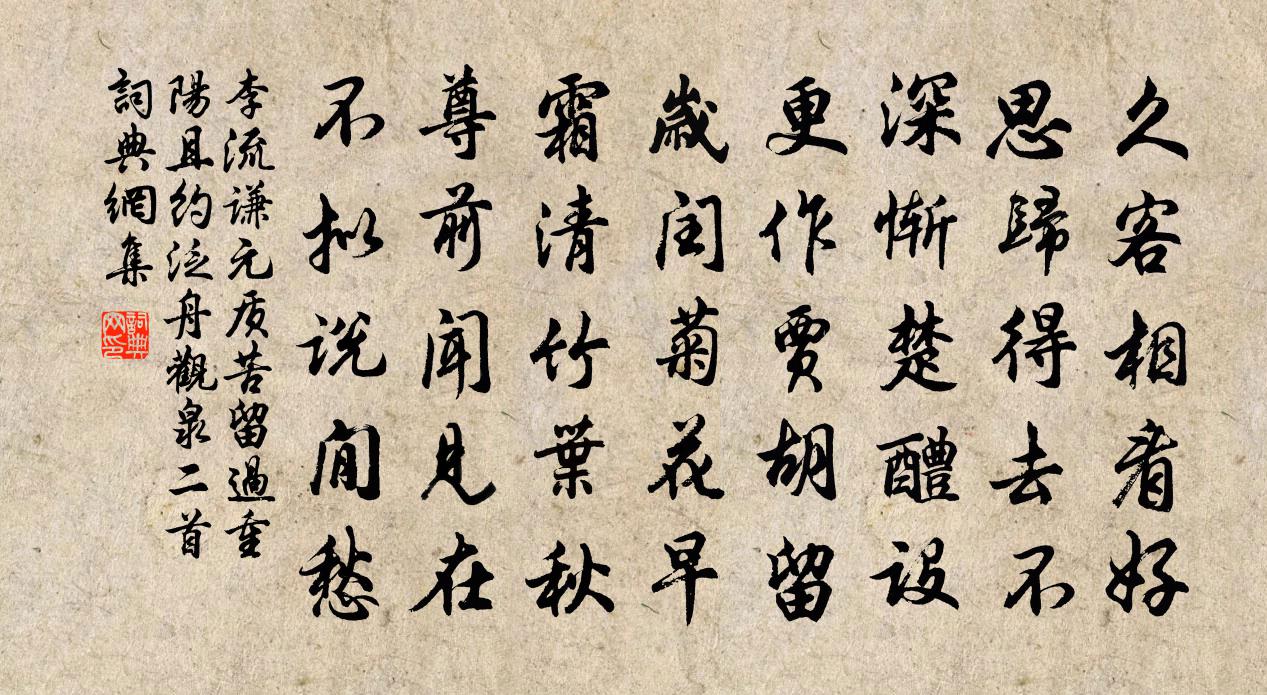 詩詞名句歷史字典書法欣賞書法字典國語詞典說文解字康熙字典古漢語字典標 題 作 者 詩 句 元質苦留過重陽且約泛舟觀泉二首作者:李流謙 朝代:宋代原文久客相看好,思歸得去不。深慚楚醴設,更作賈胡留。歲閏菊花早,霜清竹葉秋。尊前聞見在,不擬說閒愁。詩詞問答問:《元質苦留過重陽且約泛舟觀泉二首》的作者是誰?答:李流謙問:該詩寫於哪個朝代?答:宋代書法欣賞元質苦留過重陽且約泛舟觀泉二首書法作品詩詞推薦秋日泛西湖趙企〔宋代〕湖光山色共爭秋,一點塵埃無覓處。沉沉水底見青天,畫舸直疑天上去。利州北佛龕前重於去歲題處作蘇頲〔唐代〕重岩載看美,分塔起層標。蜀守經塗處,巴人作禮朝。地疑三界出,空是六塵銷。臥石鋪蒼蘚,行塍覆綠條。歲年偈頌二十三首釋雲岫〔宋代〕崑崙之水易發,少林之春難芳。一臂勿斷,九年頓忘。雷暈紋於象齒,花釀蜜於蜂房。派列枝分兮子孫繁碎,烏非簡斯遠兄趙蕃〔宋代〕已辦入城府,尚留緣雨陰。相期著屐過,空想掉頭吟。子故因貧出,余寧嘆老侵。鵷鸞滿台閣,麋鹿自山林。偈頌四十一首釋慧暉〔宋代〕寒夜無炭衰老衣,涼機透骨古堂微。霜辛雪苦慕先律,雨宿風餐圓後奇。謝葉誠齋金丹顧逢〔宋代〕往歲因痰壅,幾為病廢人。金丹如不服,粉骨已成塵。去死僅一線,更生又五春。再深詩里債,筆硯日相親。【中呂】朝天子 西湖徐再思〔元代〕里湖,外湖,無處是無春處。真山真水真畫圖,一片玲瓏玉。宜酒宜詩,宜晴宜雨。銷金鍋錦繡窟,老蘇,老逋,夜船韓偓〔唐代〕野雲低 * 蒼蒼,平波揮目如凝霜。月明船上簾幕卷,露重岸頭花木香。村遠夜深無火燭,江寒坐久換衣裳。誠知有感司空圖〔唐代〕燈影看須黑,牆陰惜草青。歲闌悲物我,同是冒霜螢。漢離宮四時詞趙汝鐩〔宋代〕東風飄花誰共惜,暑雨馥蓮不忺摘。琱欄倚露月千里,銅鋪鎖寒雪一尺。終年漢漏滴四時,屈指三百六十日。遠山哀王荊公張舜民〔宋代〕去來夫子本無情,奇字新經志不成。今日江湖從學者,人人諱道是門生。窮兔謠二首司馬光〔宋代〕兔營三窟定何在,棘間塹底高邱巔。卻行百步方躍入,示免余蹤留雪四。少年何為無惻隱,解鷹縱犬薰以煙。人言寄陳南翔張伯成主賓仇遠〔宋代〕山水未游遍,其如歸夢何。獨憐黃渚月,相隔白漚波。秋盡那無雁,霜遲尚有荷。終期共燈火,插架異書多。錢德遠判縣與母同生日釋寶曇〔宋代〕彩衣何似舞衣輕,鸞鏡還如水鏡明。百裡弦歌歸有道,一軒風月不勝情。口香知吮蓮華墨,山近聞拖蠟屐聲。百拜潮釋智圓〔宋代〕羅剎江心起,百昏信不差。寒聲喧極浦,秋勢卷平沙。望立人心險,驚飛鳥影斜。來源爭可問,滄海況無涯。紫薇花陶弼〔宋代〕人言清禁紫薇郎,草詔紫薇花影旁。山木不知官況別,也隨紅白上東廊。重遊南嶽范成大〔宋代〕舍舟得馬如馭氣,步入青松三十里。我從蠻嶺瘴煙來,不怕雨雲進岳趾。憶昔南征款廟庭,往來無恙神所祉。當時李參政生日二首魏了翁〔宋代〕二年老翁泉,親酌石林壽。林翁硬如石,跌宕懷舞手。酡顏照湖山,麗藻濯花柳。牛頭望蟆頤,隔闊幾煙岫。江梅至道乙未蜀中送人東歸張詠〔宋代〕綠楊陰里卓旌旃,一曲離歌獨泫然。顧我無才狂似鹿,羨君清節直如弦。錦城寇難初平日,帝里春和入謁天。好竭虛谷志歸十首方回〔宋代〕共道歸何晚,猶能喜欲狂。幼兒初拜揖,痴女僅梳妝。有筆修花譜,無錢辟草堂。新添竹逾百,風徑細尋香。名句推薦馬嘶經戰地,雕認打圍山。王鎡《塞上曲》 美女渭橋東,春還事蠶作。李白《陌上桑》 一者階於道,幾於神。姜子牙《六韜·文韜·兵道》 如來是真語者。實語者。如語者。不誑語者。不異語者。鳩摩羅什譯《金剛經·離相寂滅》 老去悲秋強自寬,興來今日盡君歡。杜甫《九日藍田崔氏莊》 野徑雲俱黑,江船火獨明。杜甫《春夜喜雨》 風起,雪飛炎海變清涼。蘇軾《定風波·南海歸贈王定國侍人寓娘》 惟仁者宜在高位。孟子《孟子·離婁章句上·第一節》 青紫雖被體,不如早還鄉。杜甫《夏夜嘆》 向淺洲遠渚,亭亭清絕。張炎《疏影·詠荷葉》