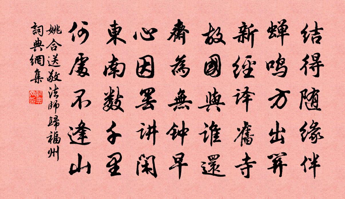 詩詞名句歷史字典書法欣賞書法字典國語詞典說文解字康熙字典古漢語字典標 題 作 者 詩 句 送敬法師歸福州作者:姚合 朝代:唐代送敬法師歸福州原文結得隨緣伴,蟬鳴方出關。新經譯舊寺,故國與誰還。齋為無鍾早,心因罷講閒。東南數千里,何處不逢山。詩詞問答問:送敬法師歸福州的作者是誰?答:姚合問:送敬法師歸福州寫於哪個朝代?答:唐代問:送敬法師歸福州是什麼體裁?答:五律姚合送敬法師歸福州書法欣賞送敬法師歸福州書法作品注釋全唐詩:卷496-81詩詞推薦無題汪晫〔宋代〕農夫只合老山林,辜負時卿一寸心。老矣不堪持手板,死時何用覆斜衾。有人稱善名非細,對客無慚樂最深。回首三月二十三日效樂天體舒岳祥〔宋代〕習習東風白榮裘,余寒未盡滯清愁。柳疑楚舞腰偏細,鶯學吳音舌更柔。好景良辰知古在,騷人墨客幾時休。一年贈梅谷相士文天祥〔宋代〕當年壽陽額,春風點顏色。後來廣平腸,冰雪峙氣骨。世人識花面,識花還自淺。花有歲寒心,清貞堅百鍊。君家還珠橋華鎮〔宋代〕溪上還珠太守家,小橋斜跨碧流沙。清風不共門牆改,長與寒泉起浪花寄處士梁燭張喬〔唐代〕賢哉君子風,諷與古人同。採藥楚雲里,移家湘水東。星霜秋野闊,雨雹夜山空。早晚相招隱,深耕老此中。爇心香 贈彭官人馬鈺〔元代〕昨日官人,今日仙儔。悟浮生、水上浮漚。忽生忽滅,難保難留。便做風狂,成風雅,騁風流。心意清閒,雲水遨寄司錄朝奉兼簡伯壽鄧肅〔宋代〕老松古柏爭清勁,社稷元勛李文正。風流千古照人寒,家有白眉聲益振。十年遊宦落窮山,妾無衣帛日號寒。只余蝶戀花周邦彥〔宋代〕晚步芳塘新霽後。春意潛來,迤邐通窗牖。午睡漸多濃似酒。韶華已入東君手。嫩綠輕黃成染透。燭下工夫,泄漏送高桂陽之任二首劉宰〔宋代〕一笑相逢此道同,別來木末幾青紅。自憐老去北窗下,猶得身棲廣廈中。良夜擬乘千里月,神仙竟隔一帆風。贈行宿尊勝院曾鞏〔宋代〕朝寒陟山砠,宵雨集僧堂。蔽衣蓋苦短,客臥夢不長。鳴風木間起,枯槁吹欲僵。向來雪雲端,葉下百仞隍。起攀述懷吳芾〔宋代〕我愛白樂天,千載共稱賢。行年七十五,奄忽遂溘先。我愛范忠宣,一代名德全。年齡甫至此,亦復成棄捐。二公如夢令呂勝己〔宋代〕花上嬌鶯啞咤。著色江南圖畫。可惜好春風,有酒無人同把。拚舍。拚舍。獨醉好天良夜。刻石歐陽慶甫〔宋代〕地僻人稀能幾家,清泉漱玉石欹斜。客來訪我慚無具,洗甑炊香更點茶。臨江仙倪偁〔宋代〕萬里涼風收積雨,一天晴碧新開。暮雲歸盡絕纖埃。金波明靜夜,玉露濕蒼苔。坐有霜髯詩酒客,平生見月銜杯。愛碣山石劉叉〔唐代〕碣石何青青,挽我雙眼睛。愛爾多古峭,不到人間行。贈肖岩王遂〔宋代〕強栽髭鬢較錙銖,眼底精神不解枯。許我蒼顏殿諸老,可能同讀遠遊無。和丁丞相吳潛〔宋代〕夷狄為陰中國陽,豈容羊犬更鴟張。捷書一紙來從廣,凱奏連旗至自揚。盡瘁元臣食放箸,偷安老守寢凝香。但憐聞畫眉鳥聲戲作岳珂〔宋代〕木杪幽禽巧語新,何時曾記得名因。樣傳京兆成雙嫵,人指漁陽開小顰。盡稱如簧啼白晝,未須對鏡學青春。山中燕李中〔唐代〕豪家五色泥香,銜得營巢太忙。喧覺佳人晝夢,雙雙猶在雕梁。寄陳伯璣金陵王士禎〔清代〕東風作意吹楊柳,綠到蕪城第幾橋?欲折一枝寄相憶,隔江殘笛雨蕭蕭。名句推薦嗟萬事難忘,惟是輕別。周邦彥《浪淘沙慢·曉陰重》 眾鳥高飛盡,孤雲獨去閒。李白《獨坐敬亭山》 烽火城西百尺樓,黃昏獨上海風秋。王昌齡《從軍行七首》 掩柴扉,謝他梅竹伴我冷書齋。沈自晉《玉芙蓉·雨窗小詠》 江南幾日又天涯,誰與寄相思?董士錫《木蘭花慢·武林歸舟中作》 黃雞白酒,君去村社一番秋。辛棄疾《水調歌頭·送楊民瞻》 雪霜凌厲而見殺,來歲不改其性也黃庭堅《書幽芳亭記》 後庭花一曲,幽怨不堪聽。劉禹錫《金陵懷古》 長江後浪推前浪,世上新人趕舊人。佚名《增廣賢文·上集》 白馬黃金塞,雲砂繞夢思。李白《塞下曲六首》