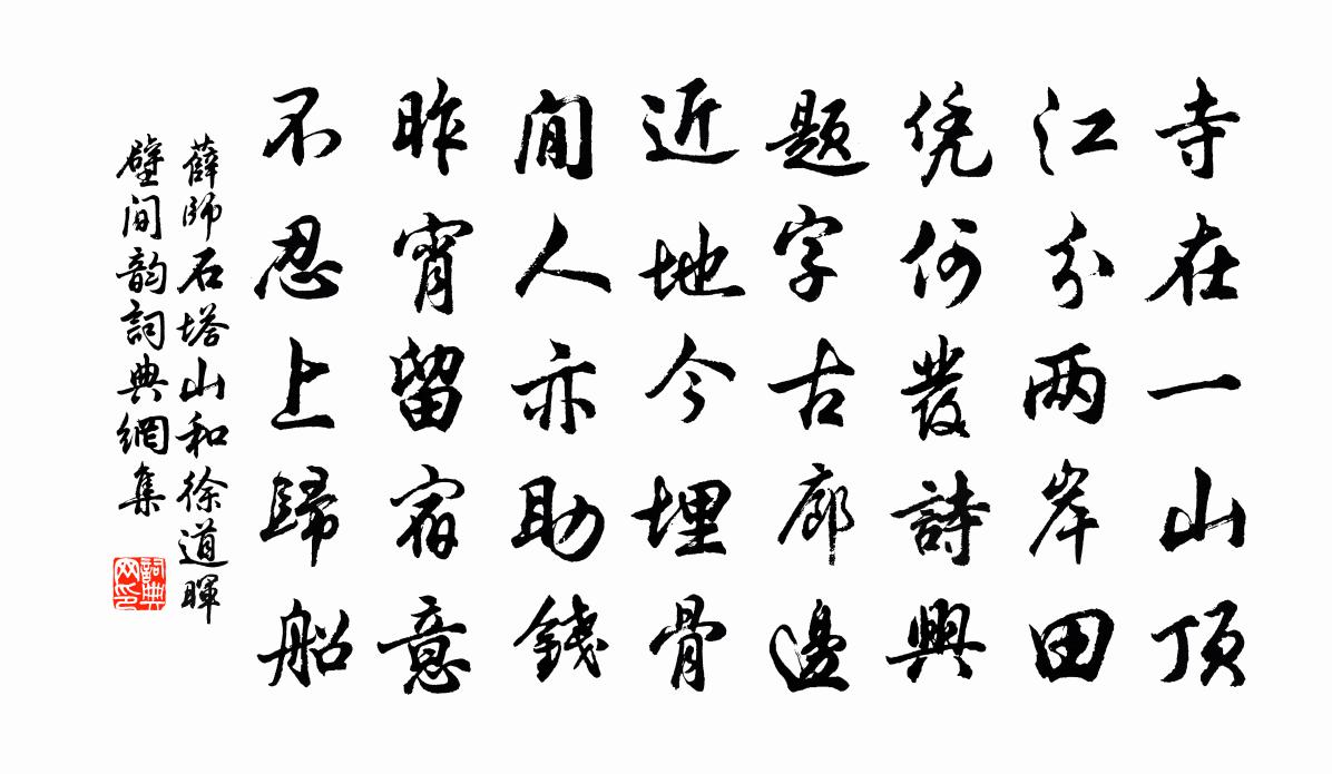詩詞名句歷史字典書法欣賞書法字典國語詞典說文解字康熙字典古漢語字典標 題 作 者 詩 句 塔山和徐道暉壁間韻作者:薛師石 朝代:宋代塔山和徐道暉壁間韻原文寺在一山頂,江分兩岸田。憑何發詩興,題字古廊邊。近地今埋骨,閒人亦助錢。昨宵留宿意,不忍上歸船。詩詞問答問:塔山和徐道暉壁間韻的作者是誰?答:薛師石問:塔山和徐道暉壁間韻寫於哪個朝代?答:宋代薛師石塔山和徐道暉壁間韻書法欣賞塔山和徐道暉壁間韻書法作品詩詞推薦沁園春姚勉〔宋代〕憶昔蓋東坡,秀蓋奪眉山,蓋生丙子年蓋。蓋丙離子坎,四方中氣,宜當此歲,間出英賢。河嶽重靈,星辰再孕,燕雀二首李覯〔宋代〕繡戶珠簾見最頻,暖來寒去但安身。翟公門下時飛入,全勝交情斗頓人。曉泊舟廟山楊萬里〔宋代〕平水長先曉,無風也自濤。煙昏山昜遠,岸潤樹難高。去鷹鳴相報,游魚冷總逃。輕寒容可忍,清眺得辭勞。眼兒媚呂渭老〔宋代〕曉釵催鬢語南風。碧澗小橋通。榆陰短短,露光炯炯,滿地花紅。天涯不見歸帆影,蜂蝶盡西東。宿酲漸解,殘妝儀坤廟樂章員半千〔唐代〕孝享雲畢,維徹有章。雲感玄羽,風淒素商。瞻望神座,祗戀匪遑。禮終樂闋,肅雍鏘鏘。柳橋秋夜陸游〔宋代〕青帝萬里月輪孤,掃盡浮雲一點無。正是吾廬秋好夜,上橋渾不要人扶。青鳥文同〔宋代〕青鳥客館之車軒,前對長江隔層嶂。欹危一逕入林外,竹柵茅檐儼相向。愛其生事亦自足,牛羊縱橫雞犬放。安得滿江紅黃人傑〔宋代〕老子生朝,蕭然坐離騷窟宅。更莫詫、才雄屈宋,詩高劉白。不向鳳凰池上住,不逃鸚鵡洲邊跡。謾一官、如水過清江曲姚勉〔宋代〕夾岸桃花燕子飛,一江春水鱖魚肥。絲綸百尺煙波闊,午夜鳴榔載月歸。扁舟一葉橫沙觜,得魚爛醉東風裡。綠楊和邵觀復見贈黃公度〔宋代〕詩才千丈清且嵬,筆力萬牛挽不回。平生用心有根柢,丱角指南得天才。江西波瀾浩如海,一派流落天南垓。久謂水調歌頭魏了翁〔宋代〕煙雨斂江色,江水大於杯。蓬窗一枕霄夢,忽忽到無懷。苦被江頭新漲,推起天涯倦客,萬里片帆開。收用到我輩淮南遊故居感舊,酬西川李尚書德裕王播〔唐代〕昔年獻賦去江湄,今日行春到卻悲。三徑僅存新竹樹,四鄰惟見舊孫兒。壁間潛認偷光處,川上寧忘結網時。更見送於中丞使北蕃雍陶〔唐代〕朔將引雙旌,山遙磧雪平。經年通國信,計日得蕃情。野次依泉宿,沙中望火行。遠雕秋有力,寒馬夜無聲。看獵元夕後即事王柏〔宋代〕夜來風色作清寒,燈火殘時人意闌。歸路月華猶皎皎,今朝雪影亂漫漫。比他柳絮真無賴,捐盡梅花不忍看。獨坐臨江仙趙長卿〔宋代〕憶昔去年花下飲,團蠻爭看酴醿。酒濃花艷兩相宜。醉中嘗記得,裙帶寫新詩。還是春光驚已暮,此身猶在天涯。李監餉四物各以一絕答之甘蔗方岳〔宋代〕老境於我漸不佳,一生拗性舊秋崖。笑人煮簀何時熟,生啗青青竹一排。有小白馬乘馭多時,奉使東行至稠桑驛,溘然白居易〔唐代〕能驟復能馳,翩翩白馬兒。毛寒一團雪,鬃薄萬條絲。皂蓋春行日,驪駒曉從時。雙旌前獨步,五馬內偏騎。芳草送趙龍圖歸西明釋師範〔宋代〕昔年曾約歸四明,掇缽共飯莆菜羹。東園蔬薺幾衰長,望之何以辜斯盟。鏗鏗小節何足拘,大名當振聲{雄隹換左孺人陳氏輓詞樓鑰〔宋代〕追憶宮端舊典刑,三貞況復是難兄。豈惟門戶生光彩,直使朝廷列姓名。煙海乘桴誰可奪,天風反火報尤明。雖雲木蘭花慢(兩峰插雲)周密〔宋代〕碧尖相對處、向煙外、挹遙岑。記舞鷲啼猿,天香桂子,曾去幽尋。輕陰。易晴易雨,看南峰、淡日北峰雲。雙塔名句推薦機中錦字論長恨,樓上花枝笑獨眠。皇甫冉《春思》 身既死兮神以靈,魂魄毅兮為鬼雄。屈原《國殤》 江山如畫,一時多少豪傑蘇軾《念奴嬌·赤壁懷古》 爾來從軍天漢濱,南山曉雪玉嶙峋。陸游《金錯刀行》 禮者,人道之極也。荀子《荀子·禮論》 醉後涼風起,吹人舞袖回。李白《與夏十二登岳陽樓》 富而不驕,貴而不舒。司馬遷《史記·五帝本紀》 可憐繡戶侯門女,獨臥青燈古佛旁。曹雪芹《紅樓夢·第五回》 愛而知其惡,憎而知其善。戴聖《禮記·曲禮上》 害人之心不可有,防人之心不可無!佚名《增廣賢文·下集》