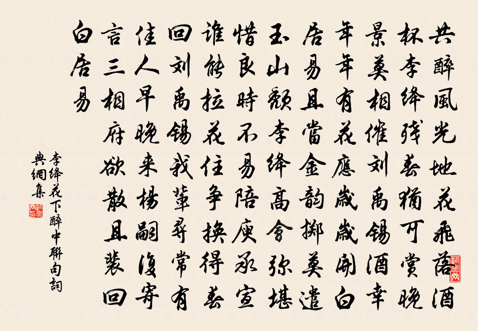 詩詞名句歷史字典書法欣賞書法字典國語詞典說文解字康熙字典古漢語字典標 題 作 者 詩 句 花下醉中聯句作者:李絳 朝代:唐代花下醉中聯句原文共醉風光地,花飛落酒杯。——李絳殘春猶可賞,晚景莫相催。 ——劉禹錫酒幸年年有,花應歲歲開。 ——白居易且當金韻擲,莫遣玉山頹。 ——李絳高會彌堪惜,良時不易陪。 ——庾承宣誰能拉花住,爭換得春回。 ——劉禹錫我輩尋常有,佳人早晚來。 ——楊嗣復寄言三相府,欲散且裴回。 ——白居易詩詞問答問:花下醉中聯句的作者是誰?答:李絳問:花下醉中聯句寫於哪個朝代?答:唐代問:花下醉中聯句是什麼體裁?答:聯句李絳花下醉中聯句書法欣賞花下醉中聯句書法作品注釋全唐詩:卷790-11詩詞推薦送王司直皇甫冉〔唐代〕西塞雲山遠,東風道路長。人心勝潮水,相送過潯陽。寄賢齋張埴〔宋代〕自從一摻去三千,尺宅拋來喜中年。每嘆聖賢風泯矣,可憐母子日蕭然。悠悠蘭老離騷國,渺渺花開陽艷川。九月病中絕句陸游〔宋代〕酒錢自昔從人乞,詩思出門何處無?青篛織蓬菅織席,此生端欲老江湖。送王汲宰藍田歐陽修〔宋代〕喧喧動車馬,共出古都門。落日催行客,東風吹酒◇。樹搖秦甸綠,花入輞川繁。若遇西來旅,時應問故園。賢者之孝二百四十首晉君子林同〔宋代〕何怙復何嘗,銜悲問彼蒼。蒼蒼不可問,重使我心傷。怨王孫·春暮李清照〔宋代〕帝里春晚,重門深院。草綠階前,暮天雁斷。樓上遠信誰傳,恨綿綿。多情自是多沾惹,難拚舍,又是寒食也。秋酬令裕見寄之什李呂〔宋代〕伯才不鼓琴,良為知音撤。淵明琴無弦,荊扉晝常閉。吾道傳滄洲,初不待識別。叔孫志諧俗,禮樂用綿蕝。子陵和韻三和戲示梅堯臣〔宋代〕笭箐畫蛤瓦虹醅,海若淮壖各寄來。將學時人鬥牛飲,還從上客舞娥杯。蓬蒿自有蔣生樂,珠翠寧容鄭氏陪。莫計宿橫山趙汝鐩〔宋代〕頗厭東征道路長,回頭十日離鄉邦。掃愁酌酒雖雲獨,照影抵消燈卻雙。打並余花風動地,遷延殘夜月留窗。店雞七弟示詩後又改緣字為川字因再次韻蘇頌〔宋代〕幽棲新得地,朴飾敢求全。一畝真儒有,三年近道邊。鋤荒還見舊,革陋遂成妍。棟宇依岩畔,煙雲入檻前。人非三奠子王惲〔元代〕悵神光奕奕,天上良宵。花露濕,翠釵翹。風回鸞扇影,愁滿紫雲軺。恨相望,雖一水,隔三橋。朱弦寂寂,心思餞魏州判鵬舉邵桂子〔宋代〕松下吟喔幾唱酬,卻攜螃蟹餞監州。穩挑書擔去環碧,頻寄詩筒來雪舟。畢姓弟兄千里月,故山泉石一天秋。葛峰英宗皇帝輓詞五首王珪〔唐代〕憶昔承君召,春風候禁門。曾陪蕊珠殿,獨賜紫花墩。遼水千年隔,鈞天一夢存。龍髯攀不得,無路可酬恩。哭丘長史張籍〔唐代〕丘公已歿故人稀,欲過街西更訪誰。每到子城東路上,憶君相逐入朝時。吳處士寄香兼勸入道李鹹用〔唐代〕謝寄精專一捻香,勸予朝禮仕虛皇。須知十極皆臣妾,豈止遺生奉混茫。空掛黃衣寧續壽,曾聞玄教在知常。但居苦熱貫休〔唐代〕松桂枝不動,陽烏飛半天。稻麻須結實,沙石欲生煙。毒氣仍乾扇,高枝不立蟬。舊山多積雪,歸去是何年。次程南仲韻五首楊公遠〔宋代〕興來呼酒乏瓷卮,自笑醄醄作么為。細誦坡仙前後賦,更歌元亮去來辭。一心湛徹長如水,兩鬢髼鬆半欲絲。畢竟呈范茂直時在豫章鄭剛中〔宋代〕窗竹悠悠度晚風,濃香醇酒小寒中。玉人尚作桃花色,我輩蒼顏何惜紅。答魏衍惠朱櫻陳師道〔宋代〕開門先得故人書,稍喜提攜起覆盂。得句有誰知我在,嘗新此日賴吾徒。傾籃的皪沾朝露,出袖熒煌得寶珠。會薦午日項安世〔宋代〕一杯聊解獨醒嘩,老眼猶明纏臂花。煮角沈筒隨地俗,賜衣題墨又天涯。千年菖本鬚眉古,九蕊戎葵節纛華。景物名句推薦幾度思歸還把酒,拂雲堆上祝明妃。杜牧《題木蘭廟》 只願君心似我心,定不負相思意。李之儀《卜運算元·我住長江頭》 父兄有善行,子弟學之或不肖王永彬《圍爐夜話·第三三則》 江寒水不流,魚嚼梅花影。釋敬安《題寒江釣雪圖》 懷舊空吟聞笛賦,到鄉翻似爛柯人。劉禹錫《酬樂天揚州初逢席上見贈》 人生如寄,何事辛苦怨斜暉。朱熹《水調歌頭·隱括杜牧之齊山詩》 年年遊子惜余春,春歸不解招遊子。賀鑄《惜余春·急雨收春》 鳳尾森森,龍吟細細。曹雪芹《紅樓夢·第二十六回》 惱他香閣濃睡,撩亂有啼鶯。晏殊《訴衷情·東風楊柳欲青青》 春風依舊。著意隨堤柳。趙令畤《清平樂·春風依舊》