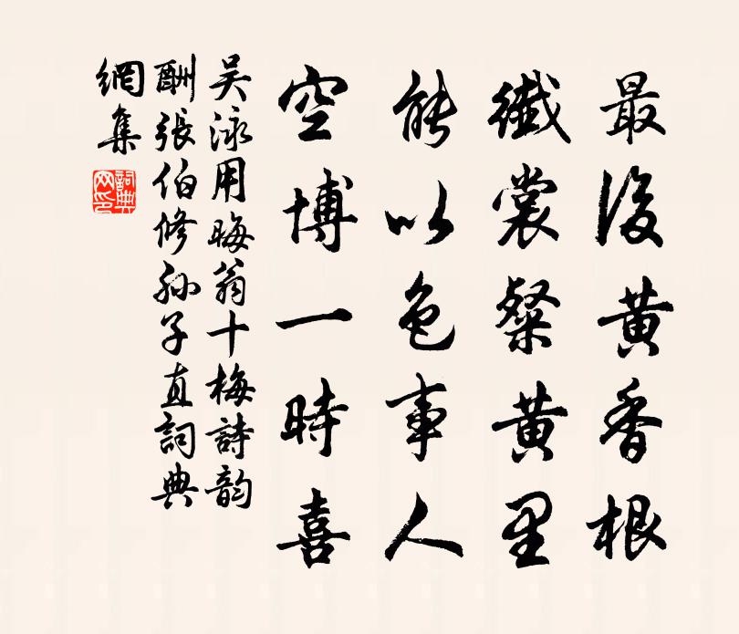 詩詞名句歷史字典書法欣賞書法字典國語詞典說文解字康熙字典古漢語字典標 題 作 者 詩 句 用晦翁十梅詩韻酬張伯修孫子直作者:吳泳 朝代:宋代原文最後黃香根,纖裳粲黃里。能以色事人,空博一時喜。詩詞問答問:《用晦翁十梅詩韻酬張伯修孫子直》的作者是誰?答:吳泳問:該詩寫於哪個朝代?答:宋代書法欣賞用晦翁十梅詩韻酬張伯修孫子直書法作品詩詞推薦和韋相公見示閒臥貫休〔唐代〕刻形求得相,事事未嘗眠。霖雨方為雨,非煙豈是煙。童收庭樹果,風曳案頭箋。仲虺專為誥,何充雅愛禪。靜嫌玉樓春·驚沙獵獵風成陣元好問〔金代〕驚沙獵獵風成陣,白雁一聲霜有信。琵琶腸斷塞門秋,卻望紫台知遠近。深宮桃李無人問,舊愛玉顏今自恨。明妃和答吳斗南中秋見懷並約五子合見過孫應時〔宋代〕歸夢千岩萬壑東,起雪蓑笠喚漁童。塵忙憐我三年久,撥置期群一笑同。只恐令岩詩債急,不愁夜短酒杯空。相攜送祁嶠潁陽主簿司馬光〔宋代〕蒼山臨縣郭,雲木冷蕭騷。人有漁樵樂,官無簿領勞。垂天起膚守,合抱本織毫。志意誠修立,歸飛羽翼高。桂感釋文珦〔宋代〕桂非桃李儔,露冷花始拆。馨香枝可取,欲以寄嘉客。道遠莫能致,徘徊終日夕。別情因物感,千里未嘗隔。贈金勵睡詩二首陳摶〔宋代〕常人無所重,惟睡乃為重。舉世皆為息,魂離神不動。覺來無所知,貪求心愈用。堪笑塵中人,不知夢是夢想。聞百舌鄭剛中〔宋代〕圓吭百舌語千般,豈是春來不耐閒。為見幽人無與語,故來相對作閒關。書景雲軒壁李覯〔宋代〕二江斜入似娥眉,盡日憑高把酒巵。貧賤別應無好處,猛忙中是我閒時。騷詞二章釋善珍〔宋代〕山曇曇兮起雲,山浪浪兮流水。神何為兮山中,豈懷忠兮放棄。沃牛炙兮療飢,挈壺兮荷鍤隨之,生不封侯兮死何餞唐永昌馬懷素〔唐代〕聞君出宰洛陽隅,賓友稱觴餞路衢。別後相思在何處,只應關下望仙鳧。第九十四卷哭棲白供奉林寬〔唐代〕侍輦才難得,三朝有上人。琢詩方到骨,至死不離貧。風帳孤螢入,霜階積葉頻。夕陽門半掩,過此亦無因。叔父惠鉢三首陳師道〔宋代〕聲中得句已忘言,斷酒持齋郤自然。大有西來真的意,飢時著飯飽時懸。哭趙百微少蓬二首劉克莊〔宋代〕長君尤歲輩流稀,君直西垣我北扉。襆被本無桑下戀,聯鞍猶記柳邊歸。錦殘尚足邱遲用,斤妙曾看郢客揮。聞卜睡起章甫〔宋代〕日長睡足傍簾櫳,庭院初收落絮風。葉底櫻桃渾可摘,黃鶯不離綠陰中。六祖大師贊釋如珙〔宋代〕曹溪本無波浪,是他來者激起。日月星辰萬象,總被陸沈,出頭不得。海觀閻蒼舒〔宋代〕雲南之陰大江東,二水奔騰如海沖。誰能具此壯觀眼,南定樓中今臥龍。廬山石鏡鮑溶〔唐代〕東岩採薇人,岩際朝見月。怪墮幽蘿間,非時更澄徹。綠蘿就玉兔,再與高鳥歇。清光照掌中,始悟石上發。誰傳齊天樂 乙未暮,錢素庵見和前韻,再歌以謝邵亨貞〔元代〕柳花飛滿春歸路,隔江暮雲搖影。草暗河橋,塵昏水驛,難覓仙翁丹井。年光漸暝。任老鬢霜雕,壯心灰冷。世故題聽蛙方君詩卷二首劉克莊〔宋代〕湘弦泗磬有遺聲,肯作秋蛩唧唧鳴。同社共推一日長,古人尤重十年兄。放開隻眼饒初祖,蟠屈長身接後生。不是正因法孫命工繪吾幻質炷禮請贊釋普寧〔宋代〕個樣面嘴,陳誰敢擬。威凜凜生,氣憤憤地。臨濟德山,望風敬畏。{外囗內力},和蘇嚕之。名句推薦少年不識愁滋味,愛上層樓。愛上層樓,為賦新詞強說愁。辛棄疾《醜奴兒·書博山道中壁》 聖人之行不同也,或遠或近,或去或不去,歸潔其身而已矣。孟子《孟子·萬章章句上·第七節》 兒女已在眼,眉目略不省。陳師道《示三子》 人間萬事,毫髮常重泰山輕。辛棄疾《水調歌頭·壬子三山被召陳端仁給事飲餞席上作》 三山半落青天外,二水中分白鷺洲李白《登金陵鳳凰台》 舉觴酹先酒,為我驅憂煩。柳宗元《飲酒》 歌舞尊前,繁華鏡里,暗換青青發。薩都剌《念奴嬌·登石頭城次東坡韻》 勸君頻入醉鄉來,此是無愁無恨處。晏幾道《玉樓春·雕鞍好為鶯花住》 不能則學,疑則問戴聖《大戴禮記·曾子制言上第五十四》 罪至重而刑至輕,庸人不知惡矣,亂莫大焉。荀子《荀子·正論》