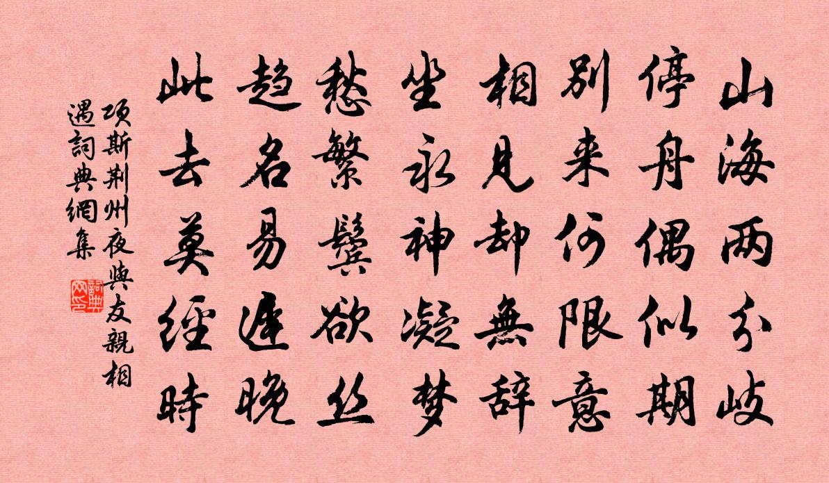 詩詞名句歷史字典書法欣賞書法字典國語詞典說文解字康熙字典古漢語字典標 題 作 者 詩 句 荊州夜與友親相遇作者:項斯 朝代:唐代荊州夜與友親相遇原文山海兩分岐,停舟偶似期。別來何限意,相見卻無辭。坐永神凝夢,愁繁鬢欲絲。趨名易遲晚,此去莫經時。詩詞問答問:荊州夜與友親相遇的作者是誰?答:項斯問:荊州夜與友親相遇寫於哪個朝代?答:唐代問:荊州夜與友親相遇是什麼體裁?答:五律項斯荊州夜與友親相遇書法欣賞荊州夜與友親相遇書法作品注釋全唐詩:卷554-59詩詞推薦偈六十三首釋道寧〔宋代〕乾坤之內,宇宙之中,高懸舜日,大扇堯風。祝一人之壽算,祈萬世之穹隆。唯吾家佛子受賜頗多,物外優遊恁何虞帝司馬光〔宋代〕虞帝老倦勤,蘆禹為天子。豈有復南巡,迢迢渡湘水。至德遠無象,異論紛紛起。意疑大聖人,奸憸亦如己。乃知和張方回西湖二首郭印〔宋代〕叢篁深翳景,草木未知春。晴漏林間日,寒生水上苹。縈紆通邃徑,寂歷遠囂塵。更渡長橋去,無邊物色新。晚泊觀鬥雞梅堯臣〔宋代〕舟子抱雞來,雄雄跱高岸。側行初取勢,俯啄示無憚。先鳴氣益振,奮擊心非愞。勇頸毛逆張,怒自眥裂盰。血流叢菊宋祁〔宋代〕煙開容花密,霜重放叢斜。插著星星畔,潛郎稱晚花。春日佚名〔唐代〕春盡花隨盡,其如自是花。 ——楊女從來湖州舟中趙蕃〔宋代〕平生苕霅又扁舟,尚喜深盟不負鷗。憶昔詩篇渾漫興,只今翻覺費冥搜。漁父詞(其一)佚名〔宋代〕十載江湖不上船。卷篷高臥月明天,今夜泊,杏花灣。只有笭箵當酒錢。延平道中朱槔〔宋代〕一溪春漲午晴初,日透波光綠浸裾。卻憶孤山山下路,石橋清澈看叉魚。蘇幕遮 依託呂洞賓,見董真人遇仙記佚名〔宋代〕日常行,游四海。每日街前,鬧處為乞丐。口口相違化不回。暗損精神,只為凡情昧。苦勸君,生死大。頗奈頑愚阻風項安世〔宋代〕阻風多日飯無羹,病酒中年睡不成。撲面飛蚊來似鴨,閉船吹燭守如城。良朋處處愁分袂,遠客朝朝怕說兵。石首三不歸行蘇轍〔宋代〕客心搖搖若懸旌,三度欲歸歸不成。方春欲歸我自懶,秋冬欲歸事自變。問我欲歸定何時,天公默定人不知。孔公楊昌英示性說次韻為謝周必大〔宋代〕聖學榛蕪欠掃際,誠齋刻意紹淵輿。羊岐自昔迷多徑,雞甕從今識廣居。西洛窮源談近似,南宗投隙說真如。早知賦向宣卿有裕堂堂在伊山桓伊舊隱也胡寅〔宋代〕仕進行所志,退居適吾情。本無顛瞑患,那有得失驚。想彼貪者狼,跋疐不少寧。又哀觴藩羝,兩角掛紫荊。君子陪宴湖州公堂耿湋〔唐代〕謝公為楚郡,坐客是瑤林。文府重門奧,儒源積浪深。壺觴邀薄醉,笙磬發高音。末至才仍短,難隨白雪吟。南歌子(九日次趙季益韻)姚述堯〔宋代〕人在煙雲里,山橫碧落旁。望中縹緲是仙鄉。幸有佳朋、何惜醉斜陽。公子傳杯速,騷人練句忙。悠然此興未能忘長汀煙雨釋智愚〔宋代〕漪漪遠水漾明邊,沙鷺風晴刷羽翰。借使輞川收拾得,江湖莫作畫圖看。和李才甫先輩快閣五首黃庭堅〔宋代〕山寒江冷丹楓落,爭渡行人簇晚沙。菰葉蘋花飛白鳥,一張紅錦夕陽斜。西江月張孝祥〔宋代〕疇昔通家事契,只今兩鎮交承。起居樞密太夫人。綠鬢斑衣相映。乞得神仙九醞,祝教福祿千春。台星直上壽星明戲書圓覺經後辛棄疾〔宋代〕圓覺十二菩薩問,吾取一二餘鄙哉。若是如來真實語,眾生卻自勝如來。名句推薦我住長江頭,君住長江尾。李之儀《卜運算元·我住長江頭》 新妝宜面下朱樓,深鎖春光一院愁。劉禹錫《和樂天春詞 / 春詞》 慷慨惟平生,俯仰獨悲傷。陸機《門有車馬客行》 黃金燃桂盡,壯志逐年衰。孟浩然《秦中感秋寄遠上人 / 秦中寄遠上人》 白日登山望烽火,黃昏飲馬傍交河。李頎《古從軍行》 眾里嫣然通一顧,人間顏色如塵土。王國維《蝶戀花·窈窕燕姬年十五》 擬把疏狂圖一醉,對酒當歌,強樂還無味。柳永《蝶戀花·佇倚危樓風細細》 疏雨池塘見,微風襟袖知。陰陰夏木囀黃鸝賀鑄《南歌子·疏雨池塘見》 尊前只恐傷郎意,閣淚汪汪不敢垂。夏竦《鷓鴣天·鎮日無心掃黛眉》 彭蠡湖天晚,桃花水氣春。白居易《彭蠡湖晚歸》