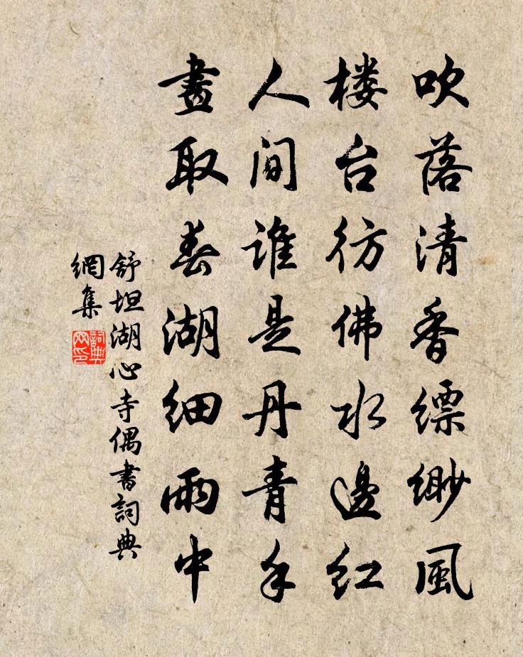 詩詞名句歷史字典書法欣賞書法字典國語詞典說文解字康熙字典古漢語字典標 題 作 者 詩 句 湖心寺偶書作者:舒坦 朝代:宋代湖心寺偶書原文吹落清香縹緲風,樓台彷佛水邊紅。人間誰是丹青手,畫取春湖細雨中。詩詞問答問:湖心寺偶書的作者是誰?答:舒坦問:湖心寺偶書寫於哪個朝代?答:宋代舒坦湖心寺偶書書法欣賞湖心寺偶書書法作品詩詞推薦秋晚游謙上人庵四首張嵲〔宋代〕霜落秋山楓樹紅。茅檐直面列諸峰。上人竟日觀心坐,粥飯遙憑別寺鐘。送天竺僧還鄉釋永頤〔宋代〕月冷雲深天上寺,桂花千樹繞樓台。歸時若對間人說,莫道身從朋里來。示李叔時二首王安石〔宋代〕千山訪我幾摧輈,清坐來看十日留。勢利白頭何足道,古人傾蓋有綢繆。臥病書懷陸游〔宋代〕袞袞年光挽不留,即今已白五分頭。病中對酒猶思醉,夢裡逢人亦說愁。青海戰雲臨賊壘,黑山飛雪灑貂裘。丈夫別謝愛山文天祥〔宋代〕綠綺知音早,青燈對語遲。那知今雨別,又重故人思。山隔詩情遠,雲含客思悲。小樓今夜笛,莫向月中吹。和人見贈四首曹勛〔宋代〕白玉芳醪何所似,仙人掌冷下金盤。青衫漢殿人將老,應酌清醇擬舊歡。謁金門王平子〔宋代〕書一紙。小砑吳箋香細。讀到別來心下事。蹙殘眉上翠。怕落傍人眼底。握向抹胸兒里。針線不忺收拾起。和衣和京中懷歸羅孟郊〔宋代〕一自題名後,思歸何日歸。雖然著宮錦,不及無斑衣。故里桑榆晚,他鄉雨雪霏。庭前停玉軫,目送雁南歸。遍地錦佚名〔宋代〕萊州武觀是吾鄉。因遇先生號長生。穿街柳巷也無妨。不染塵埃性月藥圃司馬光〔宋代〕三蜀膏腴地,偏於藥物宜。小畦千種聚,春雨一番滋。山相慚多識,桐君未偏知。佗年似胡廣,養壽復扶衰。偈頌五首釋了悟〔宋代〕今朝開爐向火,諸方說禪浩浩。靈山一字也無,普請大家證據。題元子故宅文有年〔宋代〕漫郎百事皆漫爾,獨有溪山認作吾。念無一物鎮泉石,生怕偃蹇羞吾徒。靈武中興功掩德,天地大義須人扶。寧將平江道中潘檉〔宋代〕不載圖書載酒杯,姑蘇台下小徘徊。東風不識人心老,擺柳吹花一併來。去婦怨戴叔倫〔唐代〕出戶不敢啼,風悲日淒淒。心知恩義絕,誰忍分明別。下坂車轔轔,畏逢鄉里親。空持床前幔,卻寄家中人。忽辭扈從溫泉同紫微黃門群公泛渭川得齊字蘇頲〔唐代〕虹旗映綠荑,春仗漢豐西。侍蹕浮清渭,揚舲降紫泥。近臨鈞石地,遙指釣璜溪。岸轉帆飛疾,川平棹舉齊。傅舟次韻慎思貽二公誦詩張耒〔宋代〕西城永夜靈鼉鼓,北寺五更青石鐘。九牧何時官事了,三英聊喜故人逢。甲庚定處君無讓,蹀躞歸時我請從。從卻偈頌八十七首釋慧開〔宋代〕熱喝粗拳,佛來也打。臨濟德山,一時擒下。游野航次元應韻三首李流謙〔宋代〕日落未落空明中,琉璃夜色開天容。一江不浣清淨目,百榼能平碨磊胸,神山在前若可到,江妃去不無數重。錦袍夜如年(同前)賀鑄〔宋代〕斜月下,北風前。萬杵千砧搗欲穿。不為搗衣勤不睡,破除今夜夜如年。宿永睦將口香積院滿山皆松檜聲二首張嵲〔宋代〕萬壑樹色斂,松門已暮鍾。故園腸斷客,應與此時同。名句推薦空山新雨後,天氣晚來秋。王維《山居秋暝》 天之生民,非為君也;天之立君,以為民也。荀子《荀子·大略》 壯歲旌旗擁萬夫,錦襜突騎渡江初。辛棄疾《鷓鴣天·有客慨然談功名因追念少年時事戲作》 樓上幾日春寒,簾垂四面,玉闌乾慵倚。李清照《念奴嬌·春情》 凝恨對殘暉,憶君君不知。韋莊《菩薩蠻》 又有牆頭千葉桃,風動落花紅蔌蔌。元稹《連昌宮詞》 桃花洞,瑤台夢,一片春愁誰與共?和凝《天仙子·柳色披衫金縷鳳》 任翠幄張天,柔茵藉地,酒盡未能去。晁補之《摸魚兒·東皋寓居》 茂苑人歸,秦樓燕宿,同惜天涯為旅。吳文英《齊天樂·新煙初試花如夢》 守真志滿,逐物意移。周興嗣《千字文·全文》