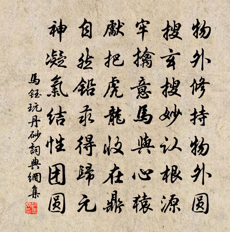 詩詞名句歷史字典書法欣賞書法字典國語詞典說文解字康熙字典古漢語字典標 題 作 者 詩 句 玩丹砂作者:馬鈺 朝代:元代玩丹砂原文物外修持物外圓。搜玄搜妙認根源。牢擒意馬與心猿。先把虎龍收在鼎,自然鉛汞得歸元。神凝氣結性團圓。詩詞問答問:玩丹砂的作者是誰?答:馬鈺問:玩丹砂寫於哪個朝代?答:元代問:玩丹砂是什麼體裁?答:詞馬鈺玩丹砂書法欣賞玩丹砂書法作品詩詞推薦荔枝龍眼二絕劉克莊〔宋代〕食觀本草豈非痴,二果甘滋可養脾。耄智自知無益處,肉身安得有輕時。柳梢青(寄鶴林)葛長庚〔宋代〕鶴使南翔。詞珍翰綺,誼暖情香。如在瓊台,夢回初飲,月液雲漿。風吹蘆葉冥茫。夕照外、山高水長。遙想東樓減字木蘭花王觀〔宋代〕今晨佳宴。昨夜 * 光現。鶴舞青霽,丹鳳呈祥瑞氣飄。仙書來詔。綠鬢朱顏長不老。滿勸香醪。祝壽如雲轉轉登夏州城觀送行人賦得六州胡兒歌李益〔唐代〕六州胡兒六蕃語,十歲騎羊逐沙鼠。沙頭牧馬孤雁飛,漢軍游騎貂錦衣。雲中征戍三千里,今日征行何歲歸。無定次韻雨絲雲鶴二首黃庭堅〔宋代〕煙雲杳靄合中稀,霧雨空濛密更微。園客繭絲抽萬緒,蛛蝥網面罩群飛。風光錯綜天經緯,草木文章帝杼機。願染田居四首秦觀〔宋代〕昔我蒔青秧,廉纖屬梅雨。及茲欲成穗,已復頹星暑。遲暮易昏晨,搖落多砧杵。村迥少過從,客來旋炊黍。興發秋程顥〔宋代〕洗滌炎埃宿雨晴,井梧一葉報秋聲。氣從緹室葭莩起,風向白蘋洲渚生。虛谷志歸十首方回〔宋代〕足欲周寰宇,心終喜故鄉。溪居晨漱潔,山臣暑絺涼。村酒時時醉,園花日日香。高曾先壠在,死即葬其傍。呈孫元素呂祖異〔宋代〕匹馬先來破曉雲,千章喬本翠繽紛。山圍道院窗窗見,泉出丹池處處分。酒好便能澆磈磊,飯香何必御羶葷。明朝安禪峰陳岩〔宋代〕山頭兀坐已忘年,咫尺孤雲兩角天。但有圓明真實在,是身何往不安禪。寶豐倉秋納三首孔武仲〔宋代〕縣闊人饒稼,秋成眾樂租。精粗驗丹白,億萬起錙銖。足趼誰先到,尻高或妄呼。何當寄軍令,供億黑山隅。游賞心亭寄虔州女弟王安石〔宋代〕秀髮千峰霽,清涵萬里秋。滄江天上落,明月鏡中流。眼與魂俱斷,身依影獨留。為憐幽興極,不見爾來游。頌古十四首釋師體〔宋代〕早期心悶三杯酒,午後頭昏一碗茶。入夜脫衣伸腳睡,五更走起眼瞇{左目右麻}。謹和老人秋日遣懷洪咨夔〔宋代〕柴桑青菊舊家風。鄰翁強解人間事,數問牛轓甚日熊。呈嚴造道主簿趙蕃〔宋代〕漫刺不待投,數面自成親。對言或無味,況乃詩筒新。佳處在阿堵,小異果此君。我行蕭灘上,所食楊與陳。百藥雨後早發永寧薛能〔唐代〕春霖朝罷客西東,雨足泥聲路未通。獨愛千峰最高處,一峰初日白雲中。御街行王哲〔元代〕玉芝一味通賢聖。這藥治、真靈性。虛空臼內穩鋪排,金剛杵、*成精瑩。摩訶般若蜜多和,練熟後、搓為鋌。大溪南春曉羅椅〔宋代〕行逢二三月,春映掌中杯。綠久山猶淺,花寒雨未開。誰能奈愁得,拌不上樓來。更莫看雲坐,瀟湘有雁回。奉和御製春台望許景先〔唐代〕睿德在青陽,高居視中縣。秦城連鳳闕,漢寢疏龍殿。文物照光輝,郊畿郁蔥蒨。千門望成錦,八水明如練。復道六月甲申雨後涼氣如秋舒岳祥〔宋代〕蘋花訊息入疏欞,六月何曾有此清。晚飯出門新雨過,深衣臨水早蟬鳴。月西人影如鴻影,風裡松聲帶鶴聲。此意名句推薦玉座猶寂寞,況乃妾身輕。謝朓《同謝諮議詠銅雀台》 秋風生渭水,落葉滿長安。賈島《憶江上吳處士》 箴者,針也,所以攻疾防患,喻針石也。劉勰《文心雕龍·銘箴》 月去疏簾才數尺,烏鵲驚飛,一片傷心白。宋琬《蝶戀花·旅月懷人》 虜騎聞之應膽懾,料知短兵不敢接,車師西門佇獻捷。岑參《走馬川行奉送出師西征 / 走馬川行奉送封大夫出師西征》 時人不識農家苦,將謂田中谷自生。顏仁郁《農家》 兩情若是久長時,又豈在朝朝暮暮。秦觀《鵲橋仙·纖雲弄巧》 一時寵利有盡,千秋青史難欺。張廷玉《明史·列傳·卷一百三十三》 淒涼寶劍篇,羈泊欲窮年。李商隱《風雨》 蜀天常夜雨,江檻已朝晴。杜甫《水檻遣心二首》