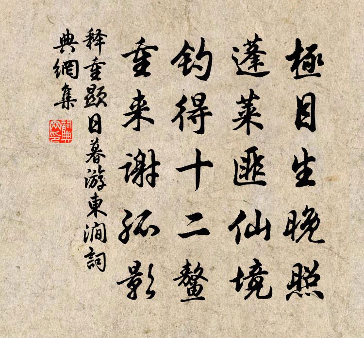 詩詞名句歷史字典書法欣賞書法字典國語詞典說文解字康熙字典古漢語字典標 題 作 者 詩 句 日暮游東澗作者:釋重顯 朝代:宋代日暮游東澗原文極目生晚照,蓬萊匪仙境。釣得十二鰲,重來謝孤影。詩詞問答問:日暮游東澗的作者是誰?答:釋重顯問:日暮游東澗寫於哪個朝代?答:宋代釋重顯日暮游東澗書法欣賞日暮游東澗書法作品詩詞推薦水龍吟(和豐憲題林路鈴梅軸韻)李曾伯〔宋代〕小窗香霧籠蔥,硯寒金井頻呵凍。老坡仙去,新聲猶寄,綠毛么鳳。瘦臉盈盈,不禁﹀︽,雪濃霜重。賴墨池佳致偈頌二十五首釋普岩〔宋代〕近之不遜,遠這則怨。無義無情,可貴可賤。一年一度雪深冤。畢交無人是的傳。早春招張賓客白居易〔唐代〕久雨初晴天氣新,風菸草樹盡欣欣。雖當冷落衰殘日,還有陽和暖活身。池色溶溶藍染水,花光焰焰火燒春。商山山中梅花薛嵎〔宋代〕已有梅花未有詩,青山相對動愁眉。山翁只在山中住,花落花開總不知。送蜀僧得母書歸鄉釋如淨〔宋代〕雁落秋空剝萬金,寥寥一片老婆心。先天后地難回互,風爭恩深冤亦深。招蕭處士白居易〔唐代〕峽內豈無人,所逢非所思。門前亦有客,相對不相知。仰望但云樹,俯顧惟妻兒。寢食起居外,端然無所為。東郊西樓白居易〔唐代〕小郡大江邊,危樓夕照前。青蕪卑濕地,白露深泬寥天。鄉國此時阻,家書何處傳?仍聞陳蔡戍,轉戰已三年。陳表道惠米纜樓鑰〔宋代〕平生所嗜惟湯餅,下箸輒空真雋永。年來風痹忌觸口,厭聞來力敕正整。江西誰將米作纜,捲送銀絲光可鑑。仙禾奉和襲美夏景無事因懷章來二上人次韻陸龜蒙〔唐代〕檐外青陽有二梅,折來堪下凍醪杯。高杉自欲生龍腦,小弁誰能寄鹿胎。麗事肯教饒沈謝,談微何必減宗雷。還聞趙逵明大社四月一日招游西湖十首楊萬里〔宋代〕風撩太液小荷欹,日麗長楊花影低。闌入苑中啼不歇,恨身不及一黃鸝。留守待制視學石介〔宋代〕藝祖與王地,諸侯布教宮。冠纓臨曉集,文雅與時隆。泮水差差綠,春沂習習風。袍輝了衿動,旗映講紗紅。節鉞句劉筠〔宋代〕劉伶醉席梅花地,海客仙槎粉水天。賀聖朝吳潛〔宋代〕捷書夜半甘泉去。報天驕膏斧。摩空銅壘,閘流瞿灩,掃清雲霧。樓蘭飛馘,焉耆授首,謾誇稱前古。須知開慶,題上饒半月岩四絕胡寅〔宋代〕瓊樓玉宇匝天開,織女天孫靜往來。月姊故應羞老退,譴除私館墮岩隈。晚雨陸游〔宋代〕蕭瑟度橫塘,霏微映繚牆。壓低塵不動,灑急土生香。聲入楸梧碎,清分枕簟涼。回頭忽陳跡,檐角掛斜陽。楊梅蘇泂〔宋代〕孫梅過盡官梅在,下番楊梅獨擅場。喚作荔枝元不是,是渠猶著小紅裳。詠史上王昭君陳普〔宋代〕寧胡名號正當時,且有安棲得哺兒。胡草似人空好色,青青合為故閼氏。田翁釋行海〔宋代〕春晴野花喜桑麻,恣縱兒孫斗萬花。頭白縣門猶未識,但聞人說有官家。懷長吉上人北游林逋〔宋代〕青山日已遠,香裓漸多塵。應愛淮流上,聊逢月色新。孤禪安逆旅,警句語誰人。復有傷離客,中林病過春。寄題濟源李少卿園亭司馬光〔宋代〕縣僻人事少,土肥風物殊。杖刊靈壽木,輪里溴梁蒲。竹不減淇水,花仍似洛都。主公眉雪白,遊覽未嘗扶。名句推薦言可省時休便說,步宜留處莫胡行。馮夢龍《醒世恆言·卷十四》 老景蕭條,送君歸去添淒斷。毛滂《燭影搖紅·送會宗》 聞道故林相識多,罷官昨日今如何李頎《送陳章甫》 誰家玉笛暗飛聲,散入春風滿洛城。李白《春夜洛城聞笛 / 春夜洛陽城聞笛》 遠岫出山催薄暮,細風吹雨弄輕陰。李清照《浣溪沙·小院閒窗春色深》 夜月一簾幽夢,春風十里柔情。秦觀《八六子·倚危亭》 十日雨絲風片裡,濃春艷景似殘秋。王士禎《秦淮雜詩二十首·其一》 弓開如秋月行天,箭去似流星落地羅貫中《三國演義·第十六回》 國破山河在,城春草木深。杜甫《春望》 月黑見漁燈,孤光一點螢。查慎行《舟夜書所見》