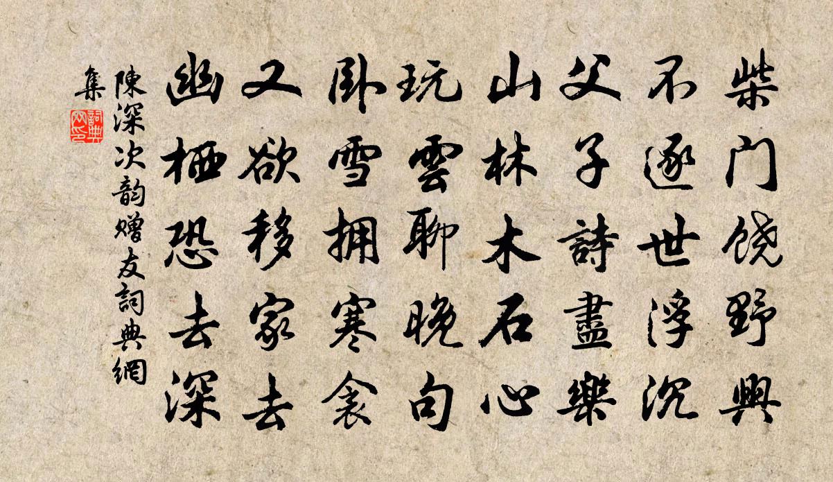 詩詞名句歷史字典書法欣賞書法字典國語詞典說文解字康熙字典古漢語字典標 題 作 者 詩 句 次韻贈友作者:陳深 朝代:宋代次韻贈友原文柴門饒野興,不逐世浮沉。父子詩盡樂,山林木石心。玩雲聊晚句,臥雪擁寒衾。又欲移家去,幽棲恐去深。詩詞問答問:次韻贈友的作者是誰?答:陳深問:次韻贈友寫於哪個朝代?答:宋代陳深次韻贈友書法欣賞次韻贈友書法作品詩詞推薦光孝恭長老寫師像求贊釋正覺〔宋代〕問者不親,傳者不真。默成之性,空照而神。湛存而無像,幽靈而絕鄰。赫爐冶而鑄其器,吹風煙而造其春。建立雲龍歌調陸務觀楊萬里〔宋代〕墨池楊子云,雲間陸士龍。天憎二子巧言語,只遣相別無相逢。長安市上忽再值,向來一別三千歲。王母桃花落幾台中諺佚名〔唐代〕免巡未推,只得自知。錢竹深招泛西湖值雨即事衛宗武〔宋代〕西湖成久別,歲月不可記。竹君秩豆籩,枌友集簪履。放船及中流,煙靄渺無際。宛類太極初,混沌但一氣。浩浩送默然上人歸天台王鎡〔宋代〕孤雲不定心,持缽度寒林。野飯青蒲潔,秋程黃葉深。海風潮水發,山雨曉煙沉。歸到石橋日,應看瀑布吟。鵲橋仙趙善括〔宋代〕東風喚我,西園閒坐,大醉高歌竟日。行 * 依畫欄乾,便忘了、征衫淚濕。亭高煙遠,天低雲近,相對逃名隱客十一月三日過升仙橋作陸游〔宋代〕早過升仙不暇炊,橋邊買餅療朝飢。紛紛滿座誰能識,大似新豐獨酌時。送鄭秀才貢舉權德輿〔唐代〕西笑意如何,知隨貢舉科。吟詩向月露,驅馬出煙蘿。晚色平蕪遠,秋聲候雁多。自憐歸未得,相送一勞歌。和單令簡園梨花四絕胡寅〔宋代〕野老山園未省開,今朝何事客俱來。炎荒有此清涼地,剪水裝林絕點埃。雜曲歌辭築城曲陸龜蒙〔唐代〕城上一掊土,手中千萬杵。築城畏不堅,堅城在何處。莫嘆築城勞,將軍要卻敵。城高功亦高,爾命何處惜。惜舟劉克莊〔宋代〕生世誰令抱百憂,點黃不肯上眉頭。江邊風雨飄蓬箬,愛惜扁舟一夜愁。憶匡一師李商隱〔唐代〕無事經年別遠公,帝城鍾曉憶西峰。爐煙消盡寒燈晦,童子開門雪滿松。記夢鄭獬〔宋代〕赤城老仙翁,面發日月華。獨立石岩下,手把蟠桃花。授我碧簡文,奇篆蟠丹砂。讀之不可曉,翻身凌紫霞。頌古一百二十一首釋宗杲〔宋代〕鐘聲披起郁多羅,碧眼胡兒不奈何。一箭雙鵰隨手落,拈來元是柵中鵝。何主簿蕭齋郎贈詩思家戲和答之黃庭堅〔宋代〕善吟閨怨斷人腸,二妙風流不可當。傅粉未歸啼玉箸,吹笙無伴澀銀篁。睡添鄉夢客床冷,瘦盡腰圍衣帶長。天性旅中思家王炎〔宋代〕野田既雨水皆滿,山路無風花自香。且復將身供世事,也能隨處對春光。絕嫌俗物眼多白,未辦生涯髯已蒼。待看寓陳雜詩十首張耒〔宋代〕我不知暑退,但覺衣汗乾。頗怪庭中天,湛然青已寬。有物叫草根,啾啾自相喧。問知已新秋,大火流金天。九土木蘭花/玉樓春佚名〔宋代〕小桃枝上東風轉。□□草綠江南岸。綠楊學舞小蠻腰,紅藥惜開菩薩面。故鄉何處天涯遠。黃梁夢斷行雲斷。登樓寓寺八首張耒〔宋代〕道人鍾梵久寂寞,倦客弭車聊靜便。我亦云山閒衲子,平生香火舊因緣。偈頌一百三十六首釋惟一〔宋代〕今日上元令節,雨意連綿未歇。過去燃燈如來,全體一時漏泄。檐頭滴滴,分明歷歷。名句推薦還似舊時游上苑,車如流水馬如龍。李煜《憶江南·多少恨》 君子以思患而豫防之。佚名《易傳·象傳下·既濟》 夫有尤物,足以移人左丘明《左傳·昭公·昭公二十八年》 海闊山遙,未知何處是瀟湘柳永《玉蝴蝶·望處雨收雲斷》 柳條折盡花飛盡,借問行人歸不歸?佚名《送別詩》 樓頭客子杪秋後,日落君山元氣中。陳與義《登岳陽樓》 空勞縴手,解佩贈情人。牛希濟《臨江仙·柳帶搖風漢水濱》 洞庭之東江水西,簾旌不動夕陽遲。陳與義《登岳陽樓》 遙知未眠月,鄉思在漁歌。杜荀鶴《送人游吳》 老驥伏櫪,志在千里。曹操《龜雖壽 / 神龜雖壽》