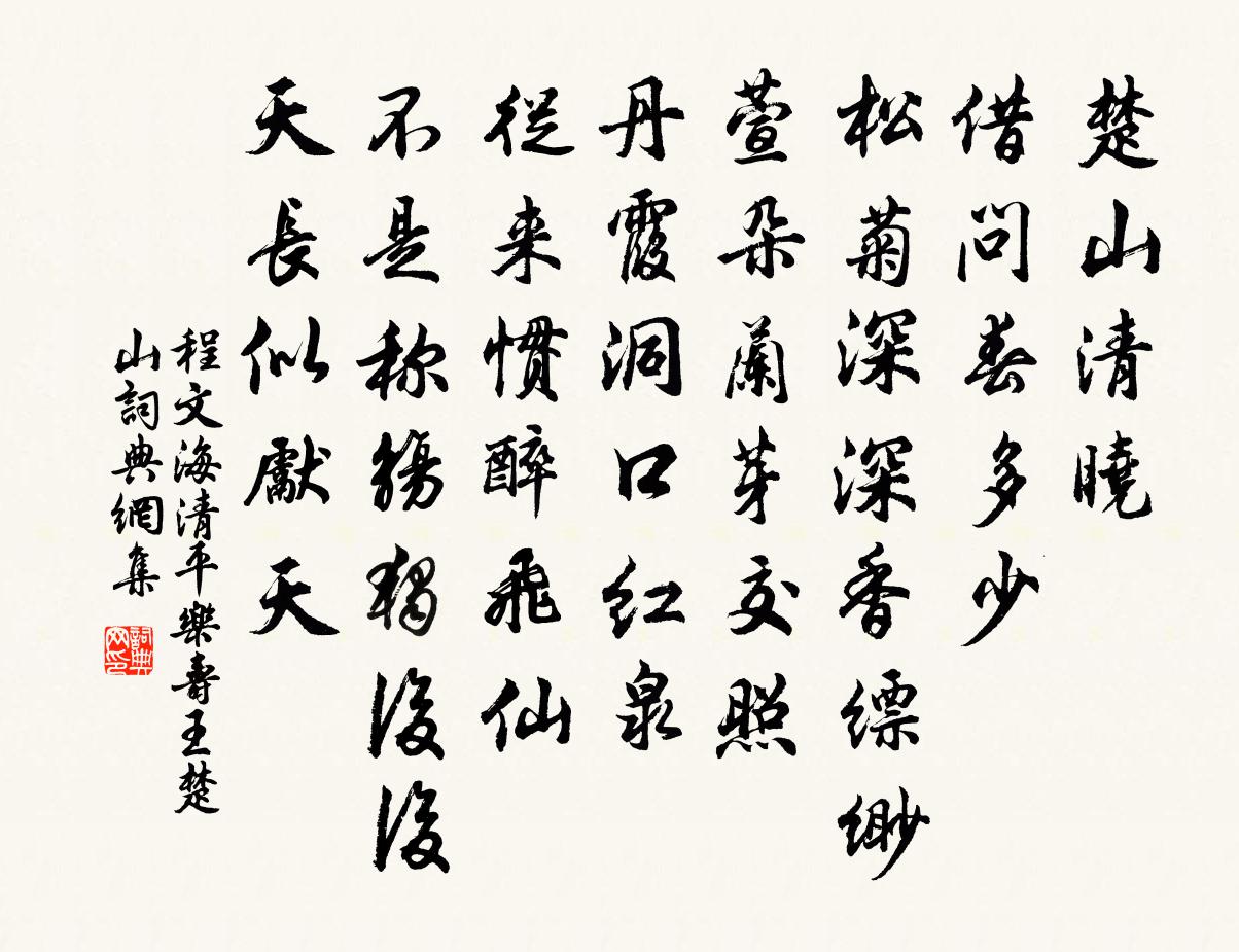 詩詞名句歷史字典書法欣賞書法字典國語詞典說文解字康熙字典古漢語字典標 題 作 者 詩 句 清平樂 壽王楚山作者:程文海 朝代:元代清平樂 壽王楚山原文楚山清曉。借問春多少。松菊深深香縹緲。萱朵蘭芽交照。丹霞洞口紅泉。從來慣醉飛仙。不是稱觴獨後,後天長似先天。詩詞問答問:清平樂 壽王楚山的作者是誰?答:程文海問:清平樂 壽王楚山寫於哪個朝代?答:元代問:清平樂 壽王楚山是什麼體裁?答:詞程文海清平樂 壽王楚山書法欣賞清平樂 壽王楚山書法作品詩詞推薦禽獸昆蟲之孝十首燕雀林同〔宋代〕共母一屋下,寧知屋欲然,不須譏寡智,相哺政堪憐。游嶽麓宮抱黃洞廖行之〔宋代〕長沙不足容迴旋,放腳直到清虛天。層雲盪胸意矯矯,皓月入袖情娟娟。扶搖浩蕩九萬里,城郭仿佛三千年。仙期河冰蘇轍〔宋代〕扁舟多艱虞,與我平日類。初乘滂洋流,旋涉凍淺地。日西陰風作,夜半流澌至。悄然孤寂枕,覺此凝冽氣。河聲圓通大士贊釋慧開〔宋代〕足蹈雙蓮灑楊柳,面目端嚴世希有。梵音妙音海潮音,祗這而今誰動口。夜憶欽止斯遠趙蕃〔宋代〕木葉騷然雨到時,共眠僧榻各喔詩。推移忽已年時事,悵望相看天一涯。別後屢書渾未報,風前小立重想思。人生竹洲見寄次韻汪莘〔宋代〕朱宮苡出鳴,污澤黃鍾屏。古來會通籍,作者能簽整。翁如食橄欖,但願回味永。只今竹洲上,伏臘仰公廩。玩彼玉女搖仙輩王哲〔元代〕終南一遇,醴邑相蓬,兩次凡心蒙滌。便話修持,重談調攝,莫使暗魔偷滴。養氣全神寂。稟消遙自在,閒閒遊歷瑞鷓鴣徐照〔宋代〕雨多庭石上苔文。門外春光老幾分。為把舊書藏寶帶,誤翻殘酒濕綃裙。風頭花片難裝綴,愁里鶯聲怯聽聞。恰似太白招魂崔敦禮〔宋代〕予為謫仙兮,薄遊人間。傲岸不諧兮,世路艱難。折芳洲之瑤華兮,采瓊蕊入乎崑山。愁長安之不見兮,坐拂劍而留題泰山孫復先生新居祖無擇〔宋代〕築室新成日觀前,亂雲重疊稱高眠。人逢捫虱驚旁若,眾望乘駒詠賁然。名理靜談誰捉塵,古書閒校自磨鉛。行聞尹丈少稷舊作借竹軒詩數首如雨重時驚入屋梢趙蕃〔宋代〕離立何妨出屋高,風微亦得聽蕭騷。南山昨夜新雷起,行有橫鞭破土膏。送趙令赴江陵項安世〔宋代〕平生所聯趙景明,太阿出匣百壬死。不令赤手□□□,亦合麻鞋見天子。霜風獵獵鬢毛斑,萬里水縣菰蒲間。妻兒同七兄及崧上人自墳莊還寺張耒〔宋代〕和風快人意,岸幘晚襟涼。日落野痕碧,月生淮際光。論詩得靈運,靜語屬支郎。不是耽閒散,從來懶性長。甲辰婺女道中過重九曾豐〔宋代〕節到重陽日,身為千里人。半痴黃口子,多病白頭親。熟浸菊英嫩,輕挼茱糝勻。旋沽深巷酒,強飲不成春。寄河南鄭侍郎薛能〔唐代〕三峽與三壕,門闌夢去勞。細冰和洛水,初雪灑嵩高。大雅何由接,微榮亦已逃。寒窗不可寐,風地葉蕭騷。滿江紅(中秋日)呂勝己〔宋代〕屈指重陽,有半月、猶零九日。且停待、今宵月上,寶輪飛出。有客最諳閒況味,無人會得真訊息。算何須、抵死梅花張道洽〔宋代〕天下無花白到梅,風前和我不塵埃。堎贈鶴骨霜中立,偃蹇龍身雪裡來。未許瓊花為行輩,定教玉蕊作輿台。夜深白雲歌送劉十六歸山李白〔唐代〕楚山秦山皆白雲,白雲處處長隨君。長隨君,君入楚山里,雲亦隨君渡湘水。湘水上,女蘿衣,白雲堪臥君早歸。禪人並化主寫真求贊釋正覺〔宋代〕靜而不紛,野而不文。丘壑身心麋鹿共,江湖風月白鷗分。寄江東道友章碣〔唐代〕野亭歌罷指西秦,避俗爭名興各新。碧帶黃麻呈縹緲,短竿長線弄因循。夜潮分卷三江月,曉騎齊驅九陌塵。可惜名句推薦當年曾勝賞,生香熏袖,活火分茶。李清照《轉調滿庭芳·芳草池塘》 碧雲無渡碧天沉,是湖心,是儂心。張惠言《江城子·填張春溪西湖竹枝詞》 佳辰強飲食猶寒,隱几蕭條戴鶡冠。杜甫《小寒食舟中作》 話別情多聲欲戰,玉著痕留紅粉面。顧敻《玉樓春·拂水雙飛來去燕》 處所多霜雪,胡風春夏起。蔡琰《悲憤詩》 既熟慣,則更覺親密;既親密,則不免一時有求全之毀,不虞之隙。曹雪芹《紅樓夢·第五回》 晚年唯好靜,萬事不關心。王維《酬張少府》 綠萼添妝融寶炬,縞仙扶醉跨殘虹曹雪芹《詠紅梅花得“紅”字》 秋草六朝寒,花雨空壇。朱彝尊《賣花聲·雨花台》 世事茫茫難自料,春愁黯黯獨成眠。韋應物《寄李儋元錫》