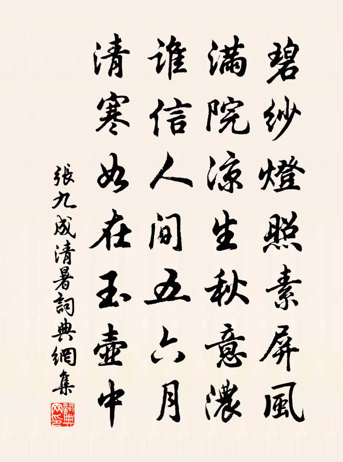 詩詞名句歷史字典書法欣賞書法字典國語詞典說文解字康熙字典古漢語字典標 題 作 者 詩 句 清暑作者:張九成 朝代:宋代清暑原文碧紗燈照素屏風,滿院涼生秋意濃。誰信人間五六月,清寒如在玉壺中。詩詞問答問:清暑的作者是誰?答:張九成問:清暑寫於哪個朝代?答:宋代張九成清暑書法欣賞清暑書法作品詩詞推薦無俗念 景金本溪詞注云,十二首亦名酹江丘處機〔元代〕孤身蹬,泛秦川、西入溪鄉域。曠谷岩前幽澗畔,高*雲龕棲跡。煙火俱無,簞瓢不置,日用何曾積。飢餐渴飲南浦程垓〔宋代〕金鴨懶薰香,向晚來春酲,一枕無緒。濃綠漲瑤窗,東風外、吹盡亂紅飛絮。無言佇立,斷腸惟有流鶯語。碧雲欲建隆以來祀享太廟十六首佚名〔宋代〕木符發瑞,著象成文。於昭大號,協應明君。靈命有屢,鴻禧洞分。歌以升證,休嘉洽聞。華下司空圖〔唐代〕故國春歸未有涯,小欄高檻別人家。五更惆悵回孤枕,猶自殘燈照落花。沁園春侯善淵〔元代〕養浩頤神,離欲澄虛,物外定觀。見玉關傾落,霜千點聚,碧岩漂渺,雪降團團。混內豁然,空中有象,天地相交送崔員外入秦因訪故園岑參〔唐代〕欲謁明光殿,先趨建禮門。仙郎去得意,亞相正承恩。竹里巴山道,花間漢水源。憑將兩行淚,為訪邵平園。次韻子瞻飲道者院池上蘇轍〔宋代〕雨氣涼侵殿,河流滲入池。黃粱淪魚子,白酒瀉鵝兒。風細初生袖,塵清免汗眉。郊行不易得,拂壁看題詩。複次前韻答潛師蘇轍〔宋代〕憐君古木依岩槁,西江飲盡須彌倒。野花幽草亦何為,嶮韻高篇空自惱。萬點浮溪輒長嘆,一枝過嶺仍夸早。拾香題圓覺寺小軒羅椅〔宋代〕禪子安排定了痴,數拳石映半泓池。岩如大廈元生就,水似人心未動時。二月春深梅不覺,五更風起檜先知。青要石雲薛如初〔宋代〕洞府標靈萬古傅,石雲呈瑞始何析。人間欲待為霖雨,但看從龍起碧天。夏日題武功姚主簿朱慶餘〔唐代〕亭午無公事,垂簾樹色間。僧來茶灶動,吏去印床閒。傍竹行尋巷,當門立看山。吟詩老不倦,未省話官班。頌古二十四首釋宗演〔宋代〕入聖超凡既有聲,臥龍誰顧碧潭清。快須鼓浪興雲雨,莫負從前濟物心。食後過竹堂風雨遽作賦所見虞儔〔宋代〕雲氣四菡雷蓄怒,山雨一來風藉助。抱頭乳燕竄低檐,噤口黃鸝在深樹。竹圍萬槊齊驚呼,老松不動如亞夫。何人重送賀鑄〔宋代〕夾岸雪初消,青青見麥苗。傳聲汶陽客,已解木蘭橈。春水生張澤,春風動樂郊。良游知不負,回首念無聊。記夢陸游〔宋代〕夜夢有客短褐袍,示我文章雜詩騷。措辭磊落固力果,浩如怒風駕秋濤。起伏奔蹴何其豪,勢盡東注浮千艘。李白再次滄江頭二首魏了翁〔宋代〕野迥江空雲意閒,清風喚客度東關。摻摻竹柏青垂地,炯炯賓朋玉立山。酒為心知一開口,話逢理到兩舒顏。嘯吟秋雨初霽試筆陸游〔宋代〕墨入紅絲點漆濃,閒將倦筆寫秋容。雨聲已斷時聞滴,雲氣將歸別起峰。斜日半穿臨水竹,好風遙送隔城鍾。遠遊送湯仲能國正以直言去國杜范〔宋代〕朔風剪木末,碩果懸孤危。邈矣冥飛鴻,異哉聞鳴鴟。暮雲結愁陰,送君江之湄。去者挽莫留,留者良自悲。何當挽莊僉判劉宰〔宋代〕宦路推才美,鄉邦敬老成。花封勤政理,蓮幕抑持平。弭棹驚歸夢,支筇話別情。薄輒乖往事,一慟閉佳城。木蘭花慢劉秉忠〔元代〕到閒人閒處,更何必,問窮通。但遣興喔詩,洗心觀易,散步攜筇。浮雲不堪攀慕,看長空、淡淡沒孤鴻。今古漁名句推薦桃未芳菲杏未紅,沖寒先已笑東風。曹雪芹《紅樓夢·第五十回》 山上層層桃李花,雲間煙火是人家。劉禹錫《竹枝詞九首·其九》 人迷洞庭水,雁度瀟湘煙。李白《郢門秋懷》 車轔轔,馬蕭蕭,行人弓箭各在腰。杜甫《兵車行》 想邊鴻孤唳,砌蛩私語。王沂孫《掃花游·秋聲》 有大略者,不可責以捷巧;有小智者,不可任以大功。劉安及其門客《淮南子·主術訓》 過春風十里,盡薺麥青青。姜夔《揚州慢·淮左名都》 利天下者,天下啟之;害天下者,天下閉之。姜子牙《六韜·武韜·發啟》 小山重疊金明滅,鬢雲欲度香腮雪。溫庭筠《菩薩蠻·小山重疊金明滅》 憑觴靜憶去年秋,桐落故溪頭。晏幾道《訴衷情·憑觴靜憶去年秋》