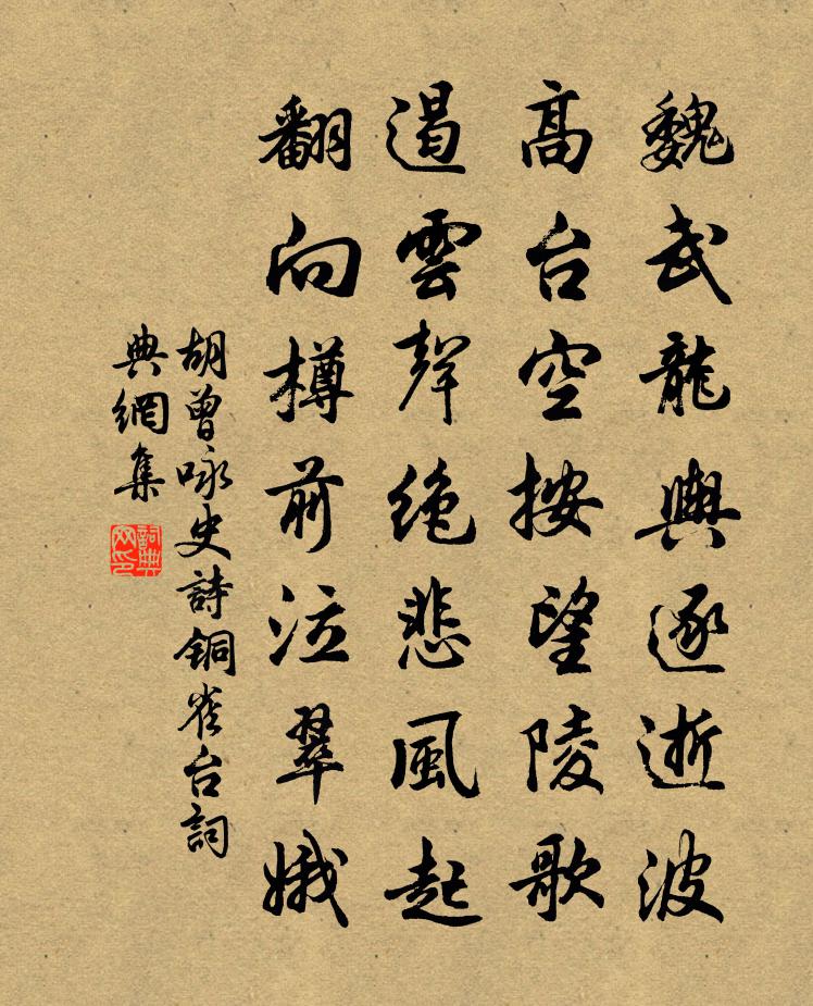 詩詞名句歷史字典書法欣賞書法字典國語詞典說文解字康熙字典古漢語字典標 題 作 者 詩 句 詠史詩銅雀台作者:胡曾 朝代:唐代詠史詩銅雀台原文魏武龍輿逐逝波,高台空按望陵歌。遏雲聲絕悲風起,翻向樽前泣翠娥。詩詞問答問:詠史詩銅雀台的作者是誰?答:胡曾問:詠史詩銅雀台寫於哪個朝代?答:唐代問:詠史詩銅雀台是什麼體裁?答:七絕胡曾詠史詩銅雀台書法欣賞詠史詩銅雀台書法作品注釋全唐詩:卷647-37詩詞推薦戲答白稹丁謂〔宋代〕欺天行當吾何有,立地機關子太乖。五百青蚨兩家闕,白洪崖打赤洪崖。和丹陽徐文度令君劉宰〔宋代〕微生嘆數奇,衰疾久見面。遙聞鄉大夫,今日潘懷縣。列宿羅胸中,可但書萬卷。撫宇究衷曲,誅求無俗見。已多送蘇修撰赴闕四首張載〔宋代〕道大寧容小不同,顓愚何敢與機通。並疆師律三王事,請議成功器業中。十六觀經頌樹觀第四釋遵式〔宋代〕四觀寶樹七重行,寶葉華敷妙宮殿。寶幢幡蓋影重重,十方佛國於中現。水調歌頭(送王景文)李處全〔宋代〕上馬趣攜酒,送客古朱方。秋風斜日山際,低草見牛羊。酩酊不知更漏,但見橫江白露,清映月如霜。平睨廣寒殿和子野見寄十二辰體仇遠〔宋代〕良工鼠須筆,戢戢囊潁露。抄詩節經史,汗牛車載路。信知文中虎,一代人不數。細聲笑蚯蠅,妙趣忘魚兔。東野浪淘沙杜安世〔宋代〕後約無憑。往事堪驚。秋蛩永夜繞床鳴。展轉尋思求好夢,還又難成。愁思若浮雲。消盡重生。佳人何處獨盈盈。和董端明大野漁父圖李彌遜〔宋代〕玉樹瓊田瑩骨清,短篷飄灑動吟情。針換酒,樂昇平。聞道群王日聖明。軾以去歲春夏,侍立邇英,而秋冬之交,子由蘇軾〔宋代〕曈曈日腳曉猶清,細細槐花暖欲零。坐閱諸公半廊廟,時看黃色起天庭。句劉少逸〔宋代〕風遞花香入酒尊。偈頌一百五十首釋心月〔宋代〕髻中珠,只者是。如優曇花,時一現爾。坐斷意根,方能側耳。自寬王禹偁〔宋代〕身世龍鍾且自寬,追量才分合饑寒。朝中舊友休夸貴,篋里新詩不博官。曉發靜梳微霰落,夜琴閒拂古風殘。會須和樂天重題別東樓元稹〔唐代〕山容水態使君知,樓上從容萬狀移。日映文章霞細麗,風驅鱗甲浪參差。鼓催潮戶凌晨擊,笛賽婆官徹夜吹。喚客薛端明挽章三首曹彥約〔宋代〕客本何為者,逢公幕府開。兵間雖有志,度外本非才。流不音何在,高風首屢回。只今岩石望,寧忍泰山頹。尚書汪公得請奉祠餞者十有四人分韻賦某得敢呂祖謙〔宋代〕鼎食味苦濃,藿食味苦淡。同生不同嗜,羊棗與昌歜。孰能游其間。進退兩無憾。尚書古仙伯,雅尚本真澹。禁塗敬贊月林觀禪師陳貴謙〔宋代〕傳得西林夜半長,解將鐵笛逆風吹。重重話墮全擔荷,青出於藍只自知。題珣師休牧軒宗澤〔宋代〕青居曾露一絲頭,謾示人能解牧牛。究竟本來無一物,未知能使阿誰休。雪中登淨遠亭四首楊萬里〔宋代〕忍卻清寒得得來,不堪騎吏苦相催。鴈穿銀 * 中去,人到水晶宮裡回。菩薩蠻舒亶〔宋代〕流年又見風沙送。鈞天回首清都夢。塞雁幾時歸。鏡中雙鬢非。綠袍同冷暖。誰道交情短。愁斛若為量。還隨一線秋霽周密〔宋代〕重到西冷,記芳園載酒,畫船橫笛。水曲芙蓉,渚邊鷗鷺,依依似曾相識。年芳易失。段橋幾換垂楊色。謾自惜。名句推薦想見讀書頭已白,隔溪猿哭瘴溪藤。黃庭堅《寄黃幾復》 秀樾橫塘十里香,水花晚色靜年芳。蔡松年《鷓鴣天·賞荷》 才過斜陽,又是黃昏雨。晏幾道《蝶戀花·笑艷秋蓮生綠浦》 花明玉關雪,葉暖金窗煙。李白《折楊柳》 銜霜當路發,映雪擬寒開。何遜《詠早梅 / 揚州法曹梅花盛開》 與人不求備,檢身若不及佚名《尚書·商書·伊訓》 刷羽同搖漾,一舉還故鄉。沈約《詠湖中雁》 一別都門三改火,天涯踏盡紅塵。蘇軾《臨江仙·送錢穆父》 驚奇喜異者,終無遠大之識;苦節獨行者,要有恆久之操。洪應明《菜根譚·概論》 一日不見,如三月兮。佚名《子衿》