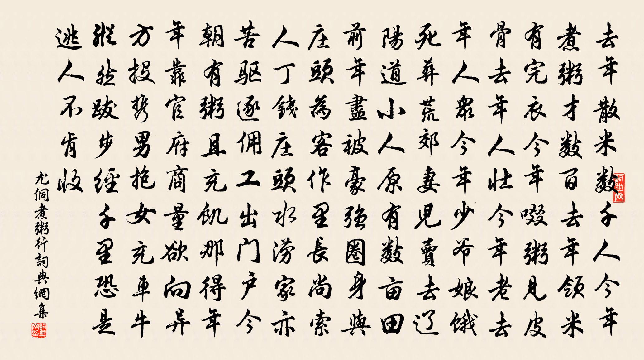 詩詞名句歷史字典書法欣賞書法字典國語詞典說文解字康熙字典古漢語字典標 題 作 者 詩 句 煮粥行作者:尤侗 朝代:清代煮粥行原文去年散米數千人,今年煮粥才數百。去年領米有完衣,今年啜粥見皮骨。去年人壯今年老,去年人眾今年少。爺娘餓死葬荒郊,妻兒賣去遼陽道。小人原有數畝田,前年盡被豪強圈。身與莊頭為客作,里長尚索人丁錢。莊頭水澇家亦苦,驅逐傭工出門戶。今朝有粥且充飢,那得年年靠官府!商量欲向異方投,攜男抱女充車牛。縱然跋步經千里,恐是逃人不肯收。詩詞問答問:煮粥行的作者是誰?答:尤侗問:煮粥行寫於哪個朝代?答:清代尤侗煮粥行書法欣賞煮粥行書法作品詩詞推薦泊白沙渡真山民〔宋代〕日暮片帆落,渡頭生暝煙。與鷗分渚泊,邀月共船眠。燈影漁舟外,湍聲客枕邊。離懷正無奈,況復聽啼鵑。頌古二十首釋了一〔宋代〕禮佛無端撞趙州,卻將知見作冤讐。如今四海平如掌,雲自高飛水自流。雜興十首劉克莊〔宋代〕策免身常佚,登庸貌轉癯。富公忘杖起,迂叟要人扶。西江月譚處端〔元代〕頓悟輪迴入道,時中鍛鍊綿綿。存存損損恁專專。要免將來流轉。火滅蓮開五葉,煙消玉結三田。欲超無上離人天宮詞楊皇后〔宋代〕一朵榴花插鬢鴉,君王長得笑時夸。內家衫子新番出,淺色新裁艾虎紗。禪人並化主寫真求贊釋正覺〔宋代〕看看,變態毫端。春風不泮顛毛雪,秋色自摩眸子寒。笑添面孔兩眉展,參飽肚皮三篾寬。蘇秦以連橫說秦佚名〔先秦〕蘇秦始將連橫說秦惠王曰:“大王之國,西有巴、蜀、漢中之利,北有胡貉、代馬之用,南有巫山、黔中之限,東昆岩林景熙〔宋代〕神斧何年鑿,南山片石盤。玉藏仙笥古,翠落縣門寒。老木天邊瘦,歸雲雨外殘。市塵吹不到,朝夕靜相看。上鄭廣文滕岑〔宋代〕瓦注非真巧,昌歜非眾嗜。我詩本不工,好之弗肯置。胡能致溫飽,頗復作災祟。無鹽不自知,刻畫要妍媚。先生研銘陳與義〔宋代〕無住庵,老居士。紫玉池,娛晚歲。不出庵,書誦偈。誰使之,踐朝市。入承明,司帝制。如眢井,久不治。百尺探春令趙長卿〔宋代〕龜紗隔霧,繡簾鉤月,那時曾見。照影兒、覷了千迴百轉。素艷明於練。柔腸堆滿相思願。更重看幾遍。是天然不和子由初到陳州見寄二首次韻蘇軾〔宋代〕道喪雖雲久,吾猶及老成。如今各衰晚,那更治刑名。懶惰便樗散,疏狂托聖明。阿奴須碌碌,門戶要全生。舊隱遠遊陸游〔宋代〕少年遊宦日,骯髒恥沉浮。見虎猶攘臂,逢狐肯叩頭?力行雖自許,早退豈人謀。小艇煙波上,飄然得遠遊。示蔡天啟三首王安石〔宋代〕蔡子勇成癖,劍可萬人敵。讀書百紙過,穎銳物不隔。開口取將相,志氣方自得。偪仄何偪仄,未見有一獲。蕭條題致堂新州坐石方岳〔宋代〕稜層不隔梅花嶺,萬里相從識兩翁。卻怪牧牛亭下路,石麟咫尺臥秋風。清心鏡 贈京兆周七官馬鈺〔元代〕周官人,家豪富。長安通檢,最為上戶。十年間、興放心何如,無札錐去處。嘆利名,不堅固。使我灰心,轉生開送段屯田分得於字蘇軾〔宋代〕勸農使者古丈夫,不惜春衫踐泥塗。王事靡鹽君甚劬,奉常客卿虬兩須。東武縣令天馬駒,泮宮先生非俗儒。相與千秋歲 即席次可行見壽樂府韻許有壬〔元代〕諛人稱好。何似歸來早。營五畝,如三島。深杯江海淺,老眼乾坤小。松竹在,肯教老圃秋容老。方外多真趣,池葛嶺林景熙〔宋代〕不讀霍光傳,炫會桃李門。湖山變朝市,烽火滿乾坤。膽落冰天騎,魂飛瘴雨村。春風吹秀麥,誤國竟何言。跋游本蘭亭序李大異〔宋代〕真偽紛紛甚得知,風流千古一羲之。山陰勝概今何在,卻有人傳定武碑。名句推薦念月榭攜手,露橋聞笛。周邦彥《蘭陵王·柳》 勸君終日酩酊醉,酒不到劉伶墳上土。李賀《將進酒》 先淡後濃,先疏後親,先遠後近,交友道也。陳繼儒《小窗幽記·集醒篇》 翠娥執手送臨歧,軋軋開朱戶柳永《採蓮令·月華收》 得百姓之力者富,得百姓之死者強,得百姓之譽者榮。荀子《荀子·王霸》 枯楊枯楊爾生稊,我獨七十而孤棲。李白《雉朝飛》 人一能之,己百之。人十能之,己千之。子思《中庸·第二十章》 拔劍擊大荒,日收胡馬群。杜甫《後出塞五首》 誰人背後無人說,哪個人前不說人?佚名《增廣賢文·上集》 深澗飲渴虹,邃河生秋雷。惟鳳《姑射山詩題曾山人壁》