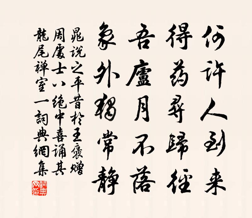 詩詞名句歷史字典書法欣賞書法字典國語詞典說文解字康熙字典古漢語字典標 題 作 者 詩 句 平昔於王褒贈周處士八絕中喜誦其龍尾禪室一作者:晁說之 朝代:宋代原文何許人到來,得藥尋歸徑。吾廬月不落,象外獨常靜。詩詞問答問:《平昔於王褒贈周處士八絕中喜誦其龍尾禪室一》的作者是誰?答:晁說之問:該詩寫於哪個朝代?答:宋代書法欣賞平昔於王褒贈周處士八絕中喜誦其龍尾禪室一書法作品詩文賞析【原題】:平昔於王褒贈周處士八絕中喜誦其龍尾禪室一首今連日行荒山中頗增幽居之興以其句為一詩寄楊中立謝顯道劉壯輿陳叔易同趣歸期也有好事者亦不予鄙·人還虛室靜詩詞推薦和推官壓沙寺惠詩強至〔宋代〕上相行春樂有餘,繡旗朝共宿雲舒。特教紅袖停妍唱,為許朱衫托後車。肯說大烹專鼎食,旋容小摘薦園蔬。多才清風樓上師鼐〔唐代〕清風樓上趙官齋,此日平生眼豁開。放心普通年事[1]遠,不從蔥林帶將來。故公子家葛秋崖〔宋代〕繡戶朱欄柳樹春,外間不識內間貧。白頭園子無支給,自種盆花賣與人。桂子白大監餉酒冰炭方岳〔宋代〕盡雪專為我輩寒,故人亦肯記袁安。麒麟紅作千金真,鸚鵡綠隨雙玉乾。貸米不煩臨古帖,敲門未敢兀吟鞍。明朝壽安水館薛能〔唐代〕地接山林兼有石,天懸星月更無雲。驚鷗上樹滿池水,瀺灂一聲中夜聞。讀漢武帝紀司馬光〔宋代〕方士陳仙術,飄飄意不疑。雲浮仲山鼎,風降壽宮祠。上藥行當就,殊庭庶可期。蓬萊何日返,五利不吾欺。漁家傲引·子月水寒風又烈洪适〔宋代〕子月水寒風又烈。巨魚漏網成虛設。圉圉從它歸丙穴。謀自拙。空歸不管旁人說。昨夜醉眠西浦月。今宵獨釣南溪感事晁說之〔宋代〕短髮猶思沐,修途頗夢歸。不慚為吏拙,但恨讀書非。隴上健兒戍,漁陽突騎圍。誰能圖戰陣,枉是著朝衣。雜曲歌辭。昔昔鹽。水溢芙蓉沼趙嘏〔唐代〕淥沼春光後,青青草色濃。綺羅驚翡翠,暗粉妒芙蓉。雲過窗前見,荷翻鏡里逢。將心托流水,終日渺無從。次仲氏韻孫應時〔宋代〕枵腹貪書頗自強,年來得失正相當。須知耳目塵埃盡,始見山林日月長。題顧正字谿居李昭象〔唐代〕高敞吟軒近釣灣,塵中來似出人間。若教明月休生桂,應得危時共掩關。春酒夜棋難放客,短籬疏竹不遮山。莫夸觀太學釋奠宋祁〔宋代〕鄉盛菁莪選,邦崇奠菜儀。涓辰大昕鼓,持節少牢祠。粉袞瞻凝睟,銀袍豫攝齊。芼羹紛澗沚,郁齊泛尊彝。璧水綠頭鴨 送張仲容過維揚,復之錢結婚,正月宋褧〔元代〕緩搖鞭。銷魂橋上留連。恰春波、鴨頭新綠,倉皇便買吳船。就華堂、溶溶壽酒,作繡陌、草草離筵。傾蓋論交,太乙宮即事王同祖〔宋代〕綠陰密處著危亭,佳氣蔥蔥王武林。一片紅塵飛不入,杜鵑啼處白雲深。水調歌頭(壽曹太守)陳惟哲〔宋代〕近畿賢太守,陸地隱神仙。功高玉記,名通紫府自長年。拂拭壺中光景,遊戲人間風月,富貴本青氈。十載五分牧東陽溪中贈答謝靈運〔南北朝〕可憐誰家婦。緣流洗素足。明月在雲間。迢迢不可得。金剛隨機無盡頌離色離相分第二十釋印肅〔宋代〕色相因緣離,須明真智慧。古鏡復重磨,照天更照地。三月二十五日醵飲於西峰寺分韻得因字陳著〔宋代〕牢穿不借踏青晨,信與林泉有夙因。忙裡偶成真率會,醉來不省亂離身。歸途西嶺何妨晚,吹雨南風正送春。燒筍感興五首次韻和李希孝五晁補之〔宋代〕春半寒未已,今晨天氣清。彈冠適新沐,搔發亦良輕。但愛百鳥樂,復憐一窗明。乾世寧可期,歸耕良近名。與卿寓登多景樓口占立成衛宗武〔宋代〕世稱期樓天下奇,雨余振履此游適。埋頭旅舍氣弗蘇,一見端能洗湮鬱。連岡三面作襟袖,洪流千里在履舄。俯窺名句推薦有眼不識泰山。施耐庵《水滸傳·第二回》 柴門寂寂黍飯馨,山家煙火春雨晴。貫休《春晚書山家屋壁二首》 把酒祝東風,且莫恁、匆匆去。王安石《傷春怨·雨打江南樹》 情同而親合,親合而事生之。姜子牙《六韜·文韜·文師》 可憐繡戶侯門女,獨臥青燈古佛旁。曹雪芹《紅樓夢·第五回》 昔嘆當年無李牧,今知江左有夷吾陳亮《送文子轉漕江東二首》 君子之心事,天青日白,不可使人不知洪應明《菜根譚·概論》 滿腹詩書漫古今,頻年流落易傷心。宇文虛中《在金日作·選二》 五月五日午,贈我一枝艾。文天祥《端午即事》 無錢休入眾,遭難莫尋親。佚名《增廣賢文·上集》