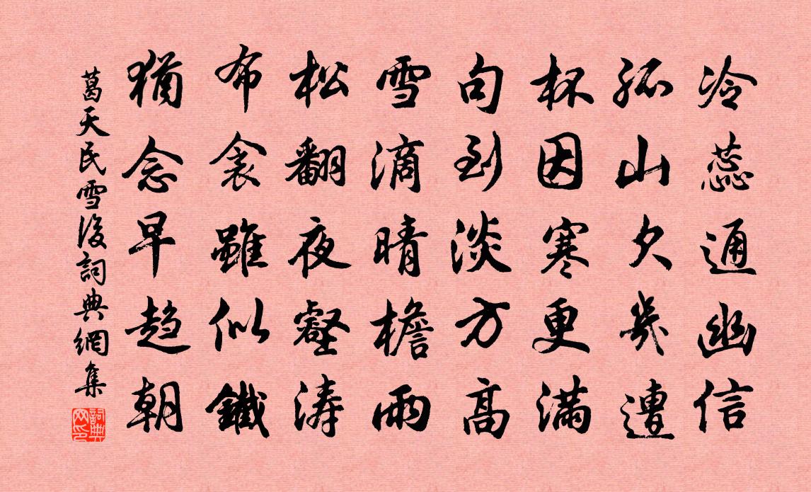 詩詞名句歷史字典書法欣賞書法字典國語詞典說文解字康熙字典古漢語字典標 題 作 者 詩 句 雪後作者:葛天民 朝代:宋代雪後原文冷蕊通幽信,孤山欠幾遭。杯因寒更滿,句到淡方高。雪滴晴檐雨,松翻夜壑濤。布衾雖似鐵,猶念早趨朝。詩詞問答問:雪後的作者是誰?答:葛天民問:雪後寫於哪個朝代?答:宋代葛天民雪後書法欣賞雪後書法作品詩詞推薦尋梅胡仲弓〔宋代〕因探梅花踏曉雲,隔牆時有暗香聞。枝頭才漏春訊息,便帶春愁一二分。王村王安石〔宋代〕晻靄王村路,春風北使旗。塵催輕騎走,寒咽短簫吹。攬轡聯貂帽,投鞭各酒巵。紛紛小兒女,何事倚牆窺。晚秋西省寄上李韓二舍人司空曙〔唐代〕晝漏傳清唱,天恩禁旅秋。雁親承露掌,砧隔曝衣樓。賜膳中人送,餘香侍女收。仍聞勞上直,晚步鳳池頭。和別館即事趙希逢〔宋代〕溪搖日色遠生光,飛絮隨風上下狂。纈間群花連野發,錦添稚筍滿林香。斜陽落盡千山晚,帶月歸來一葦航。老矣桂陽宰胡達信同年見贈三首次韻黃公度〔宋代〕誰能了了學痴兒,身世從教事事違。百不如人甘鷁退,劫來此地看鳶飛。低徊共受微官縛,早晚要須三徑歸。賴有泊楚州鎖外六首張耒〔宋代〕襄王席上舊行雲,二十年間生死分。可惜風流一抔土,年年春草斷人魂。謝別毛仙翁張為〔唐代〕羸形感神藥,削骨生豐肌。蘭炷飄靈煙,妖怪立誅夷。重睹日月光,何報父母慈。黃河濁袞袞,別淚流澌澌。黃河秋日有感羅公升〔宋代〕桂花無主亦清秋,蕎麥為誰先白頭。螢不照身常隱見,鷗燕求世自沈浮。頌古二十四首釋勝〔宋代〕問端如箭透垣牆,賴值靈雲手段長。駿馬蹇驢皆控勒,鞭教戰勝出沙場。寄聖俞歐陽修〔宋代〕西陵山水天下佳,我昔謫官君所嗟。官閒憔悴一病叟,縣古瀟灑如山家。雪消深林自斸筍,人響空山隨摘茶。有時參政大資毗陵張公輓詩十首周麟之〔宋代〕出入紆宸眷,龍光溢帝閽。賜書奎畫爛,分劑寶奩存。尚擬陪三接,俄悲筑九原。遺忠當存報,豈但輟瓜恩。與福上人釋智朋〔宋代〕聞名見面不須論,枉到防風縣外村。強半春光煙雨裹,分明閉卻柏山門。偈頌一百零一首釋慧性〔宋代〕松蘿影裹,積翠堆中。白云為蓋,流泉作琴。隻影獨標岩上月,不知那個是知音。耳卓朔,頭蓬忪,抬眸鷂子過遼寄徐任釋保暹〔宋代〕鄉園書久斷,寒夜起歸心。遠路秦關外,啼猿劍樹深。貧游年暗改,醉臥月空沈。幾夕疏林下,相思廢靜吟。言懷·恨乏平戎策高駢〔唐代〕恨乏平戎策,慚登拜將壇。手持金鉞冷,身掛鐵衣寒。主聖扶持易,恩深報效難。三邊猶未靜,何敢便休官?金竹歌釋文珦〔宋代〕雙檜高亭亭,遙見百里外。恍疑香菸幢,亦若羽葆蓋。秀色何其多,貞心固常在。化龍想非難,坐待風雨會。送謝景初遷憑宰餘姚范仲淹〔宋代〕世德踐甲科,青紫信可拾。故鄉特榮輝,高門復樹立。餘姚二山下,東南最名邑。煙水萬人家,熙熙自翔集。又得御溝新柳馮宿〔唐代〕夾道天渠遠,垂絲御柳新。千條宜向日,萬戶共迎春。輕翠含煙發,微音逐吹頻。靜看思渡口,回望憶江濱。裊裊菩薩蠻(七夕)陳師道〔宋代〕行雲過盡星河爛。爐煙未斷蛛絲滿。想得兩眉顰。停針憶遠人。河橋知有路。不解留郎住。天上隔年期。人間長別夜行自戲六五言晁說之〔宋代〕觸熱褦襶幾許,我生何艱哉。九天星斗初轉,汲井意徘徊。不解鳴珂帝所,踉蹡沒塵埃。為問晚嫁盧姬,一笑為誰名句推薦天涯失鄉路,江外老華發。李白《江南春懷》 記得去年今夕,釃酒溪亭,淡月雲來去。文徵明《念奴嬌·中秋對月》 所謂伊人,在水一方。佚名《蒹葭》 正江令恨別,庾信愁賦劉辰翁《蘭陵王·丙子送春》 知是人家花落盡,菜畦今日蝶來多。高啟《春暮西園》 春風來不遠,只在屋東頭。于謙《除夜太原寒甚》 脈脈廣川流,驅馬歷長洲。上官儀《入朝洛堤步月》 兄弟叔侄,須分多潤寡;長幼內外,宜法肅辭嚴。朱柏廬《朱子家訓·全文》 小荷才露尖尖角,早有蜻蜓立上頭。楊萬里《小池》 前不見古人,後不見來者。陳子昂《登幽州台歌》