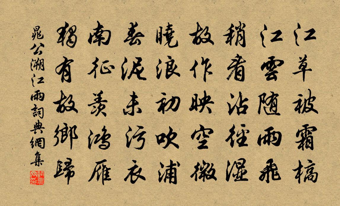 詩詞名句歷史字典書法欣賞書法字典國語詞典說文解字康熙字典古漢語字典標 題 作 者 詩 句 江雨作者:晁公溯 朝代:宋代江雨原文江草被霜槁,江雲隨雨飛。稍看沾徑濕,故作映空微。曉浪初吹浦,春泥未污衣。南征羨鴻雁,獨有故鄉歸。詩詞問答問:江雨的作者是誰?答:晁公溯問:江雨寫於哪個朝代?答:宋代晁公溯江雨書法欣賞江雨書法作品詩詞推薦再和元禮春懷十首黃庭堅〔宋代〕迴腸無奈別愁煎,待得鸞膠續斷弦。最憶錢塘風物苦,西湖月落采菱船。慵庵白玉蟾〔宋代〕絳闕清都舊姓名,此生落魄任天真。橫窗古硯前朝水,掛壁閒琴幾日塵。幽草莫鋤沿日靜,落花不掃襯苔勻。倩風午睡王鎡〔宋代〕枕書午睡正朦朧,雲翠風涼透葛中。喚醒一床蝴蝶夢,虬鴉聲在隔樓東。和無咎二首張耒〔宋代〕年芳經雨能幾許,客愁得暖不肯融。眼看乳燕行已哺,手種小桃隨分紅。世情付睡莫涇渭,物態逢春無異同。清時水調歌頭(游武夷)覃懷高〔宋代〕翠蕤插雲表,初意隔仙凡。臨風據案一見,邂逅似開顏。幾欲拿舟九曲,便擬捫參絕頂,直下俯塵寰。聊此稅吾駕納後夕侍宴徐鉉〔唐代〕天上軒星正,雲開湛露垂。禮容過渭水,宴喜勝瑤池,彩霧籠花燭,升龍肅羽儀,君臣歡樂日,文物盛明時。簾卷和韓子云見寄二首吳芾〔宋代〕投紱歸來意適然,從今免詠式微篇。但令晚歲胸中適,安用虛名身後傳。顧我只宜乘載月,如君端合上凌煙。功成浮生陸游〔宋代〕浮生過六十,百念已頹然;獨有枕書癖,猶同總角年。橫陳糲飯側,朗誦短檠前。不用嘲痴絕,兒曹尚可傳。沁園春(次黃宰韻)洪咨夔〔宋代〕歸去來兮,杜宇聲聲,道不如歸。正新煙百五,雨留酒病,落紅一尺,風妒花期。睡起綠窗,銷殘香篆,手板榰頤彥通叔祖約游雲水寺二首楊萬里〔宋代〕出門天色陰晴半,著雨途間進退難。知得招提在何許,只憑田父指林間。十五夜月色皦然有頃雲生遂不復見陸游〔宋代〕北望但空闊,南望橫群山。青天無翳行素月,寥寥永夜非人間。九醞漿成老仙醉,六銖衣薄天宮寒。翠眉真人不火寄遠(在岐日作)韓偓〔唐代〕眉如半月雲如鬟,梧桐葉落敲井闌。孤燈亭亭公署寒,微霜淒淒客衣單。想美人兮雲一端,夢魂悠悠關山難。空房海棠一夜為風吹盡三首姚勉〔宋代〕翠底紅嬌得幾時,不甘飛動雪胭脂。問天借醒書窗眼,為報東風且慢吹。次韻答璧侍者五首陳造〔宋代〕他日山行不換船,浪花如雪北風顛。而今已苦山行熱,卻辯鳳口寺釋紹嵩〔宋代〕古柏間松篁,山光接水光。園林春婉娩,雲水日相佯。苒苒花明岸,稍稍竹過牆。冥搜得詩窟,台館曉蒼蒼。浣溪沙·二月和風到碧城晏幾道〔宋代〕二月和風到碧城。萬條千縷綠相迎。舞煙眠雨過清明。妝鏡巧眉偷葉樣,歌樓妍曲借枝名。晚秋霜霰莫無情。梨花阮南溪〔宋代〕繽紛紫雪浮須細,冷淡清姿奪玉光。剛笑何郎曾傅粉,絕憐荀令愛薰香。唐鐃歌鼓吹曲十二篇。李靖滅吐谷渾西海上為吐谷渾第十柳宗元〔唐代〕吐谷渾盛強,背西海以夸。歲侵擾我疆,退匿險且遐。帝謂神武師,往征靖皇家。烈烈旆其旗,熊虎雜龍蛇。王旅劉十秀才見過尋以為寄次韻和酬梅堯臣〔宋代〕放言破崖岸,塵事盡磨刮。況此氣澄明,幽襟亦軒豁。竟日坐衡茅,同心異胡越。吾道今不孤,長吟為君發。【商調】集賢賓北杜仁傑〔元代〕七夕暑才消大火即漸西,斗柄往坎宮移。一葉梧桐飄墜,萬方秋意皆知。暮雲閒聒聒蟬鳴,晚風輕點點螢飛。天階名句推薦秋霜切玉劍,落日明珠袍李白《白馬篇》 庭下如積水空明,水中藻、荇交橫,蓋竹柏影也。蘇軾《記承天寺夜遊 / 記承天夜遊》 君自故鄉來,應知故鄉事。王維《雜詩三首·其二》 垂死病中驚坐起,暗風吹雨入寒窗元稹《聞樂天授江州司馬》 精衛銜微木,將以填滄海。陶淵明《讀山海經·其十》 朝聞道,夕死可矣。孔子弟子《論語·里仁篇》 詩家清景在新春,綠柳才黃半未勻。楊巨源《城東早春》 得眾而不得其心,則與獨行者同實。管仲《管子·參患》 恰似春風相欺得,夜來吹折數枝花。杜甫《絕句漫興九首·其二》 予若洞庭葉,隨波送逐臣。李白《送郄昂謫巴中》