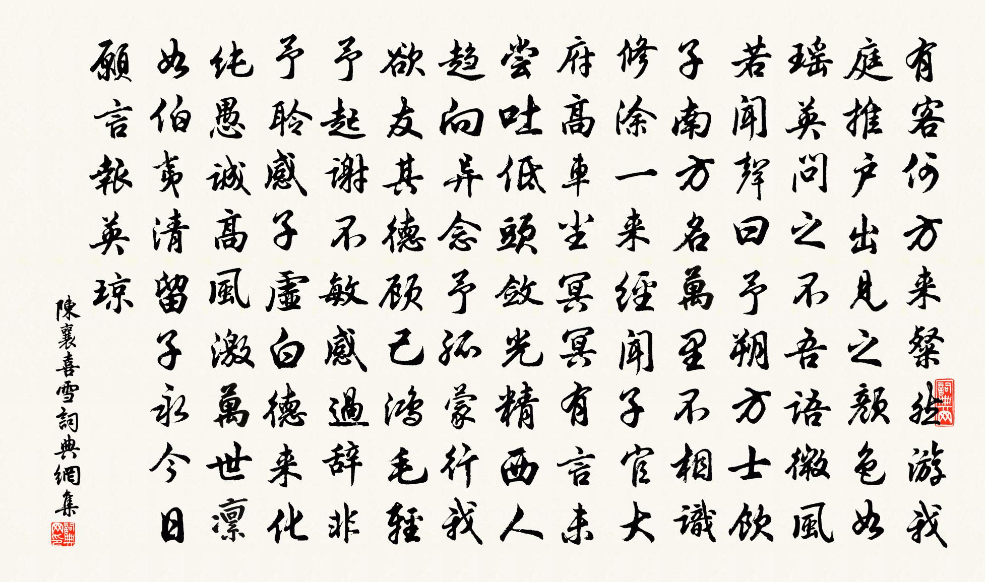 詩詞名句歷史字典書法欣賞書法字典國語詞典說文解字康熙字典古漢語字典標 題 作 者 詩 句 喜雪作者:陳襄 朝代:宋代喜雪原文有客何方來,粲然游我庭。推戶出見之,顏色如瑤英。問之不吾語,微風若聞聲。曰予朔方士,飲子南方名。萬里不相識,修塗一來經。聞子官大府,高車塵冥冥。有言未嘗吐,低頭斂光精。西人趨向異,念予孤蒙行。我欲友其德,顧己鴻毛輕。予起謝不敏感,過辭非予聆。感子虛白德,來化純愚誠。高風激萬世,凜如伯夷清。留子永今日,願言報英瓊。詩詞問答問:喜雪的作者是誰?答:陳襄問:喜雪寫於哪個朝代?答:宋代陳襄喜雪書法欣賞喜雪書法作品詩詞推薦過溫尚書舊庄白居易〔唐代〕白石清泉拋濟口,碧幢紅旆照河陽。村人都不知時事,猶自呼為處士莊。贈應天寺昭淨法華杜衍〔宋代〕出俗皆言為息機,性靈淨僻似師稀。前山月落夜吟罷,深院菊荒秋講歸。谿霧鎖窗燈焰短,雪風敲竹磬聲微。會期偈頌七十二首釋祖欽〔宋代〕玄路絕時分鳥道,見聞泯處涉功勳。何如只麽閒閒地,月浸冰壺夜不痕。寄令狐賓客張籍〔唐代〕勛名盡得國家傳,退狎琴僧與酒仙。還帶郡符經幾處,暫辭台座已三年。留司未到龍樓下,拜表長懷玉案前。秋日如吳興舟中讀白樂天詩有作張嵲〔宋代〕離離雲樹泛朝艤,十月江南未變衰。縱櫂千尋霅溪水,散懷一卷樂天詩。平生名宦休回顧,隨分追游且自欺。不敢秋夜坐釋遇臻〔宋代〕秋庭肅肅風颾颾,寒星列空蟾魄高。搘頤靜坐神不勞,鳥窠無端吹布毛。孤山林景熙〔宋代〕回首鹹平夢,清風自滿湖。乾坤一士隱,身世此山孤。鶴去空秋影,梅開尚舊株。耳孫今白髮,持酒酹寒蕪。發永豐道中李處權〔宋代〕雲斷山如拭,秋明水劇虛。濕煙蒙翠竹,瞑雨濯紅蕖。茅舍真淳俗,瓷甖窈窕沽。何須訪摩詰,便是輞川圖。宿城外張氏莊早起入三首楊萬里〔宋代〕眠雲跂石十餘年,回首拋官一瞬間。送舊迎新也辛苦,一番辛苦兩年閒。過蘭溪楊時〔宋代〕紛紛朝市競秋毫,江上霜風正怒號。不問揚瀾與彭浪,翩然東下日千艘。感遇岑參〔唐代〕北山有芳杜,靡靡花正發。未及得采之,秋風忽吹殺。君不見拂雲百丈青松柯,縱使秋風無奈何。四時常作青黛色宮詞張公庠〔宋代〕綺袖時宜不甚寬,自拈刀尺勘雙鸞。錦茵拂掠春宵靜,怯見飛蛾傍燭盤。滿庭芳周必大〔宋代〕之語,戲往一闋以解嘲天壤茫茫,人心殊觀,未免因欠思余。太山邱垤,同載一方輿。那更長沙下濕,祝融峰、才黃陵題詠二首林采〔宋代〕地接熊湘尾,天開龍壽山。精藍依石峽,遠岫點菸鬟。青草渺茫外,黃陵顧盼間。攀緣尋古蹟,足倦不知還。題司空圖壁盧攜〔唐代〕姓氏司空貴,官班御史卑。老夫如且在,不用嘆屯奇。寄張文彥王洋〔宋代〕掃葉林間一夢回,別來秋物已驚催。書通意外殷勤語,詩寄閒中氣味來。花木成陰如結幄,庭除自轉不蠲埃。俱生寄茶與平甫王安石〔宋代〕碧月團團墮九天,封題寄與洛中仙。石樓試水宜頻啜,金谷看花莫漫煎。雨霖鈴·寒蟬淒切柳永〔宋代〕寒蟬淒切,對長亭晚,驟雨初歇。都門帳飲無緒,留戀處,蘭舟催發。執手相看淚眼,竟無語凝噎。念去去,千里且游白居易〔唐代〕手裡一杯滿,心中百事休。春應唯仰醉,老更不禁愁。弄水回船尾,尋花信馬頭。眼看筋力減,游得且須游。再次寄肯堂韻五首陳造〔宋代〕眼向朱門每懶抬,今朝笑口為君開。別來卻喜人爭席,浪遣長須掃徑苔。名句推薦漢月垂鄉淚,胡沙費馬蹄。岑參《磧西頭送李判官入京》 葉開隨足影,花多助重條。陰鏗《雪裡梅花詩》 淇園春竹美,軍宴日椎牛。司馬光《送龔章判官之衛州·新及第》 長相思,長相思。晏幾道《長相思·長相思》 菊暗荷枯一夜霜。新苞綠葉照林光。蘇軾《浣溪沙·詠橘》 顧此耿耿存,仰視浮雲白。文天祥《正氣歌》 天長雁影稀,月落山容瘦,冷清清暮秋時候。盧摯《沉醉東風·重九》 馬行無力皆因瘦,人不風流只為貧。佚名《增廣賢文·上集》 揚雲霓之晻藹兮,鳴玉鸞之啾啾。屈原《離騷》 野戰格鬥死,敗馬號鳴向天悲。李白《戰城南》