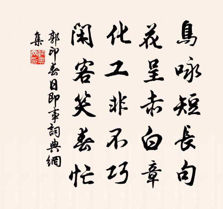 詩詞名句歷史字典書法欣賞書法字典國語詞典說文解字康熙字典古漢語字典標 題 作 者 詩 句 春日即事作者:郭印 朝代:宋代春日即事原文鳥詠短長句,花呈赤白章。化工非不巧,閒客笑春忙。詩詞問答問:春日即事的作者是誰?答:郭印問:春日即事寫於哪個朝代?答:宋代郭印春日即事書法欣賞春日即事書法作品詩詞推薦次韻陳叔易蘆橋二首晃沖之〔宋代〕橋闊狹如馬,蘆高低似人。白苹洲上客,枉恨洞庭春。春詠雍陶〔唐代〕風惱花枝不耐頻,等閒飛落易愁人。殷勤最是章台柳,一樹千條管帶春。感皇恩(旅思)陸蘊〔宋代〕殘角兩三聲,催登古道。遠水長山又重到。水聲山色,看盡輪蹄昏曉。風頭日腳下,人空老。匹馬舊時,西征談笑淳熙八年春帖子詞太上皇帝合六首崔敦詩〔宋代〕翠管吹寒去,青旗卷仗來。慈皇千萬壽,春日上春杯。沁園春 嘲昆季析居凌雲翰〔元代〕樹上凌霄,堂前紫荊,秋來尚芳。柰牝雞晨語,**憔悴,妖狐晝嘯,鴻雁分張。仁智匪周,喜憂非舜,一旦天倫道上王遂〔宋代〕夾道香菸笑語歡,老翁扶立小兒觀。書生未有絲毫毫力,定憶前回去長官。滴翠樓蕭之敏〔宋代〕我愛東坡句法乃,治平雙澗昔經游。曾吟滴翠衣裘濕,請借佳名榜畫樓。慶元二年皇后冊寶十三首佚名〔宋代〕象服之文,鵲巢之風。化以婦道,以於內宮。采蘋潤演,采藻間中。夙夜在公,贊彼累功。微子廟祖無擇〔宋代〕億兆夷人因 * ,惟君先見得良圖。為仁始欲扶商祚,去國終能啟宋都,鈇鑕豈甘因諫死,髠鉗仍免作官奴。千年送人往虔州劉商〔唐代〕莫嘆乘軺道路賒,高樓日日望還家。人到南康皆下淚,唯君笑向此中花。【商調】梧葉兒_春日郊行長張可久〔元代〕春日郊行長空雁,老樹鴉,離思滿煙沙。墨淡淡王維畫。柳疏疏陶令家,春脈脈武陵花,何處遊人駐馬?探梅即事寄陳叔進吳芾〔宋代〕鄉裡衣冠久不振,後來猶喜有斯人。曾為蓬島神仙主,端是儲闈羽翼臣。大節已觀能直己,小淹何惜且臨民。君家杯泉董嗣杲〔宋代〕古甃澄泓照膽清,畫龍壁上掛瓢輕。汲來不療相如渴,掬處難供太白傾。傍屋四圍埋石色,侵山一溜走溪聲。缽盂曲遊春(清明湖上)施岳〔宋代〕畫舸西泠路,占柳陰花影,芳意如織。小楫衝波,度麴塵扇底,粉香簾隙。岸轉斜陽隔。又過盡、別船簫笛。傍斷摸魚兒(春暮)劉辰翁〔宋代〕渺斜陽、村菸酒市,獨教王謝如此。漁翁夢入江頭絮,寂寂平安西子。東風起。東風起。種桃千樹皆流水。橋邊萬舉子蘇泂〔宋代〕先親去無歸,家有十男子。春秋此堂上,拜起共祭祀。一貧乃青氈,書種幸未已。人言抱子晚,君已三十四。何時和謝孟彝秘丞館中書懷程公許〔宋代〕虎頭一生信痴絕,虛名誤人可多竊。蕭速白髮寧可貸,流浪紅塵幾時歇。三神山夐隔囂紛,眾君子聚瑩冰雪。塵犀次韻林褎然知縣留題筠莊因寄之二首李彌遜〔宋代〕何人著腳傍岩幽,好事無過竹務猷。妙語徑追盤谷序,輕舟獨信剡溪流。牛刀小試知多暇,鶴板遲來坐不謀。欲寄送曾雲巢被召羅茂良〔宋代〕泰華山人上赤墀,上嗟安在見何遲。老於尚父投竿日,少似轅生對策時。怨鶴驚猿辭舊隱,鞭鸞笞鳳總新知。早陳西河吳潛〔宋代〕都會地。東南盛府堪記。蓬萊縹緲十洲中,雉城擁起。憑高一盼大江橫,遙連滄海無際。壁同眾山翠倚。赤龍、白名句推薦來時父母知隔生,重著衣裳如送死。王建《渡遼水》 十日春寒不出門,不知江柳已搖村。蘇軾《正月二十日往岐亭郡人潘古郭三人送余於女王城東禪莊院》 卷旗夜劫單于帳,亂斫胡兒缺寶刀。馬戴《出塞詞》 浮雲遮月不分明,誰挽長江一洗放天青?董士錫《虞美人·韶華爭肯偎人住》 編草結庵,不違涼暑。蕭子顯《南齊書·列傳·卷四十》 白鳥明邊帆影直。隔江聞夜笛。周密《聞鵲喜·吳山觀濤》 何人解賞西湖好,佳景無時。歐陽修《採桑子·何人解賞西湖好》 月照城頭烏半飛,霜淒萬樹風入衣。李頎《琴歌》 子胥既棄吳江上,屈原終投湘水濱。李白《行路難三首》 牛靿咤咤,田確確,旱塊敲牛蹄趵趵。元稹《田家詞 / 田家行》